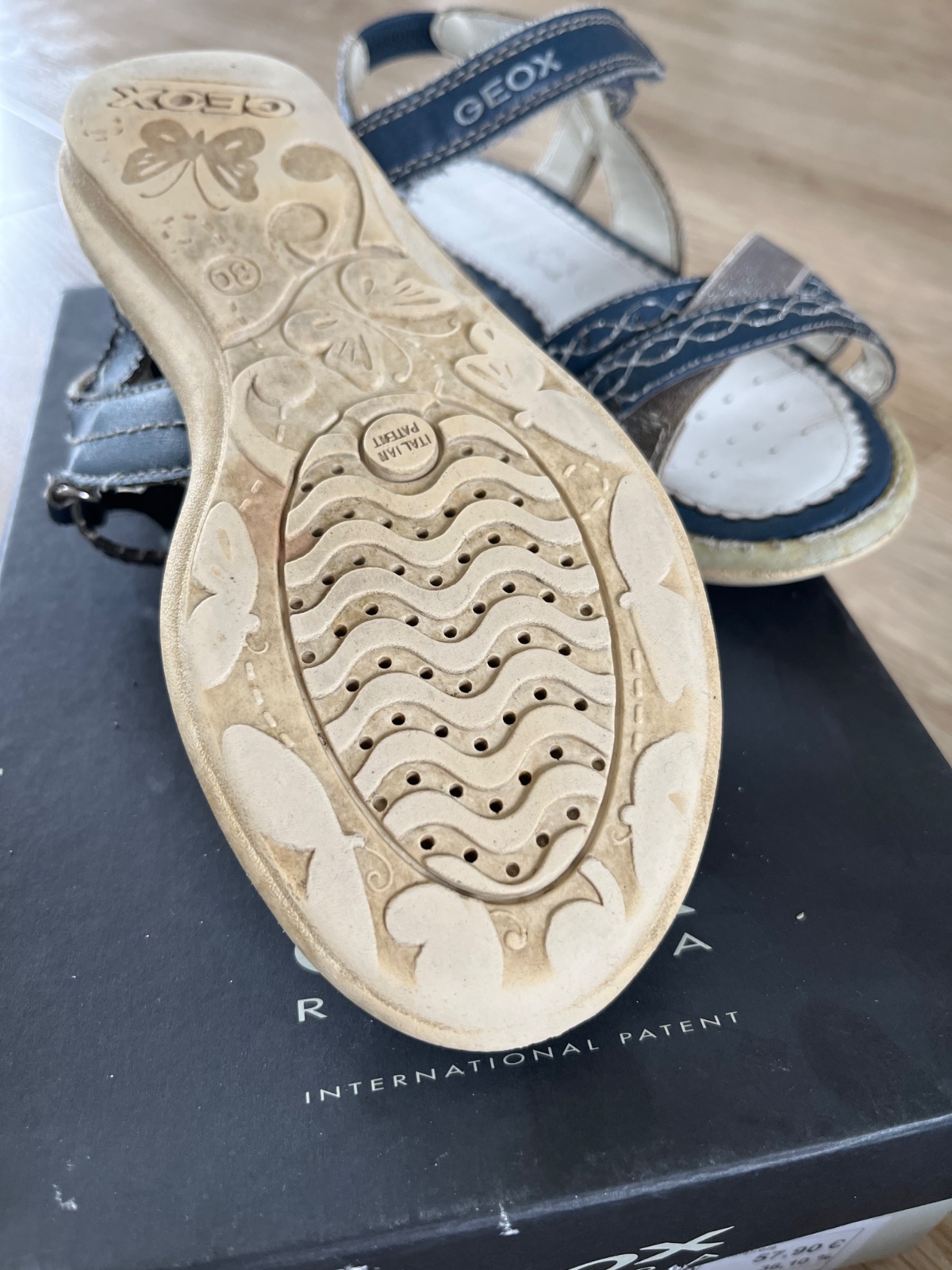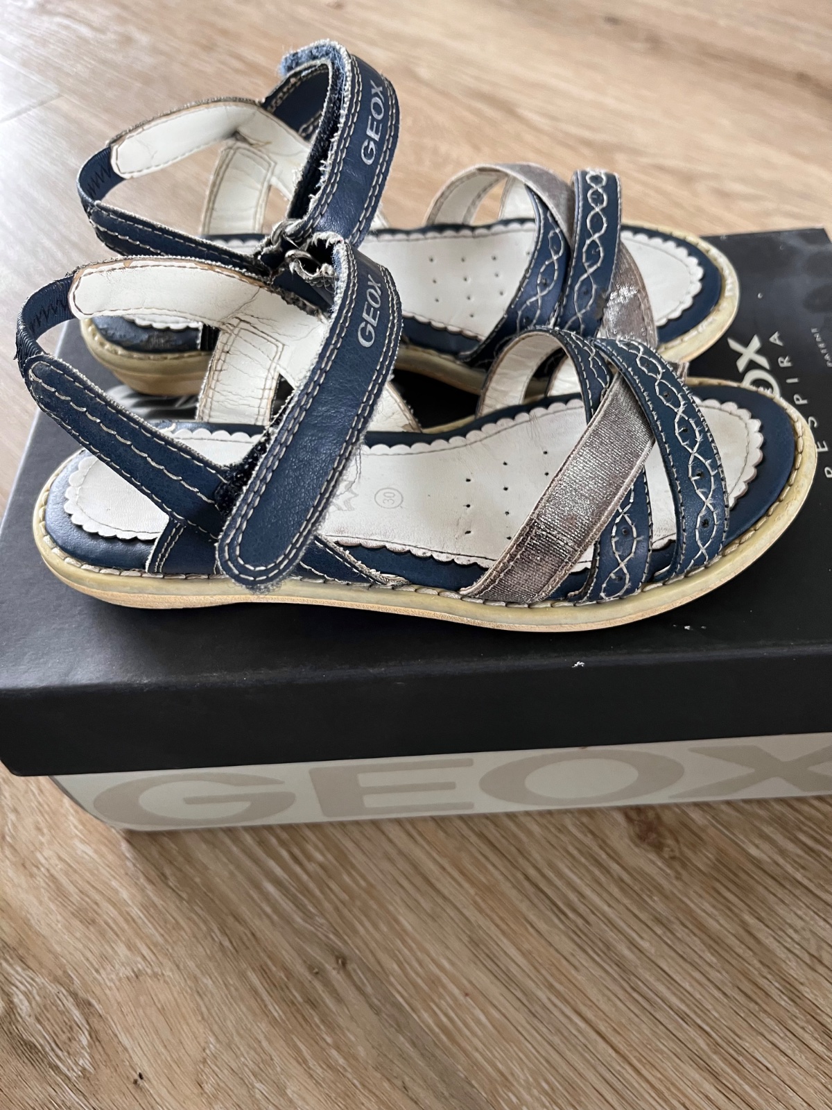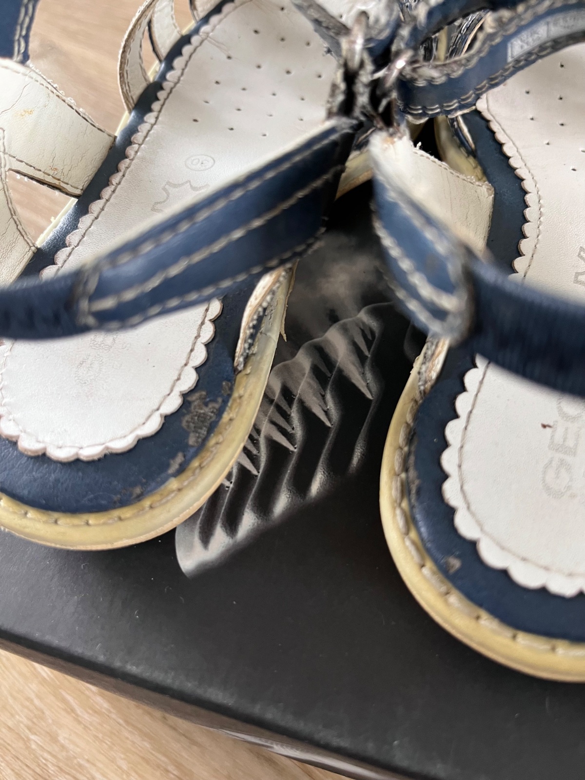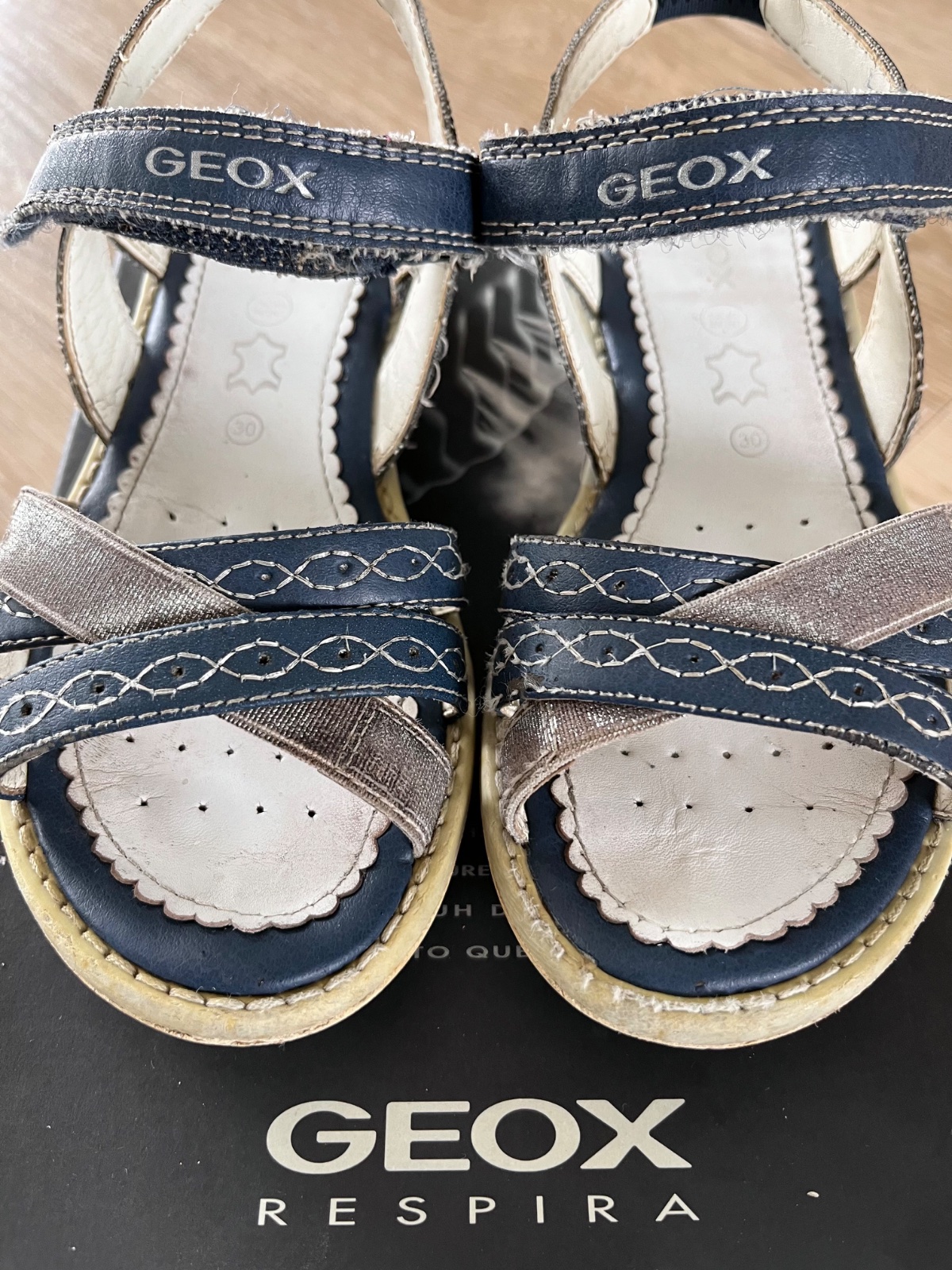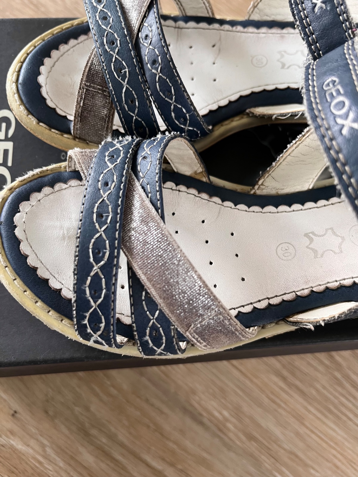 Sandálky Geox. Kúpené druhej dcérke. Veľkosť skôr 29, keďže geoxky sú menšie. Na suchý zips. Kožená stielka. Mierne ošúchaný kúsok stielky, viď foto. Ten strieborný pásik je pružný.