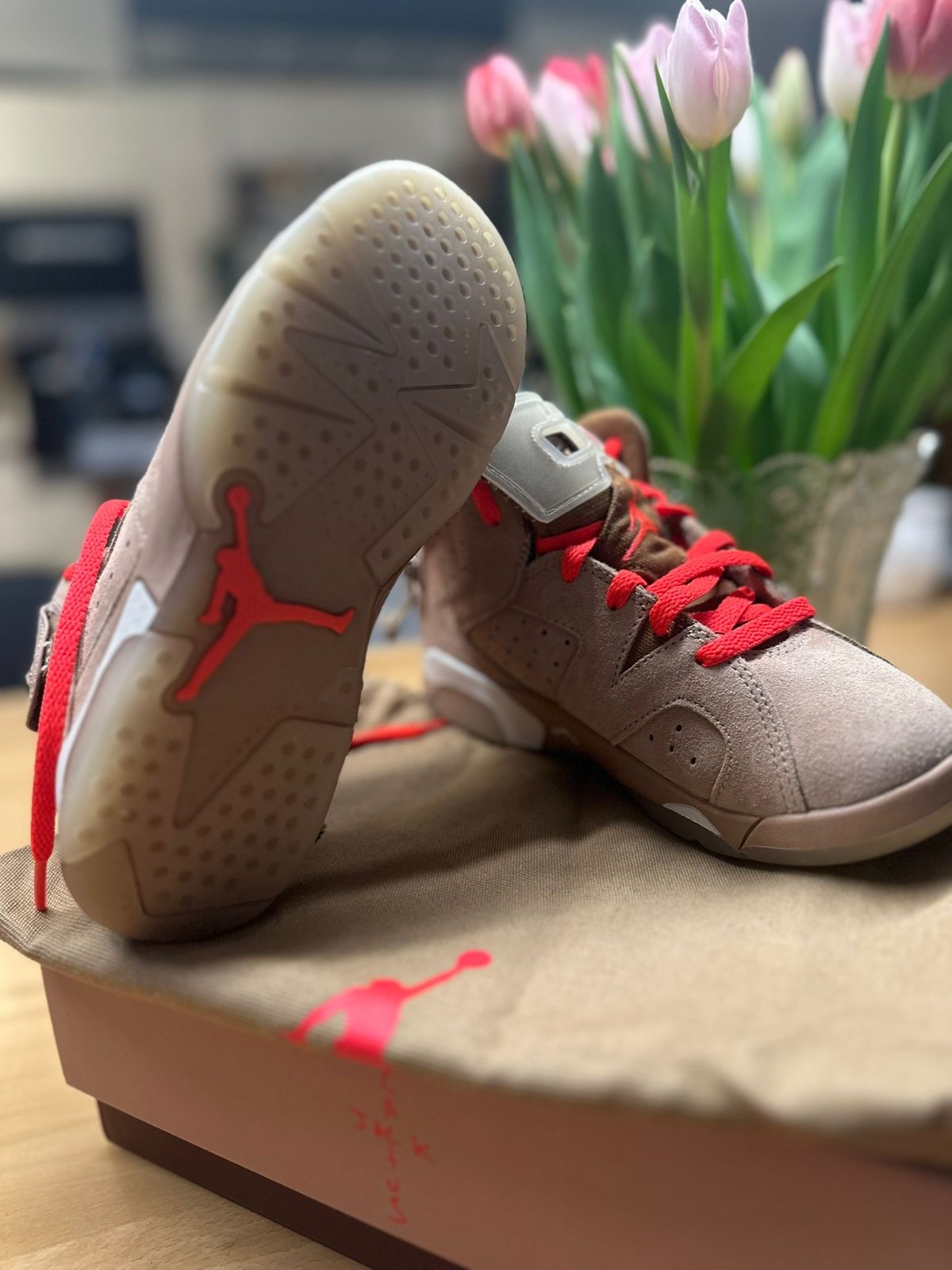 Predám úplne nové, nenosené dievčenské tenisky Jordan 6 Retro “Travis Scott” v béžovej farbe – limitovaný model, ktorý sa nedá bežne kúpiť v obchodoch!