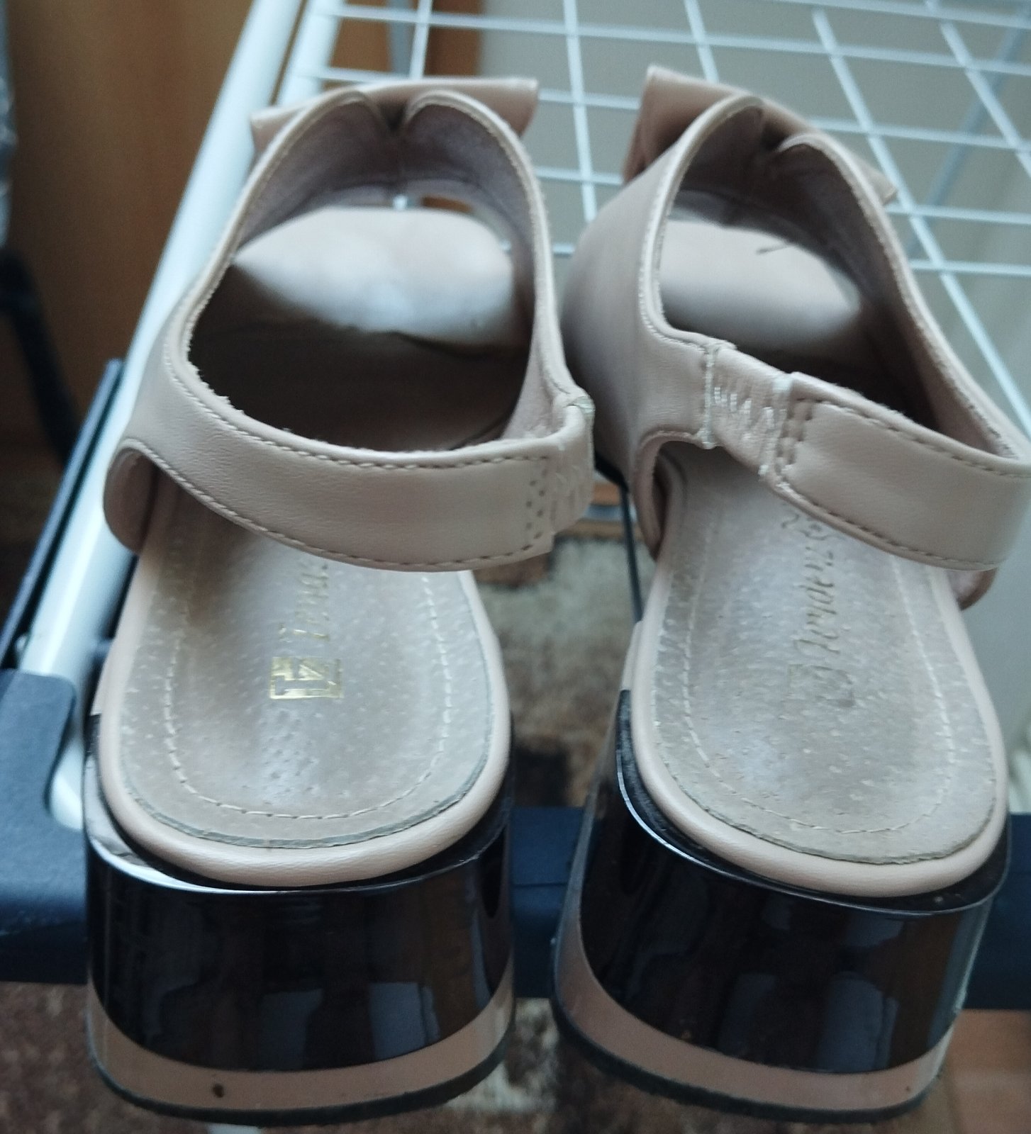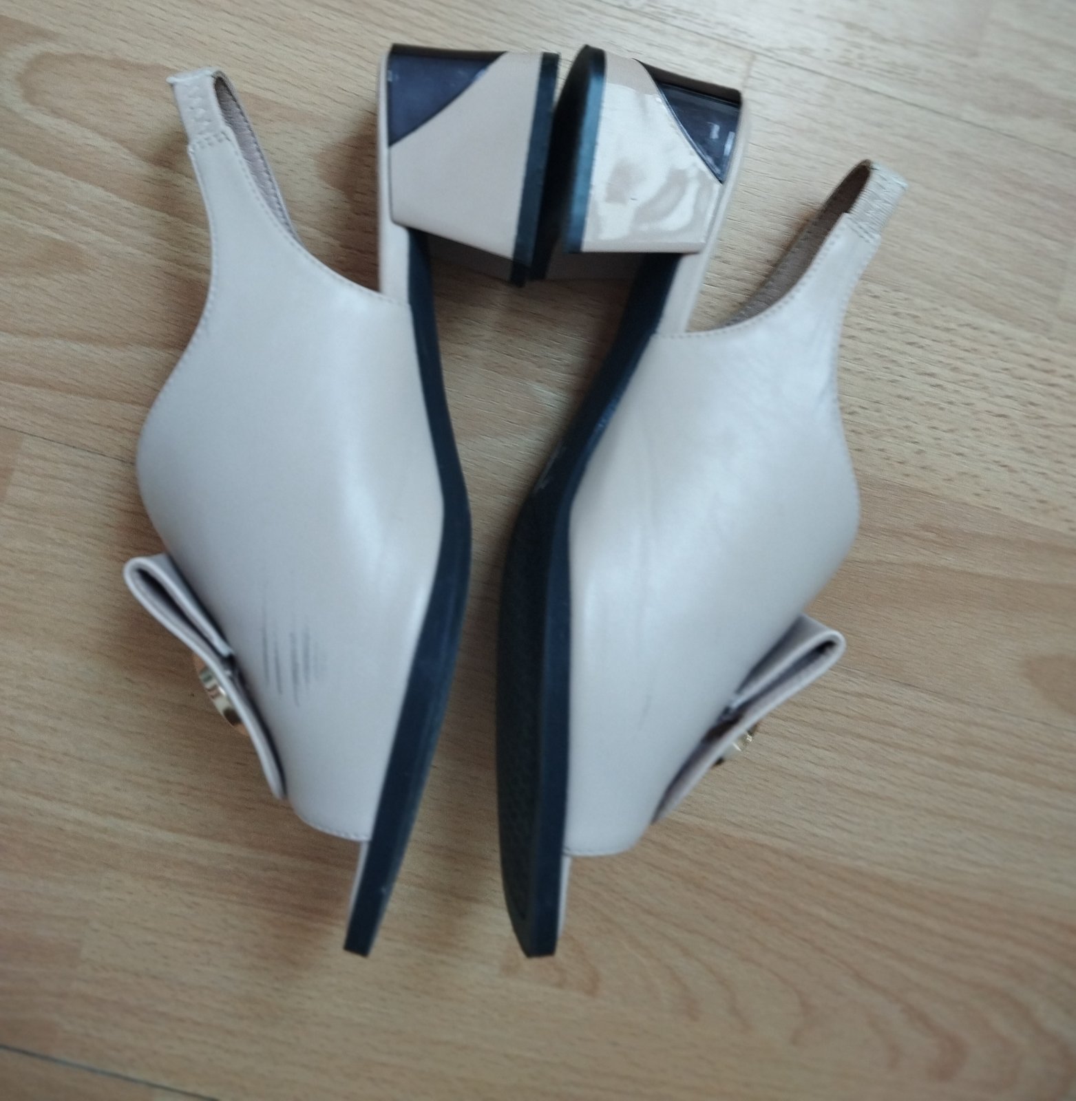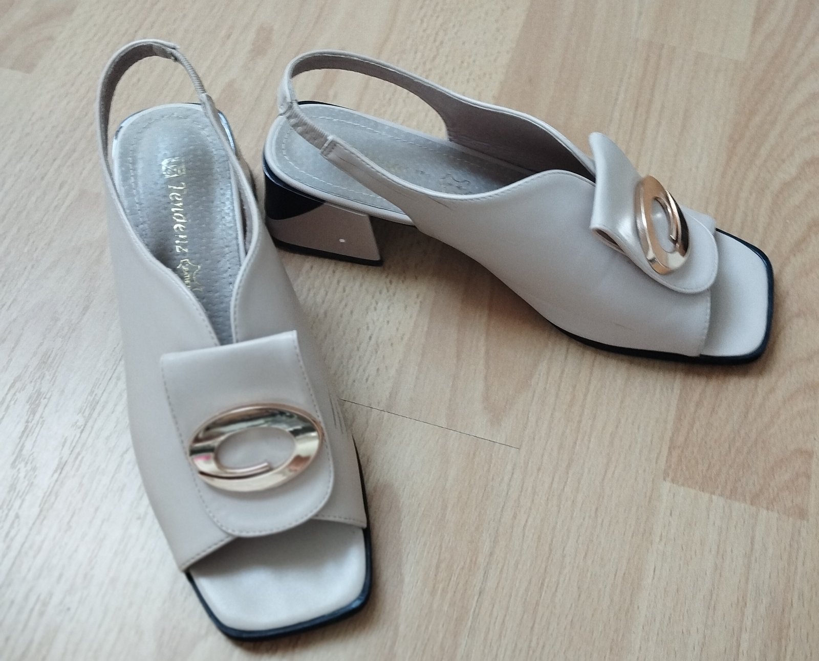 Málo nosené sandále s brošňou. Opätok dvojfarebný, lesklý 4 cm. Vzadu na gumičku.
