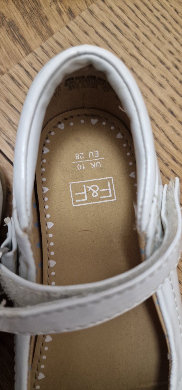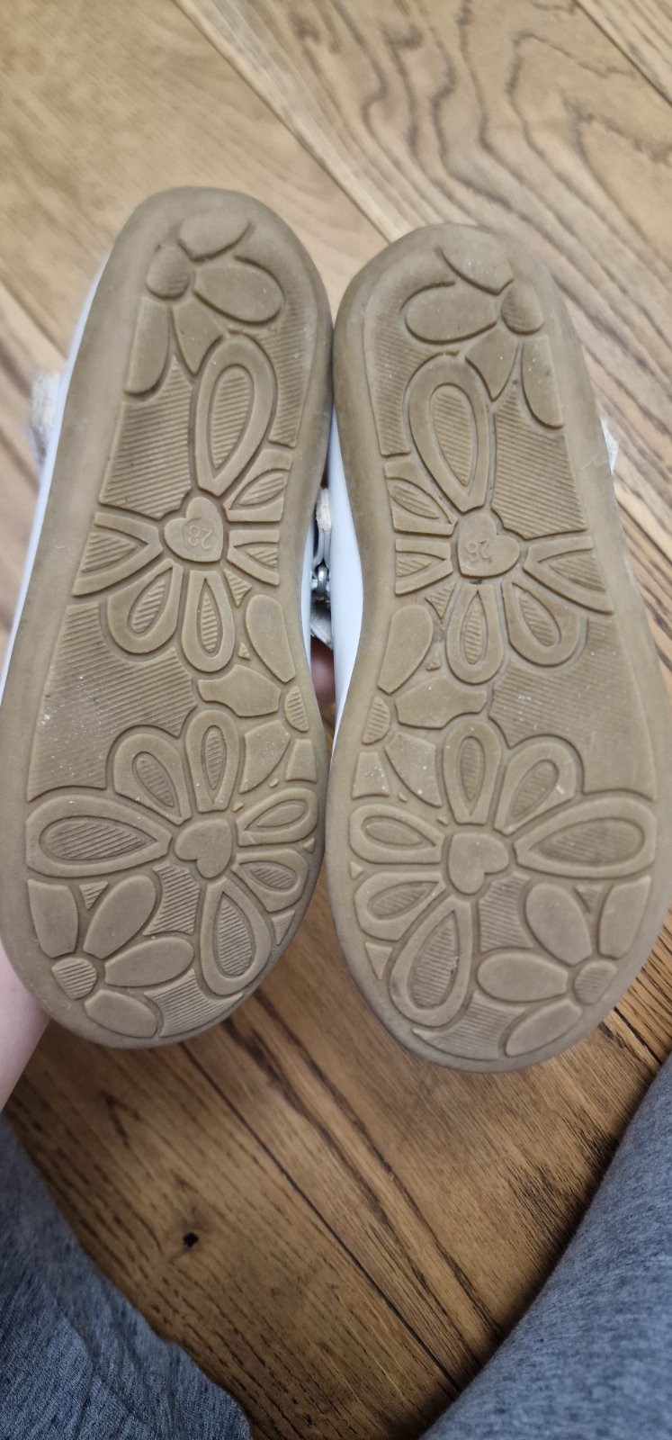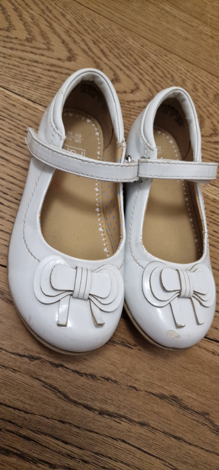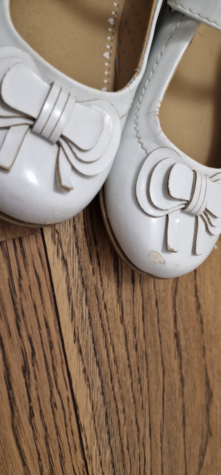 Farba je prírodná biela, nie je žiarivá biela. Majú škrabance. My sme využili do škôlky na vystúpenie. Remienok som skrátila, bol nám dlhý. Vhodné na úzku nohu. Vd 18 cm.