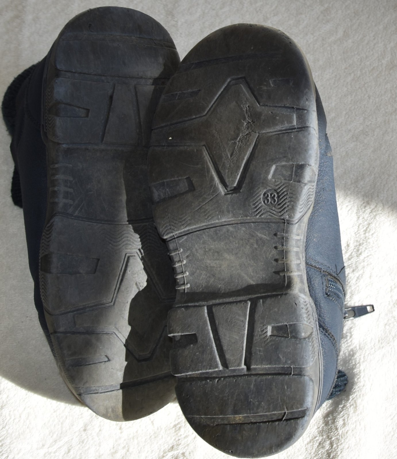Topánky nosené, opotrebovanie vidno na fotkách - vpredu sú šuchnuté, ale nepremokajú. VD 22.