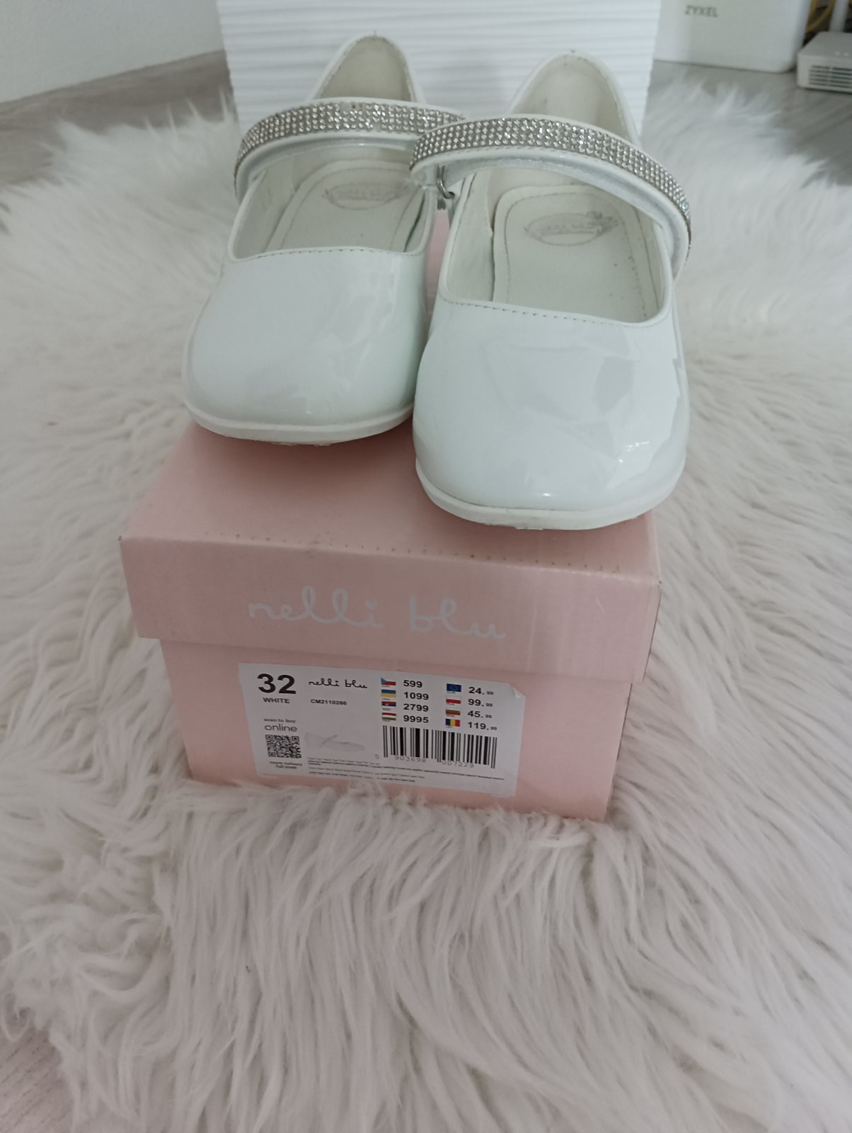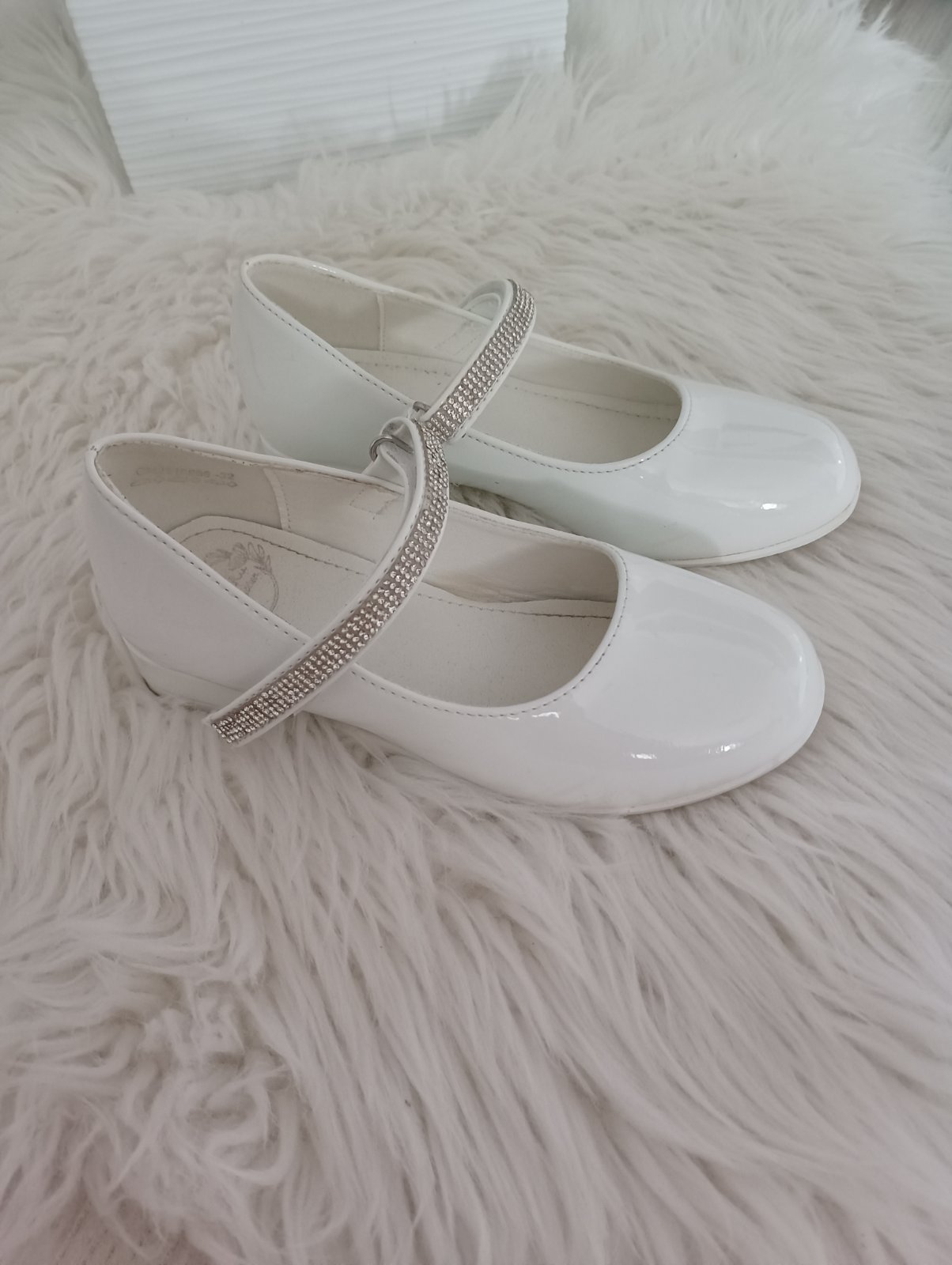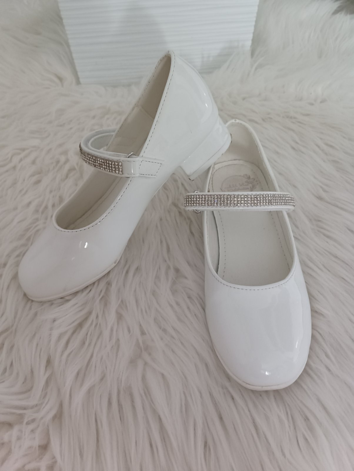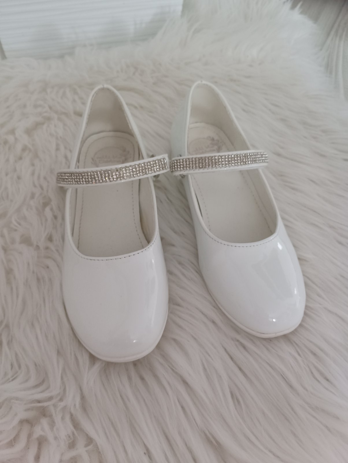 Biele topánky obuté 1x na prvom sv.prijímaní. Nemajú žiadne poškodenia, len chýbajú 3 kamienky na remienku, boli tak už kúpené. Čisté, super stav. Vrecko (nové) na topánky alebo TV v cene 😊