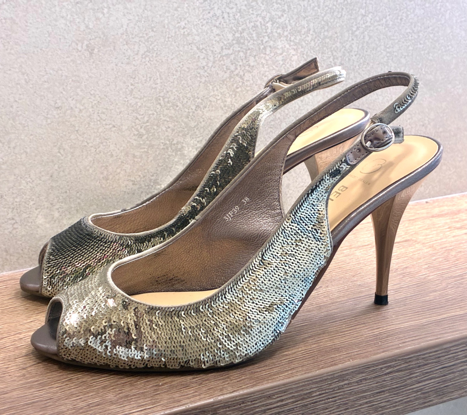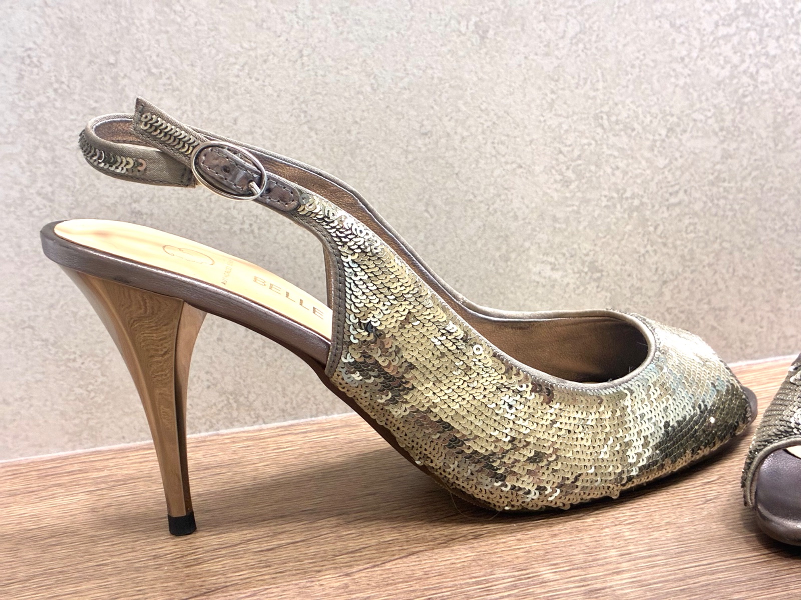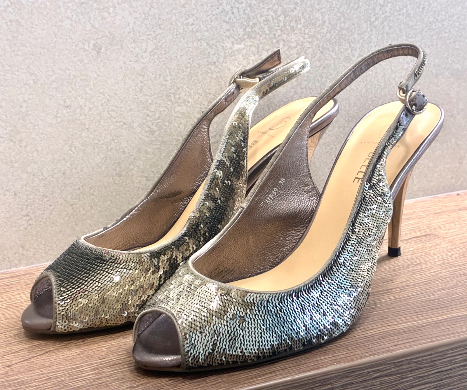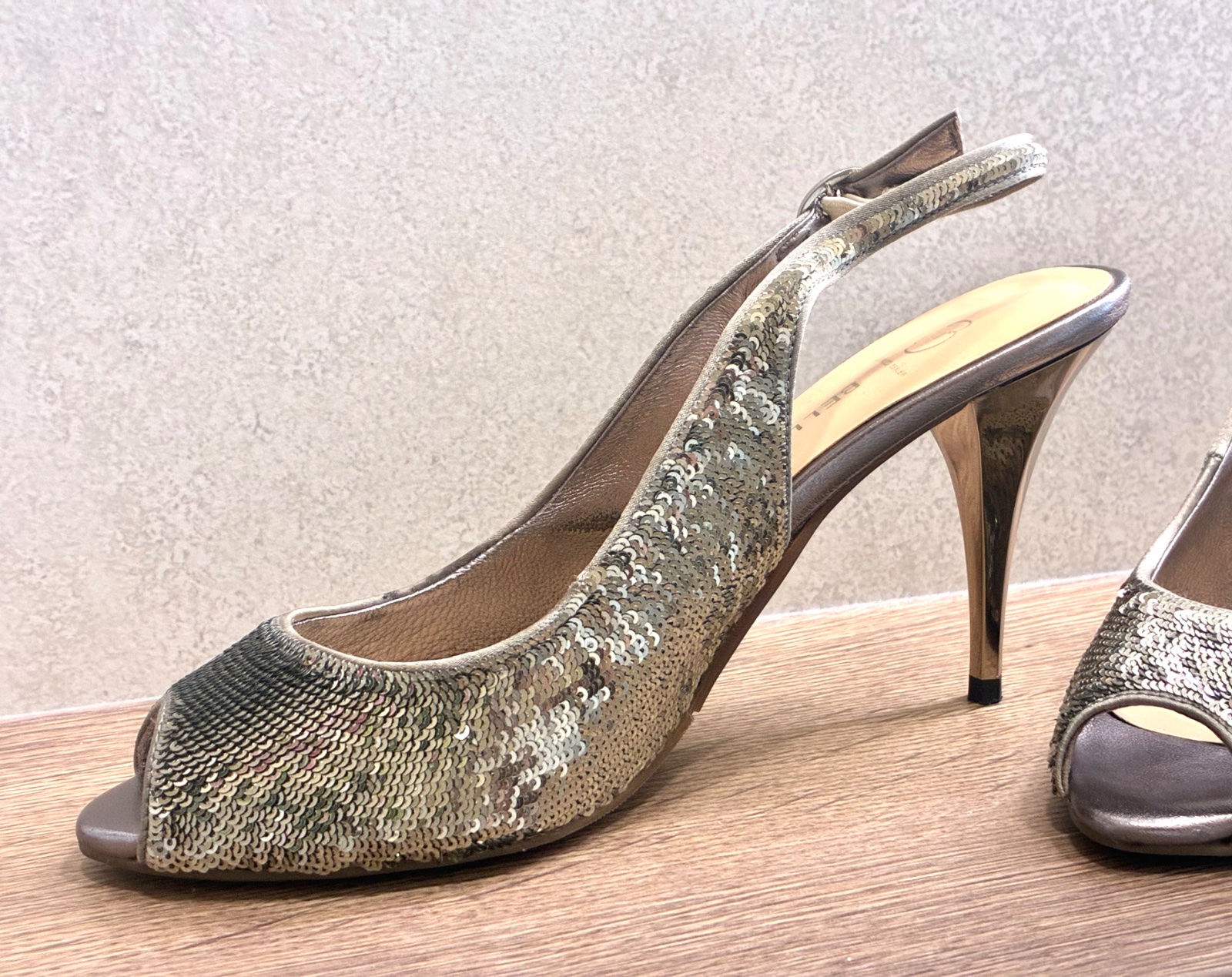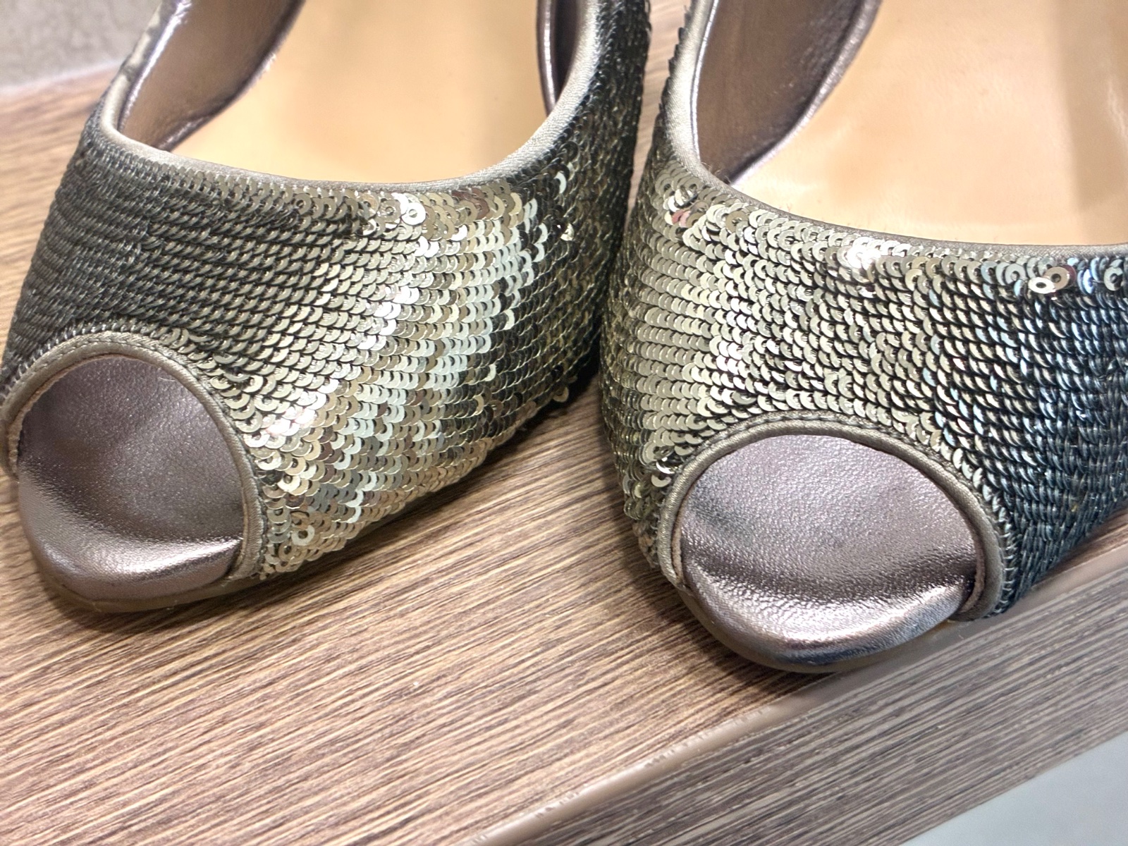 Flitrované sandále. Zlatostrieborné. Zapínanie na pracku. Obuté raz.