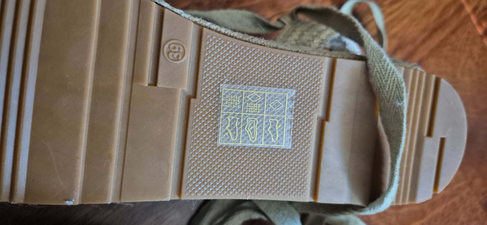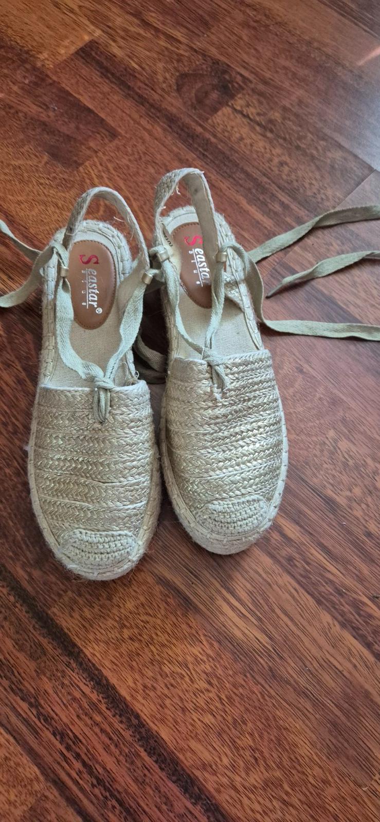 Krásne espadrilky krémová farba hore so zlatou. Krásne sa viažu okolo členkov, lýtok a veľkosť je písaná 39, ale sú menšie namerala som vnútornú dĺžku 24 a pol cm, sedia na veľkosť 38, sú bez chýb.