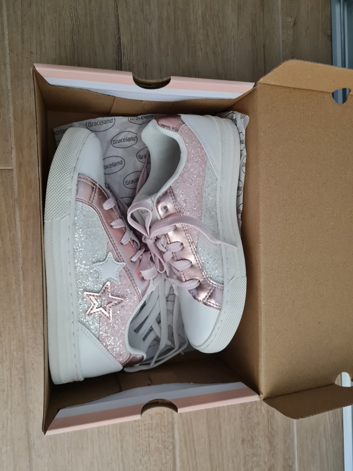 Pudrové tenisky resp. prezuvky zn. Graceland s polstrovanou pätou vhodné aj k sukni. Sú veľmi pohodlné a bez poškodení. VD 213mm