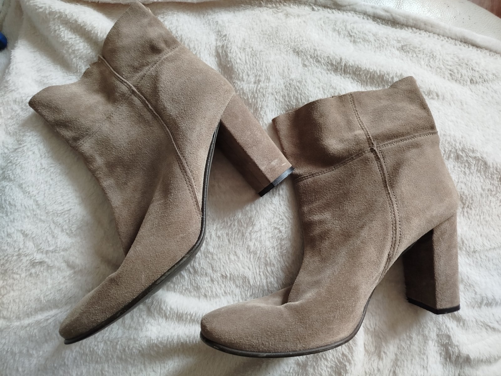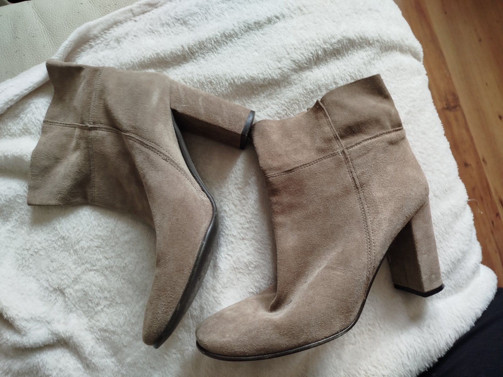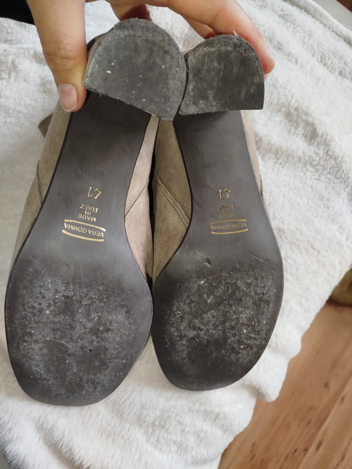Kvalitné čižmy z kvalitnej kože brúsenej pohodlný širší opatok pôvodne boli vysoké ja som ich skrátila na členkové neboli často nosené koža aj opatok nepoškodené .vnútorná dĺžka klasické 26,5 cm sedia na c.41 aj na širšiu nohu.