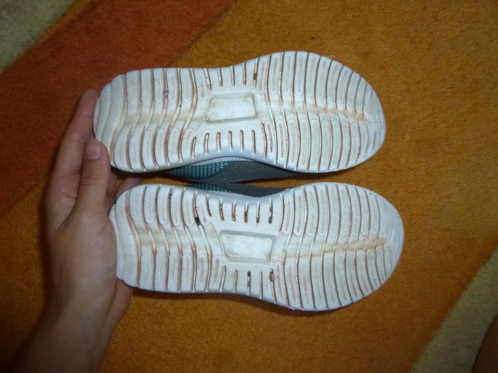 Tenisky su velmi zachovale, kupene tu na bazare, syn ma velmi siroku nozku, jemu nesadli. Vnutorna dlzka cca 18cm. Az teraz som si vsimla este esteticku vadu, na tretej fotke vidno zosuchanu farbu ...