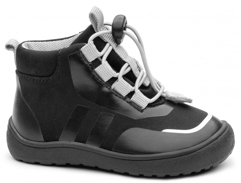 Originálne chlapčenské barefoot topánky čiernej farby sú vyrobené z neoprénu a gumy Membrána PROTEX účinne chráni nohy pred dažďom a vlhkosťou, takže topánky sú ideálne do premenlivého jesenného počasia. Zvršok je vyrobený z kvalitného neoprénu v modrej farbe a doplnený o gumové časti na päte a špičke pre vyššiu odolnosť. Elastické šnúrky umožňujú jednoduché obúvanie a individuálne prispôsobenie topánky chodidlu. Vo vnútri sa nachádza netvarovaná, vyberateľná stielka. Okrúhla podošva s protišmykovým dezénom je odolná a zároveň veľmi ohybná. Špička je dostatočne priestranná pre širšie chodidlo. Rovná podošva je maximálne ohybná a má nulový drop, čo zabezpečí chôdzu „ako naboso“. Čiastočne spevnený opätok udržuje nôžku v správnom postavení.