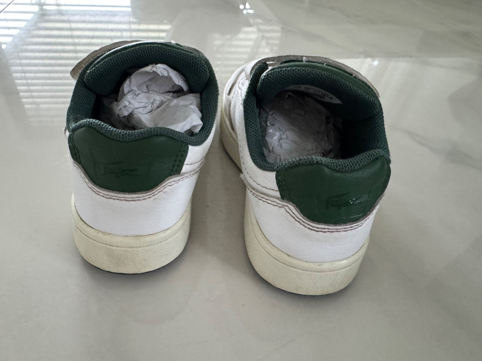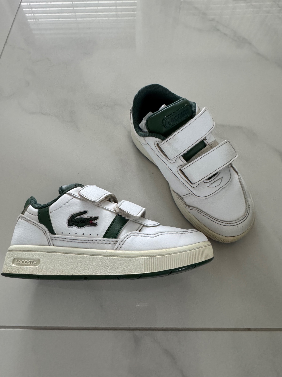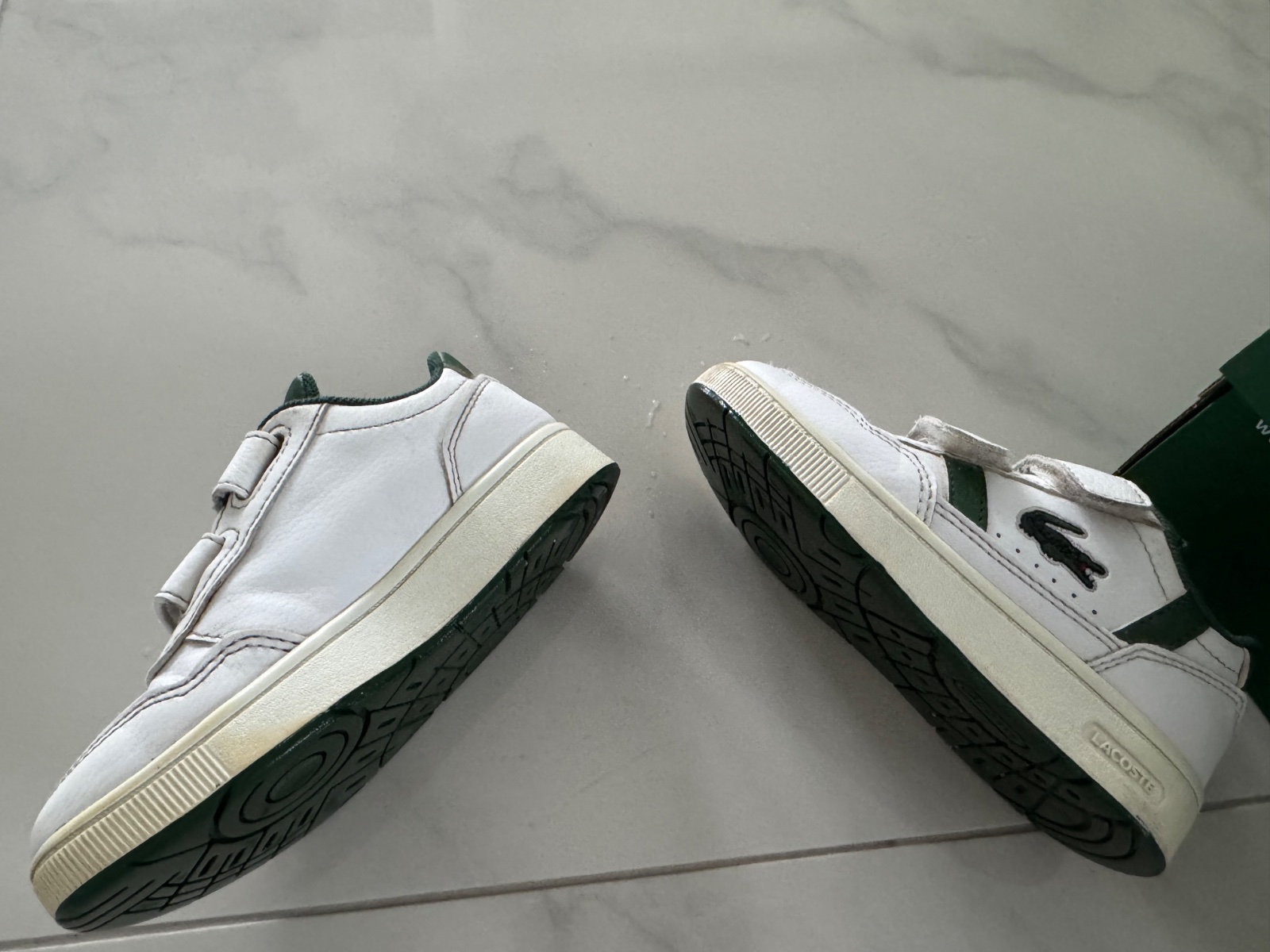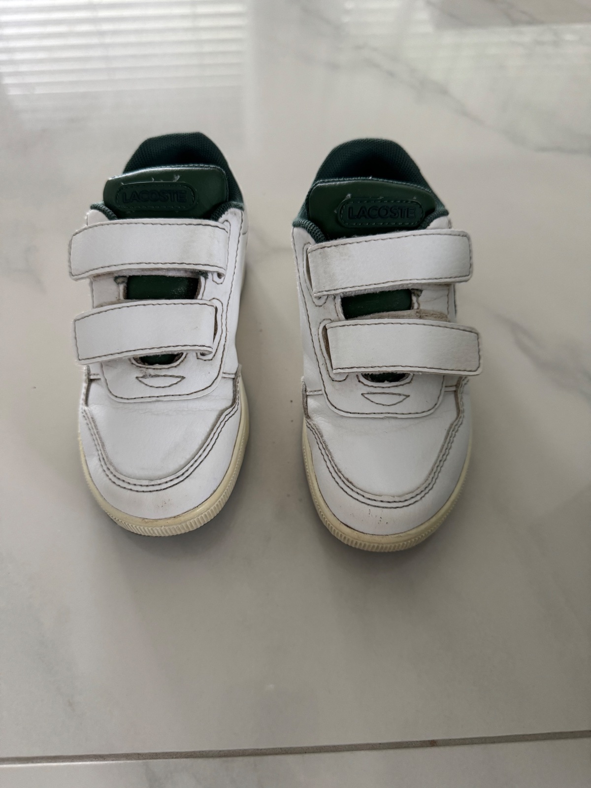 Predám biele Lacoste tenisky vo veľkosti 26 pre malých fešákov. Nosené synčekom. Sú na suchý zips. Kožené. Nemajú žiadne diery.