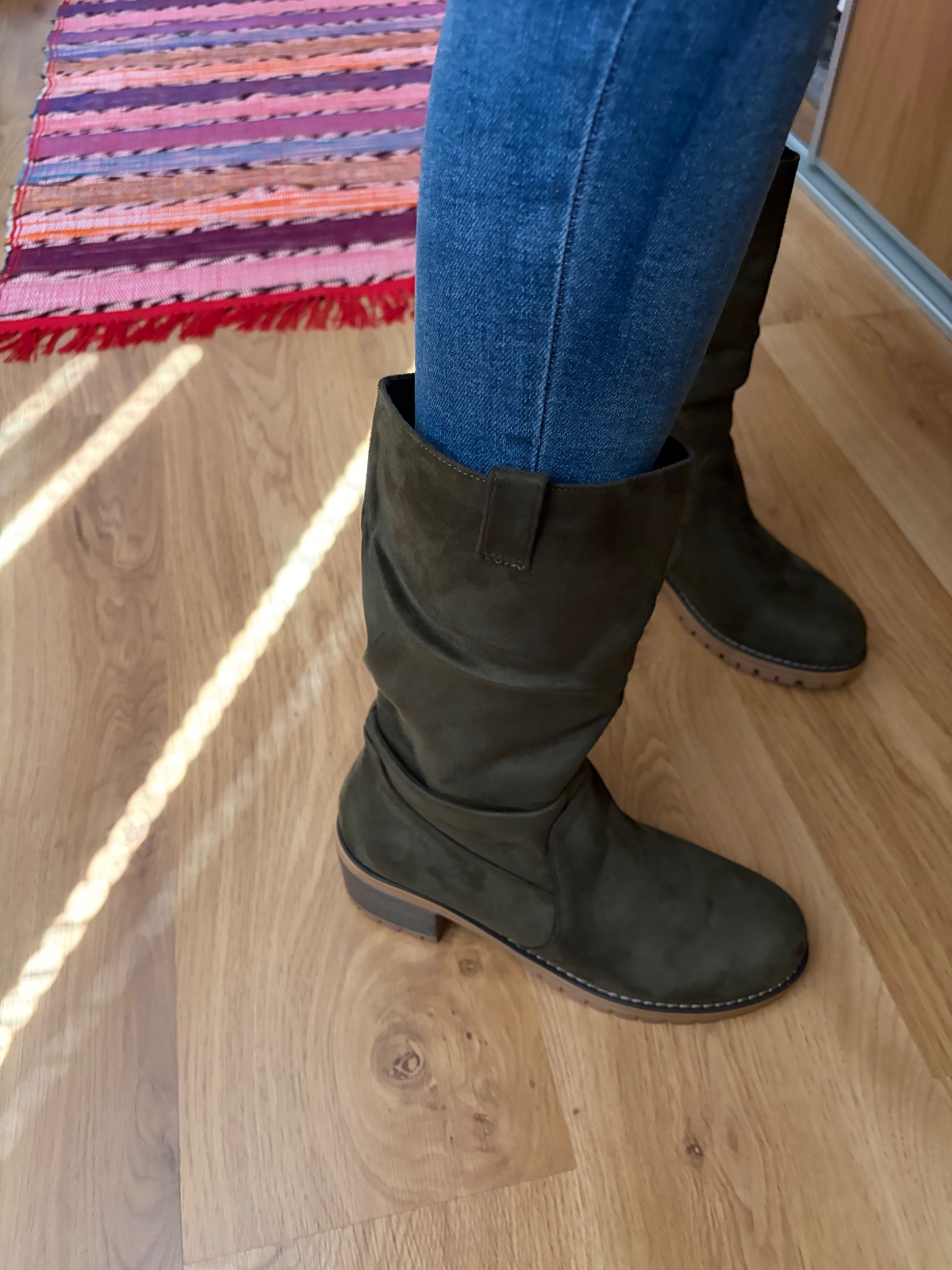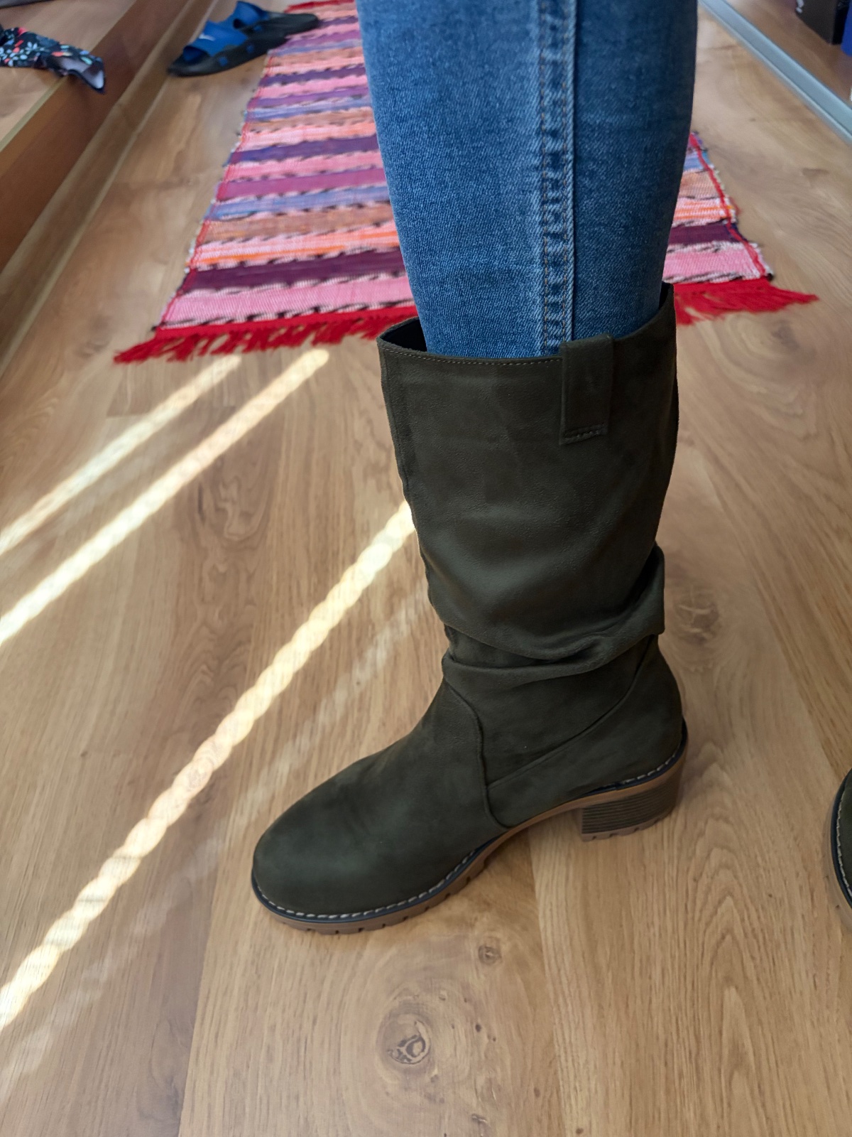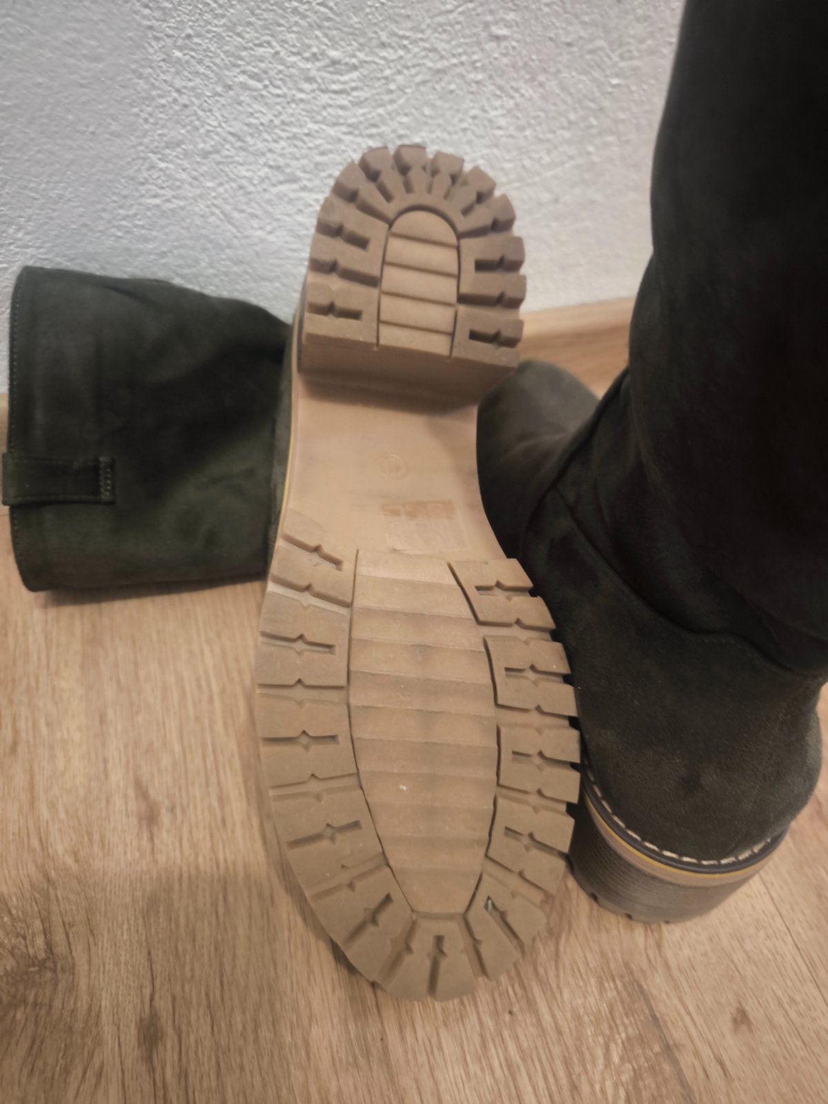 Semišové čižmy nad kolená od talianskej značky Gianni Renzi. Sú charakteristické sýtozelenou farbou, stabilným blokovým podpätkom a priliehavým strečovým strihom. Tieto čižmy sú často vyhľadávané...