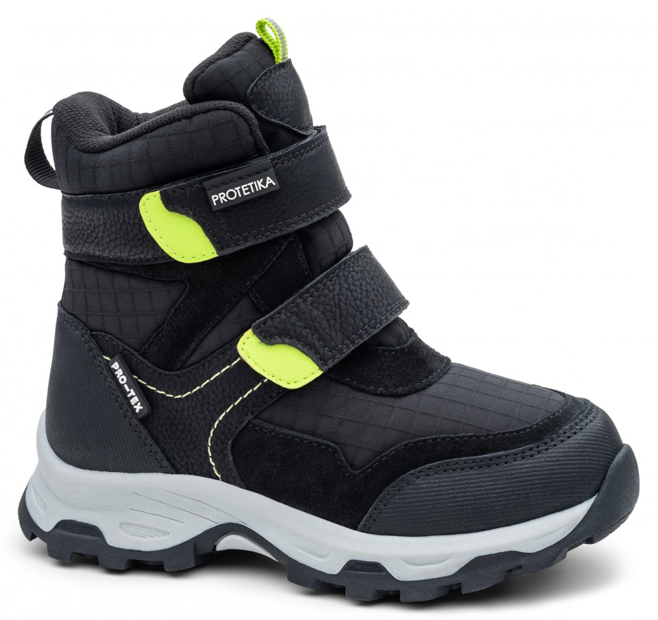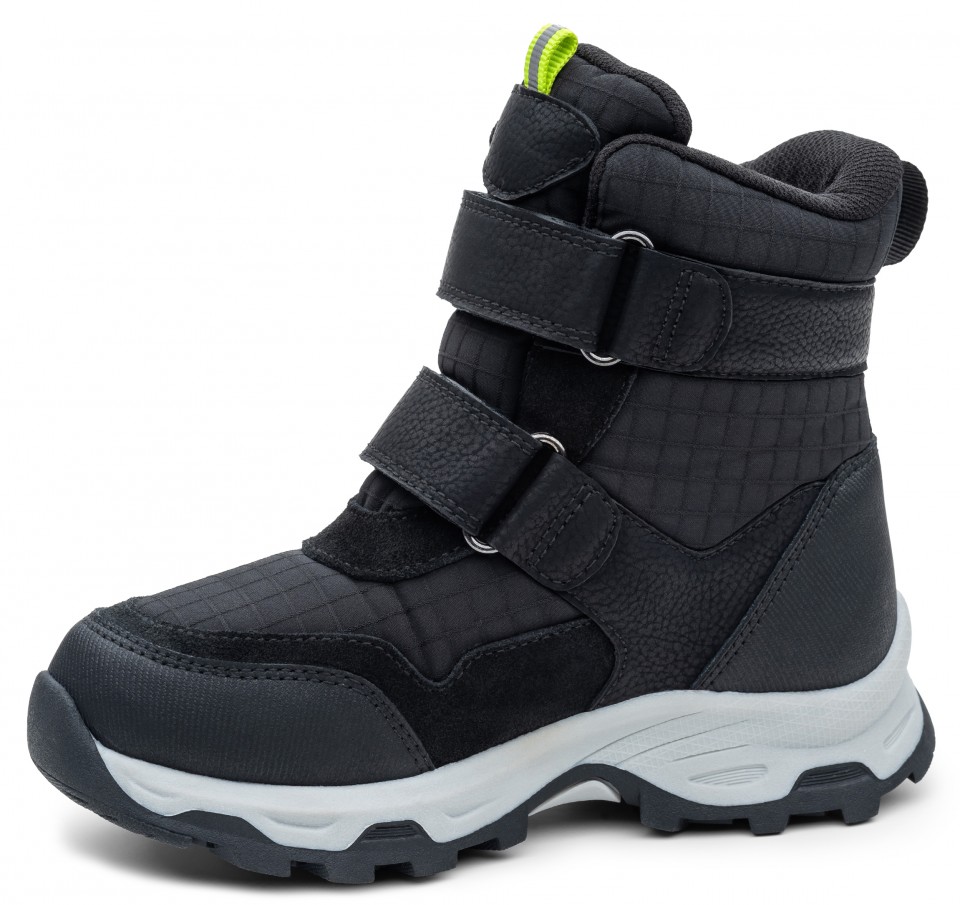 Novinka! Chlapčenské vychádzkové zimné topánky sú vyrobené z hladkej a brúsenej kože v kombinácii s kvalitným textilným materiálom. Topánky sú v čiernej farbe, doplnené žlto-zelenými detailmi.