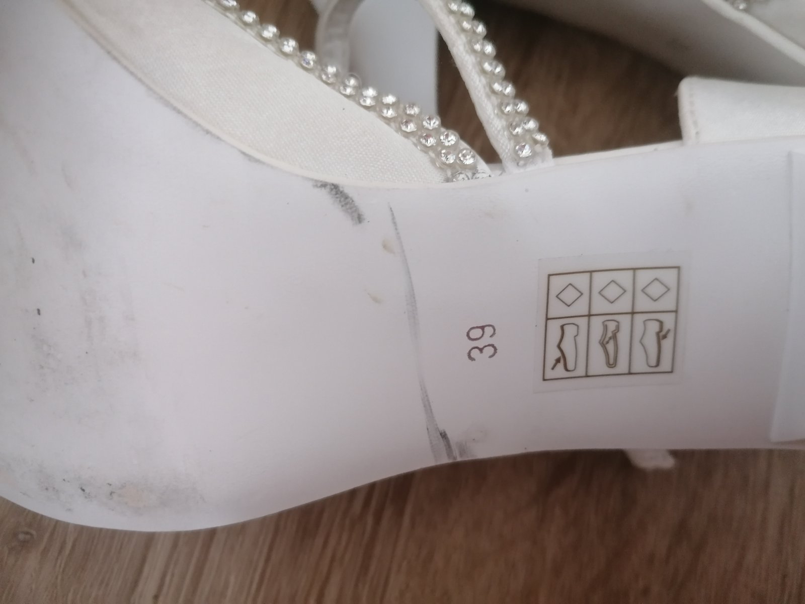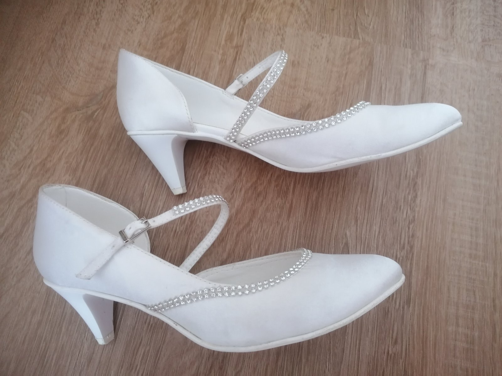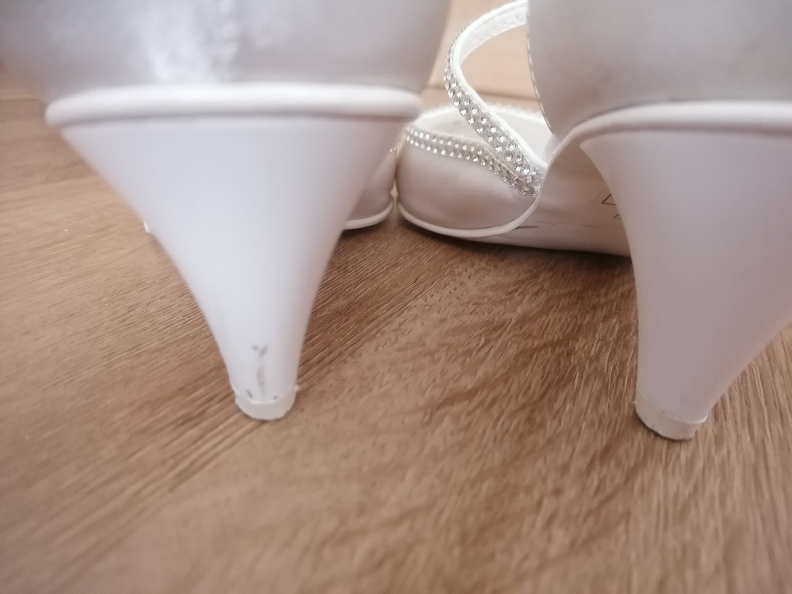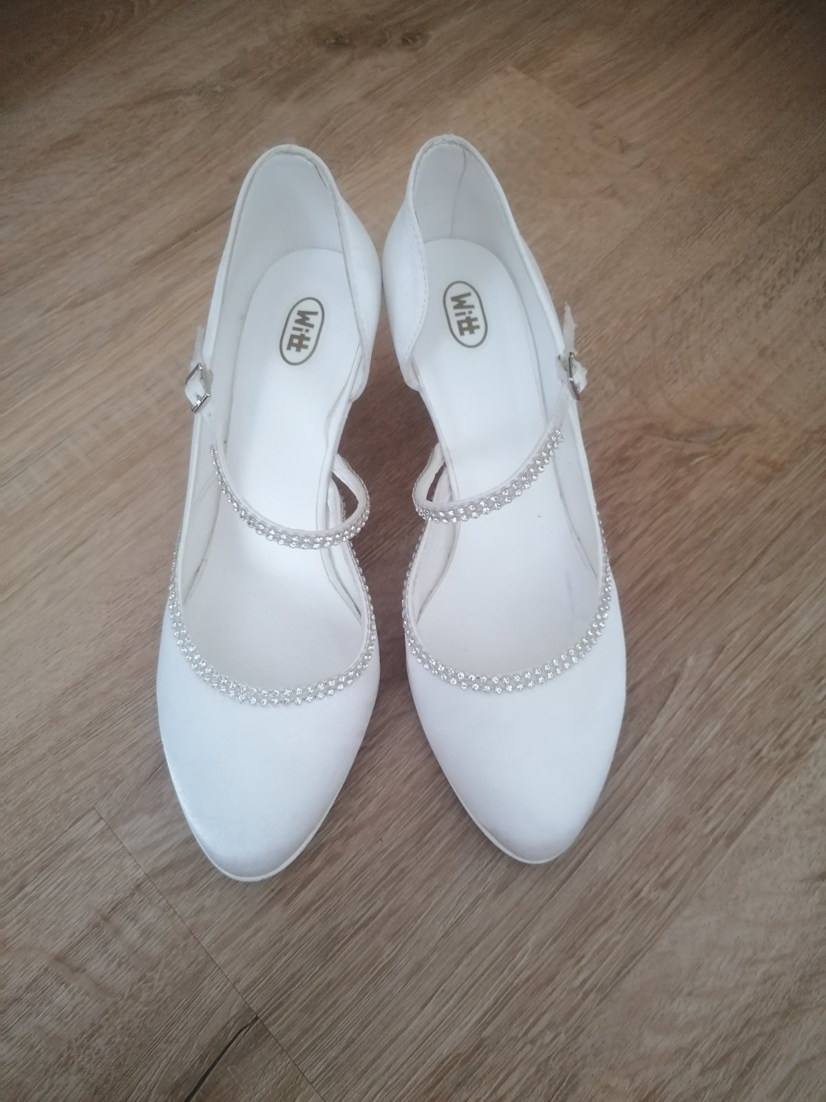 Svadobné lodičky, značka Witt, veľkosť 39, obuté len na obrade. Na lavom podpätku vzadu je škrabanec, vid foto, inak bez poškodení. Cena 14 eur plus poštovné.