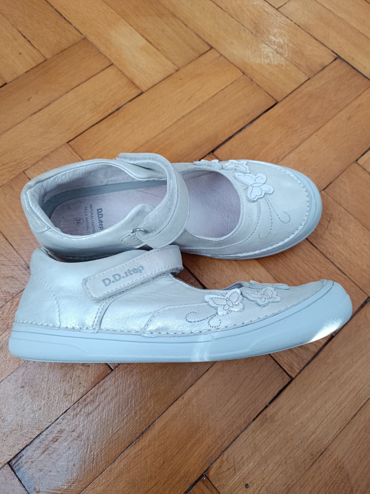 Kožené balerínky v metalickej bielej farbe, v top stave. Celková dĺžka stielky je 23,1 cm.
