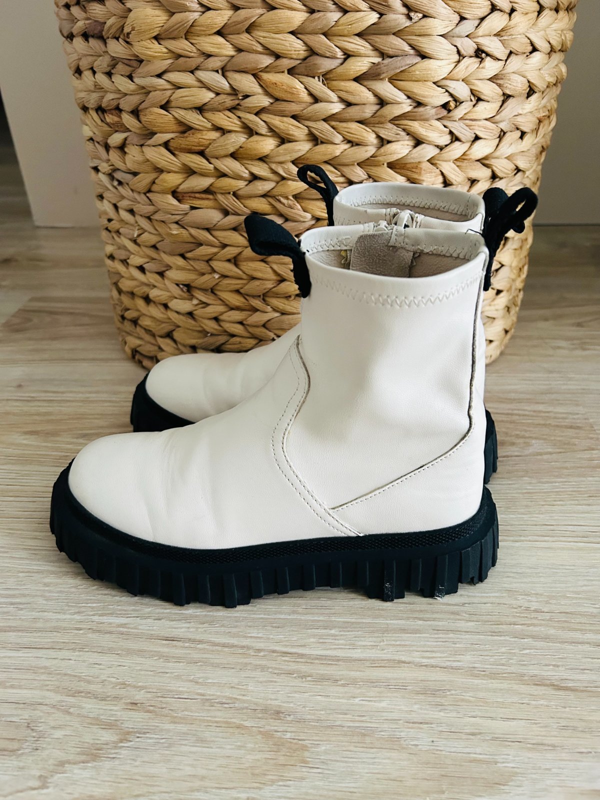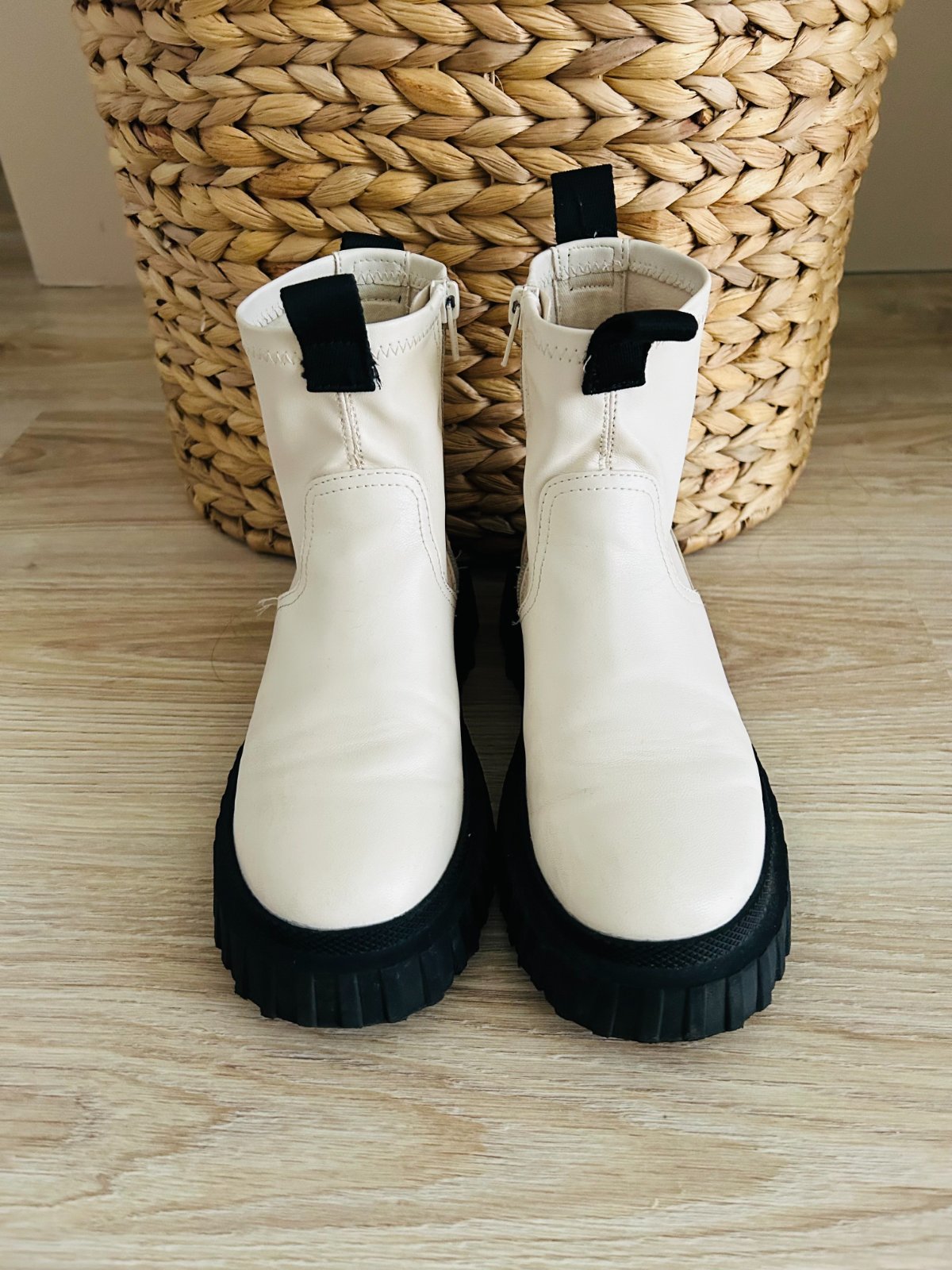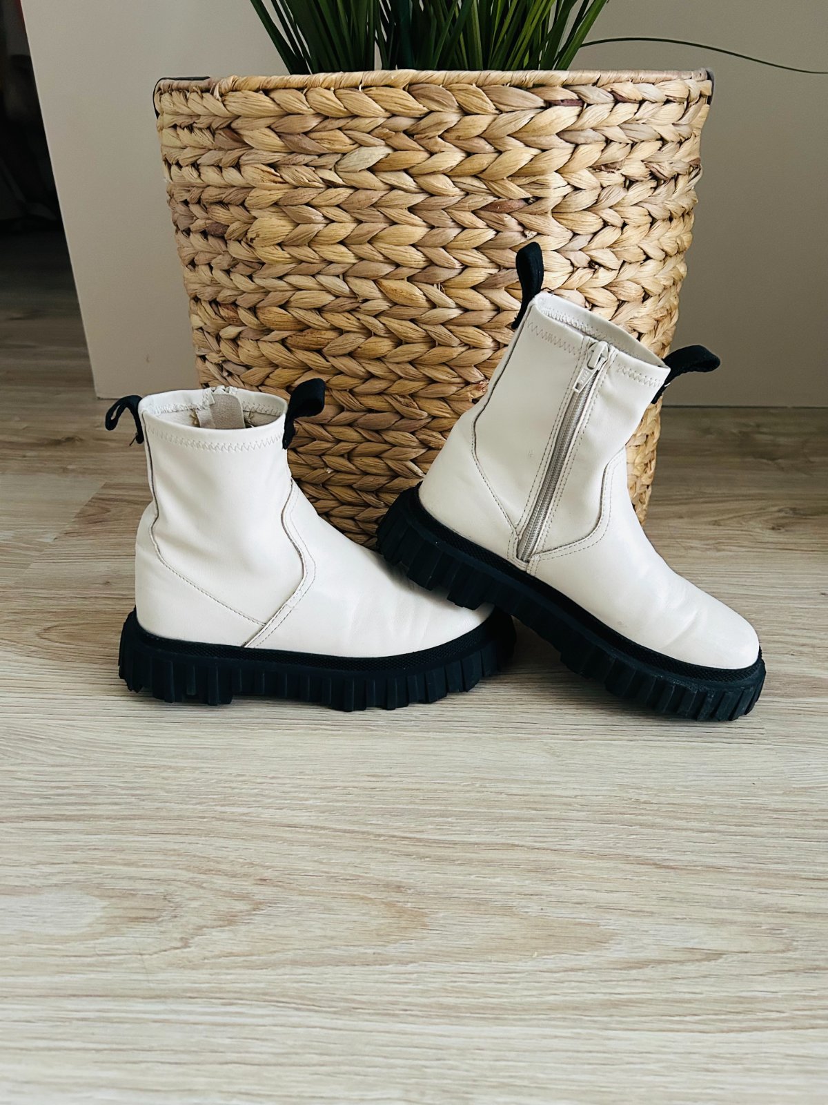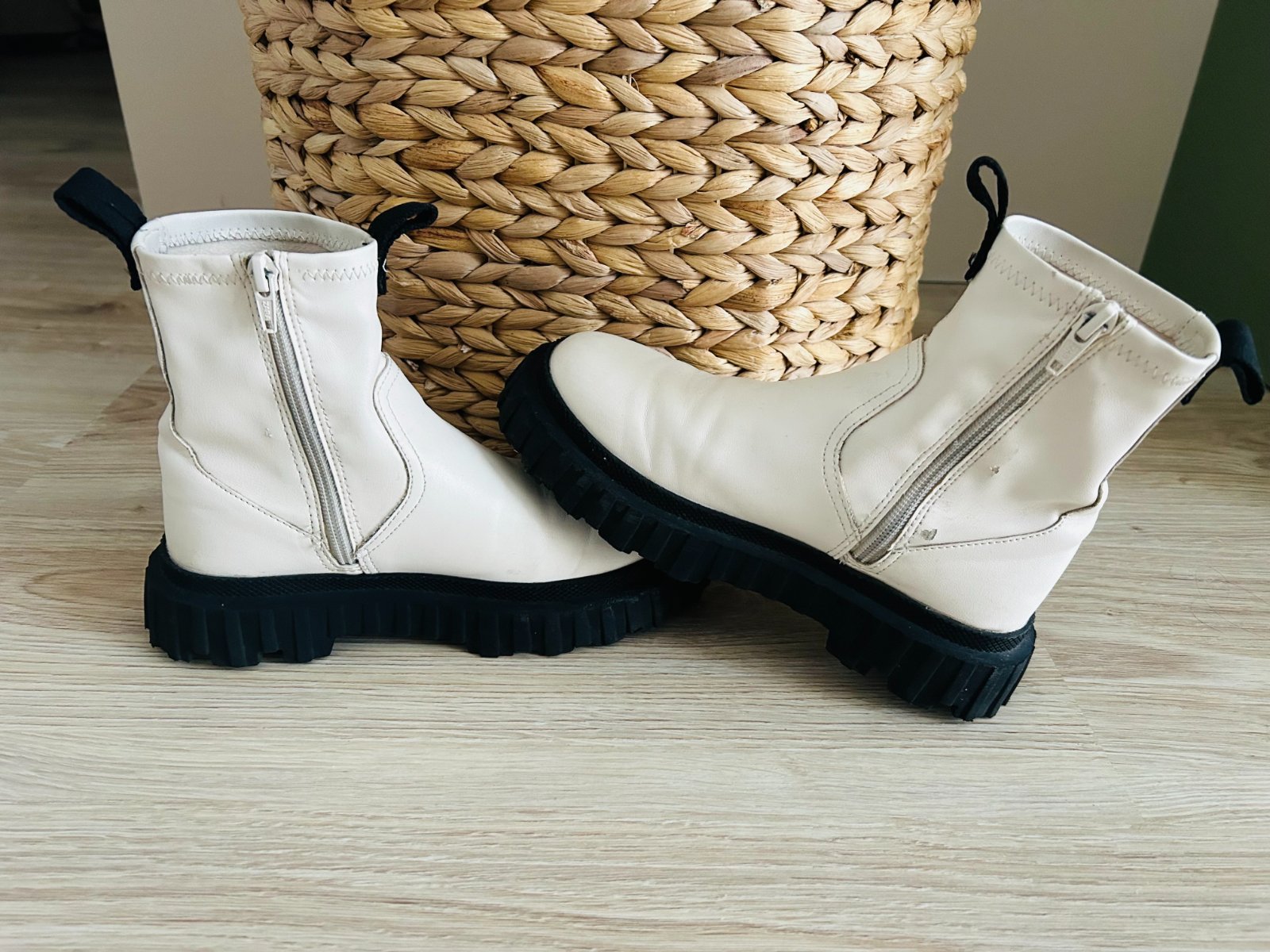 Predám tieto skvelé členkové čižmy značky ZARA vo veľkosti 34. Pôvodne stáli 30 EUR. Čižmy majú objemnú traktorovú podrážku, predné a zadné pútko pre jednoduchšie obúvanie a bočné zapínanie na zips. Zvnútra sú jemne zateplené, ideálna na prechodné obdobie. Sú vo veľmi dobrom stave, akurát pri zipse z vnútornej strany je troška koženka ošúchaná, ale pri nosení je to naozaj zanedbateľné.