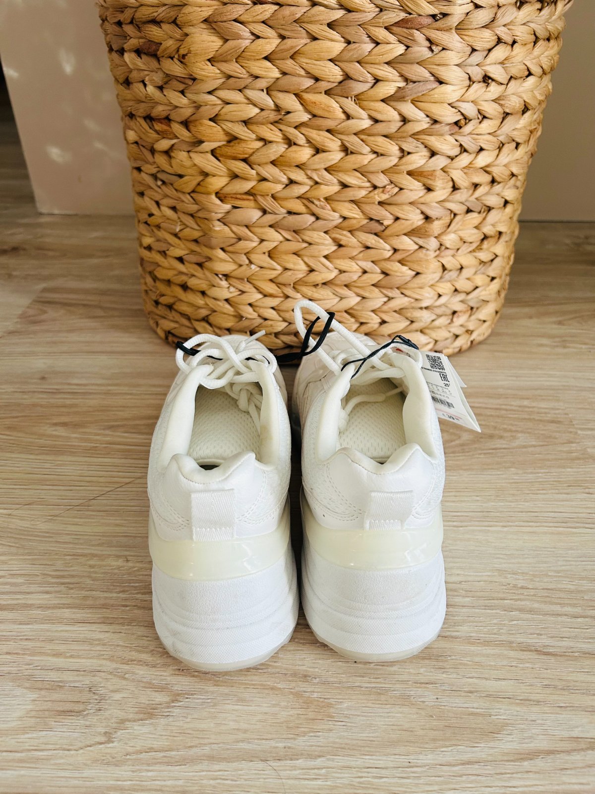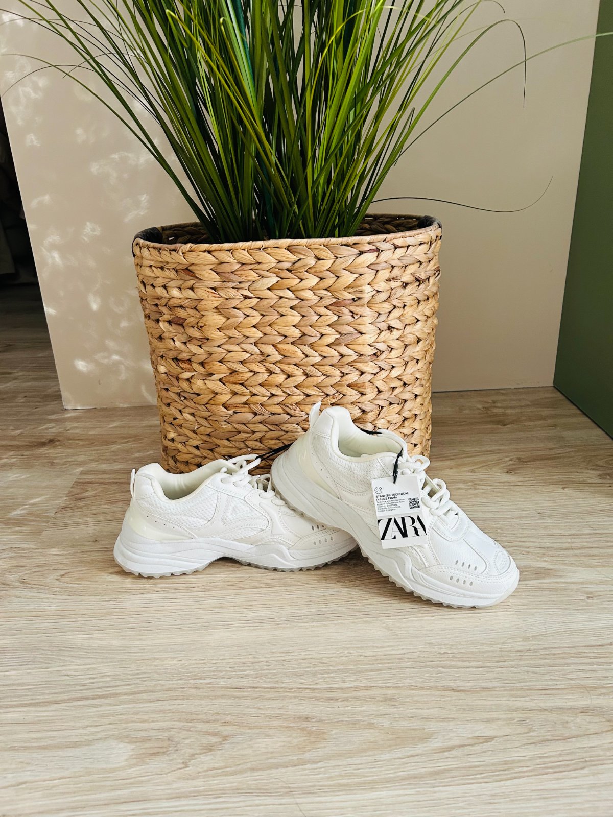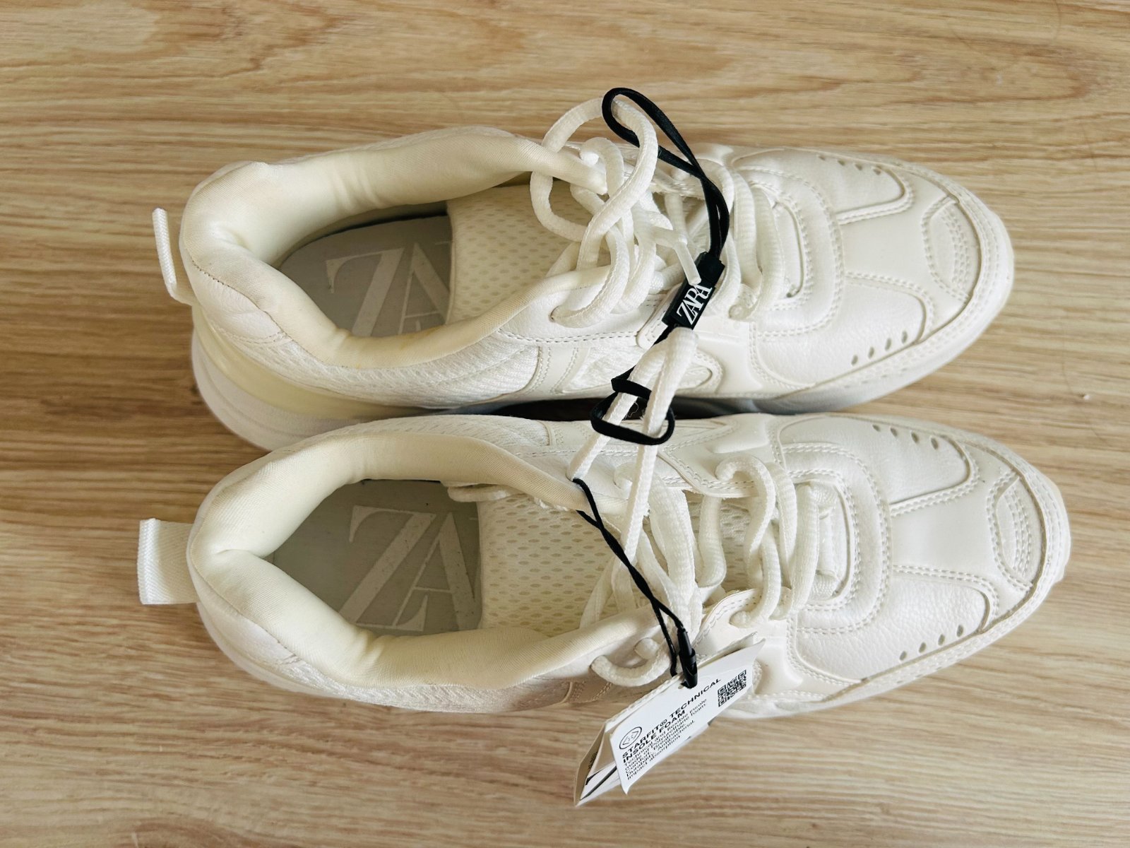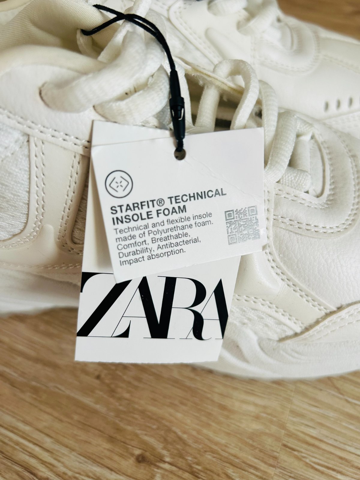 Predám tieto tenisky značky ZARA vo veľkosti 38. Tenisky sú NOVÉ S VISAČKOU. Tenisky sú z kombinovaných materiálov so sieťkovanými textilnými prvkami. Majú zadné pútko, pogumovanú podrážku a šnurovanie. Sú vybavené technológiou STARFIT, čo je pružná stielka z funkčnej peny, ktorá je navrhnutá tak, aby poskytla maximálny komfort. Výška podrážky je 5,5cm. Sú to univerzálne tenisky, ktoré sa dajú kombinovať do športových, aj každodenných outfitov.