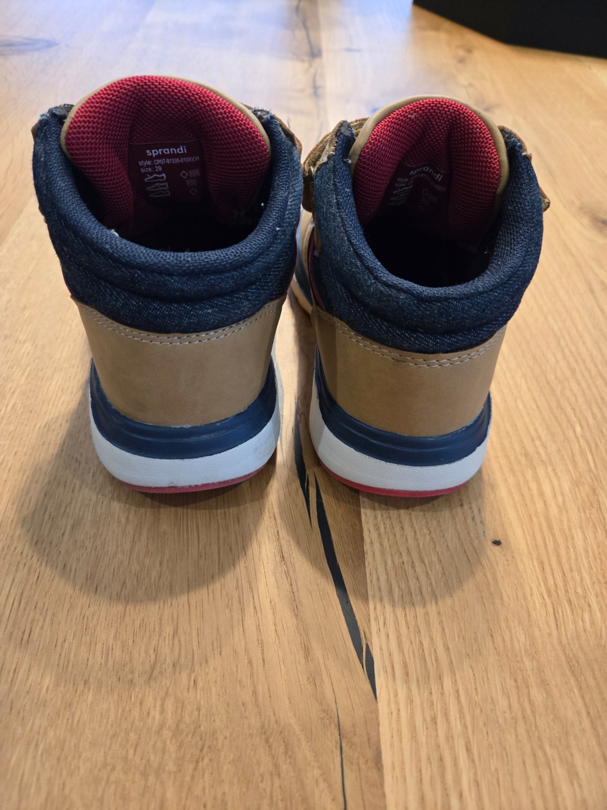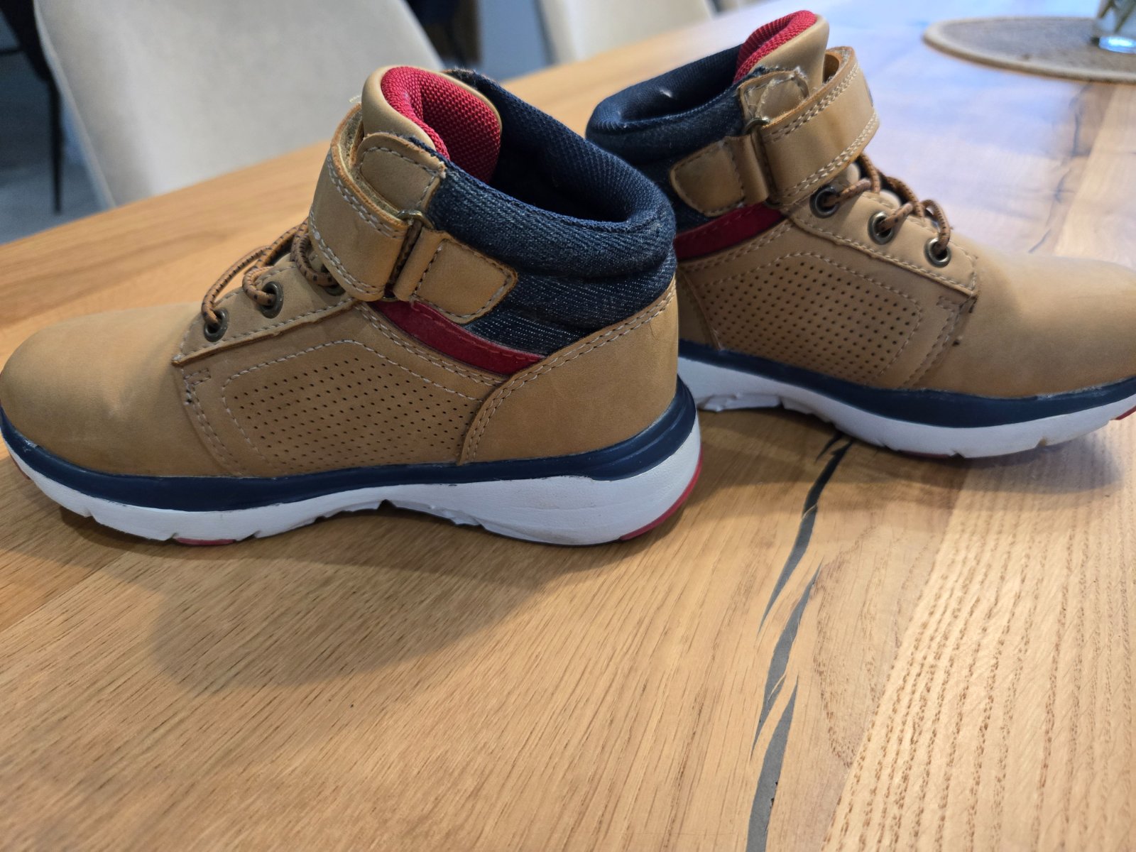 Predám chlapčenské jarné/jesenné vyššie topánočky. Kožené, veľmi pohodlné, farebne univerzálne - modro hnedé. Zapínanie na suchý zips, zipsy parádne držia. Bežne nosené, bez poškodení, známky bežné...