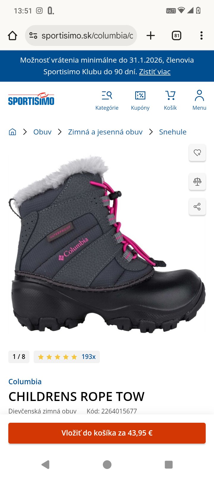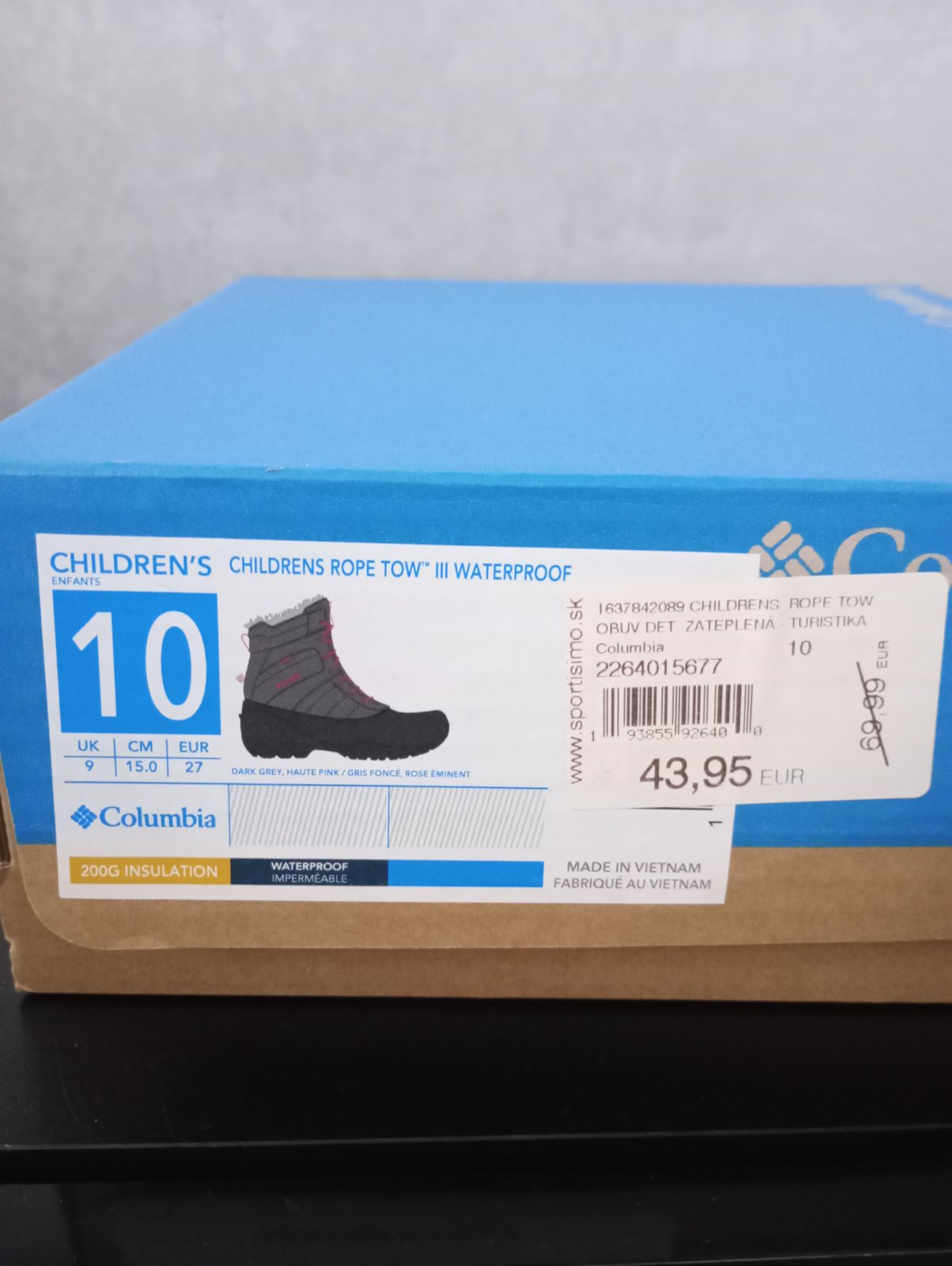 Columbia YOUTH ROPE TOW je obuv, ktorá Vaše deti udrží v suchu, teple a zaistí maximálne pohodlie a komfort pri ich zimných radovánkach. Vďaka praktickému rýchlemu stiahnutiu si ju deti veľmi rýchlo obľúbia a vďaka 200 g tepelnej izoácii je táto obuv ideálnou voľbou až do -32 °C.