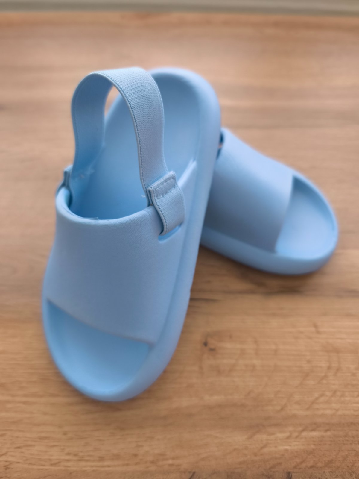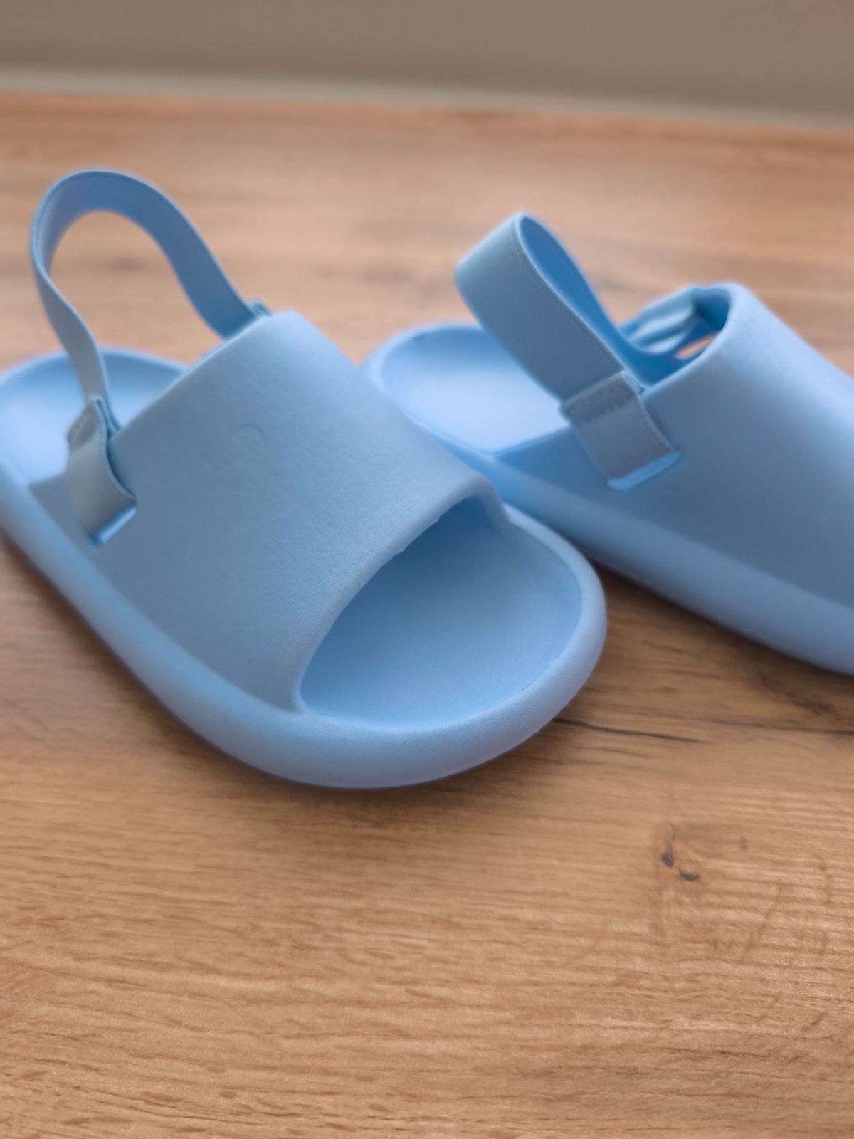 Ako nové svetlomodré šľapky obuté iba raz aj to iba doma
