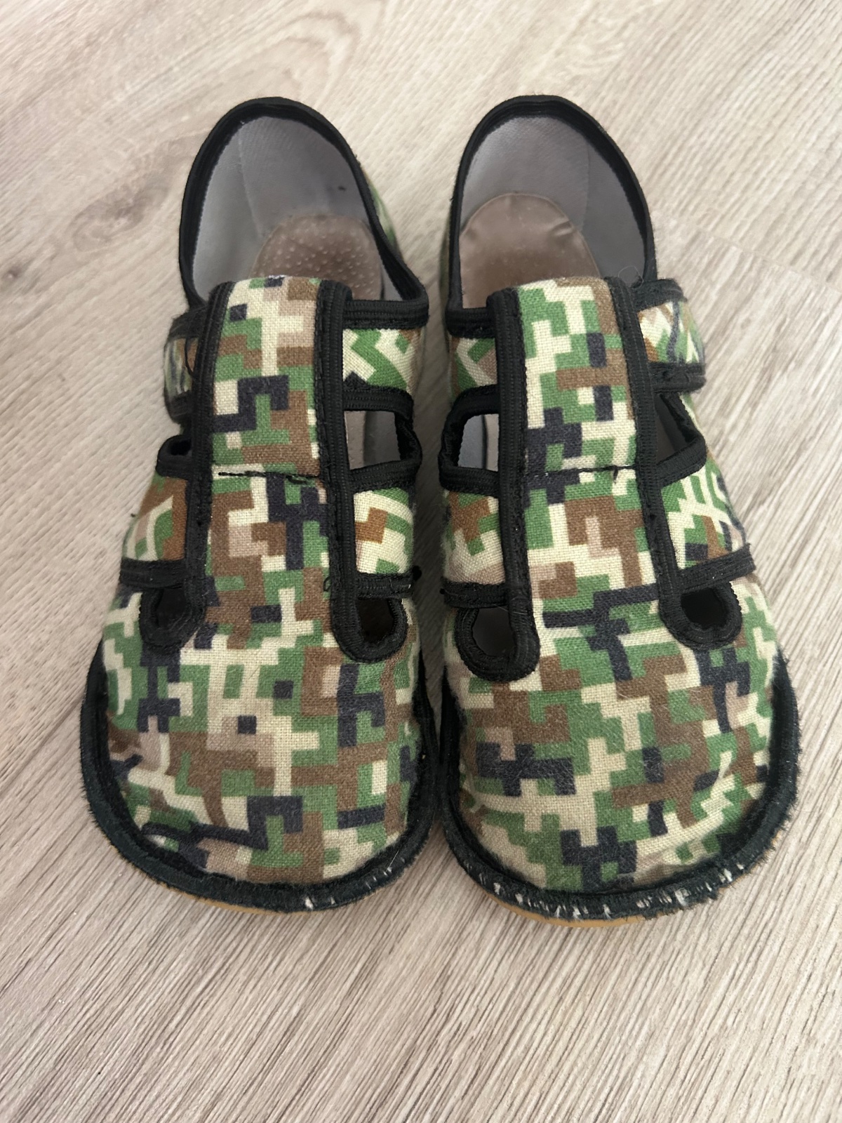 Textilné barefoot papučky. Dobre sadnú na nôžky s užšími pätami.