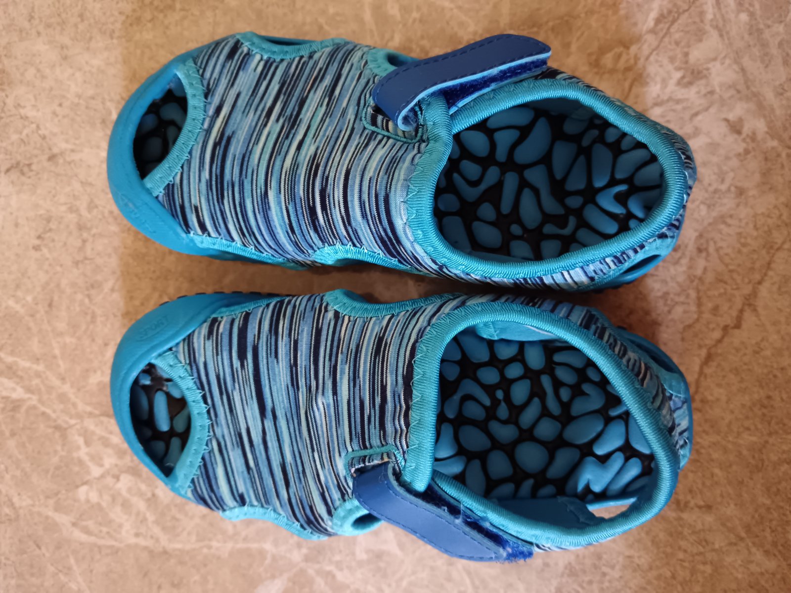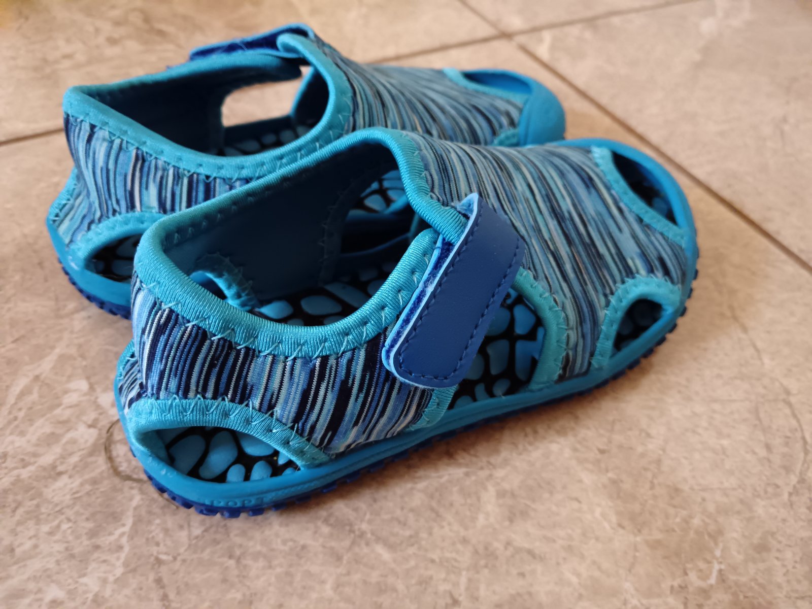 Posuvam gumene sandalky s neoprenovym vrchom. Velk. 28, su nové, nepouzite. Na palci zvysena guma na ochranu. Zapinanie na suchy zips. Vhodne ako na von, tak ako papucky, ci do vody.