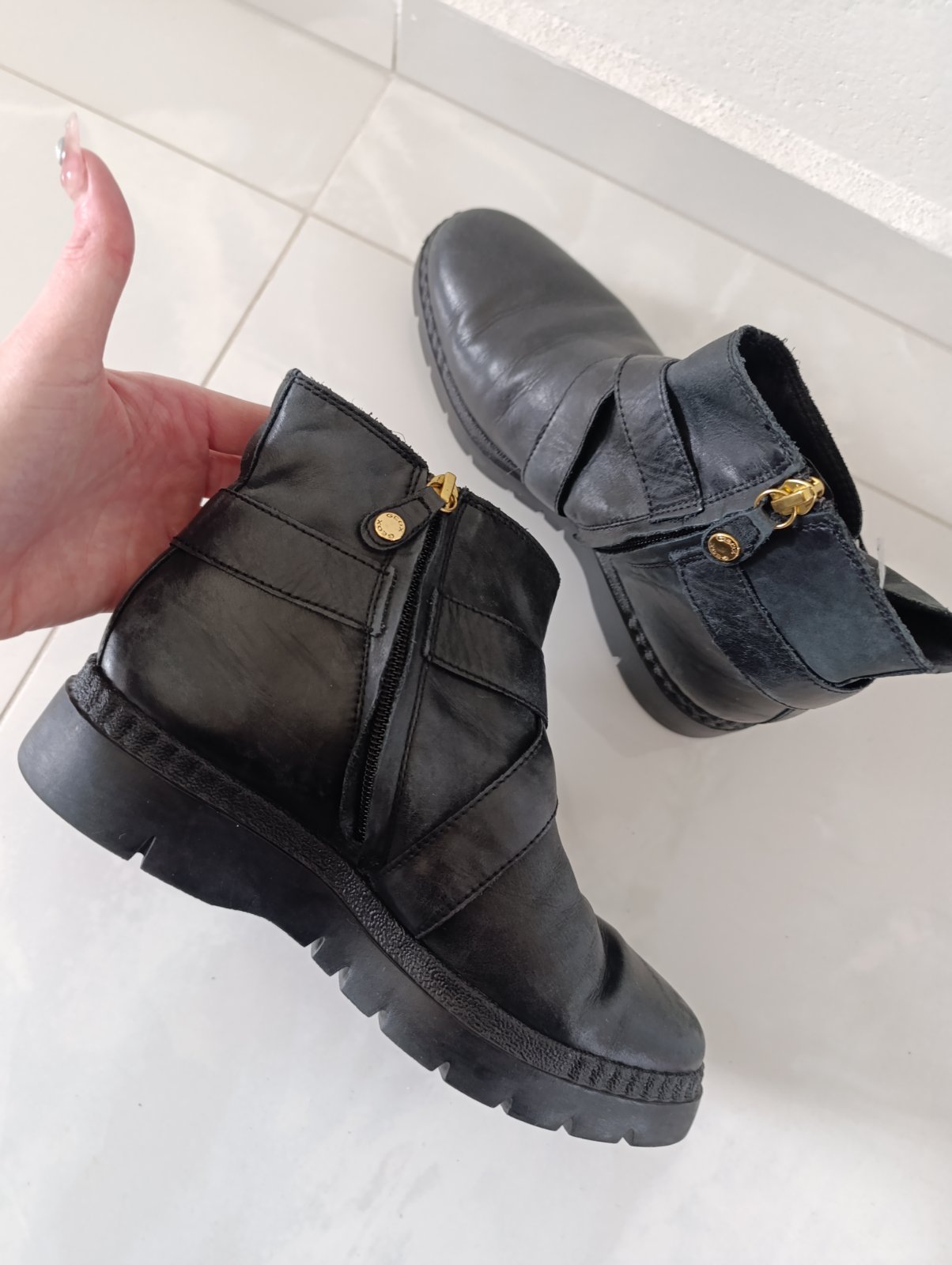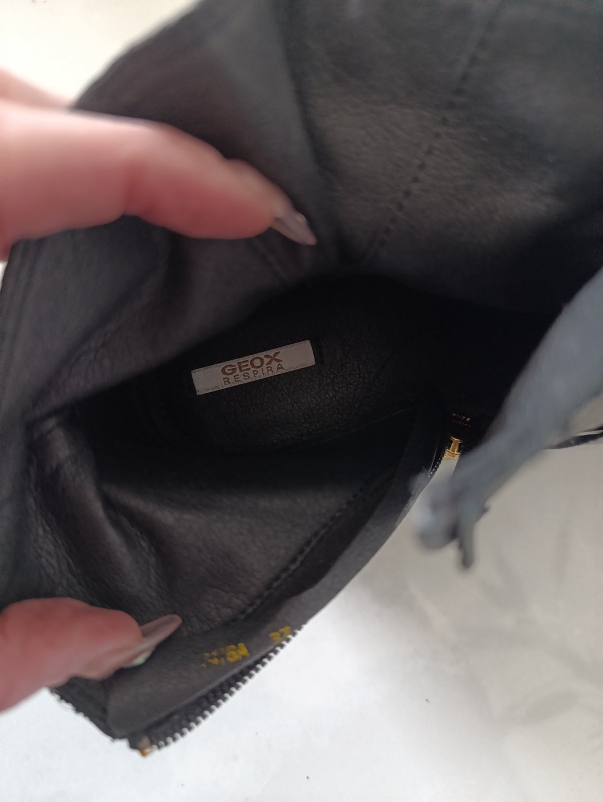Vysoké čierne kožené čižmy GEOX, zips nieje až do vrchu, hore vzadu je široká guma, takže sa krásne prispôsobia a sadnú na nohu na pravej čižme sa trošku odťahuje pliešok, ktorý bude treba zalepiť ...