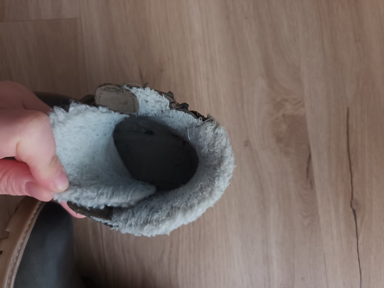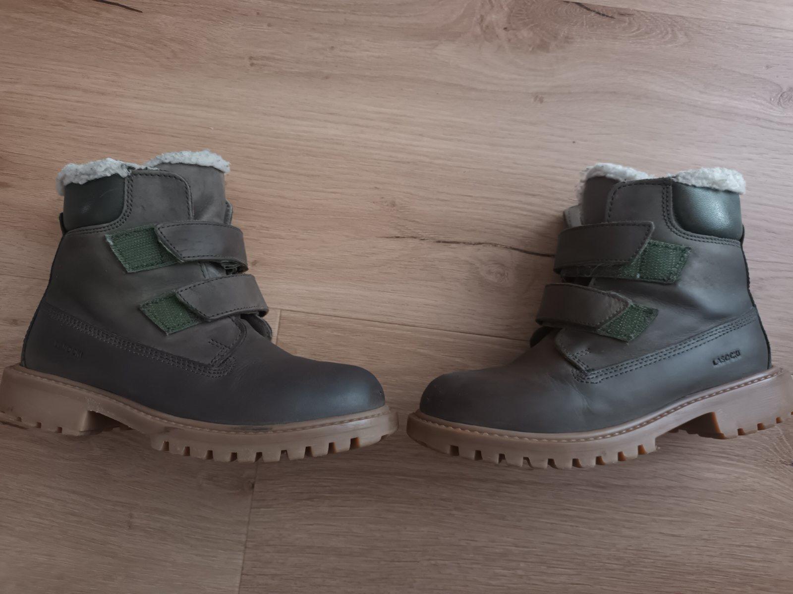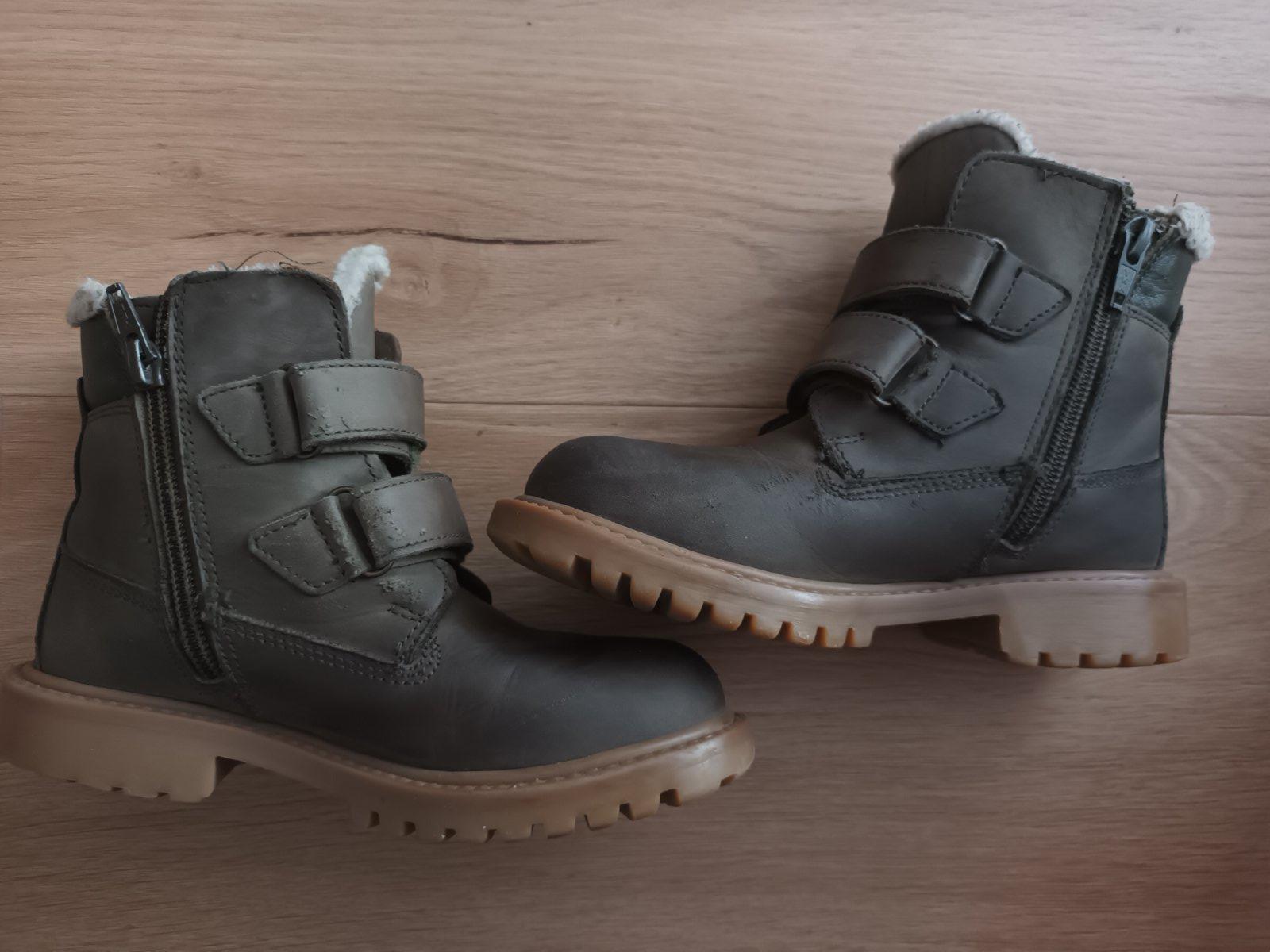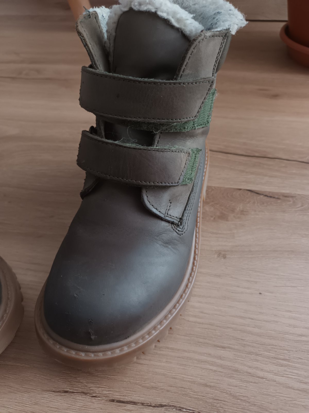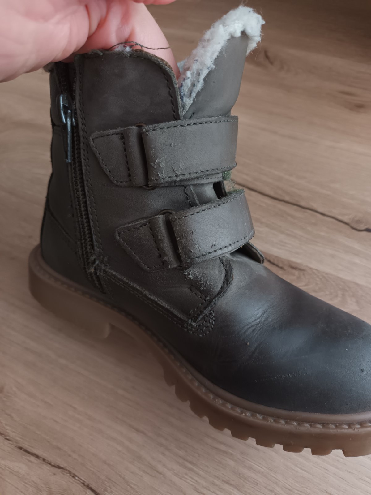 Kožené zateplené topánky so zipdom na boku a spredu suchým zipsom, jednu sezónu nosené. Veľkosť 30. Chyby sú vyfotené všetky, vpredu špička ľavá noha, a oderky na suchých zipsoch.