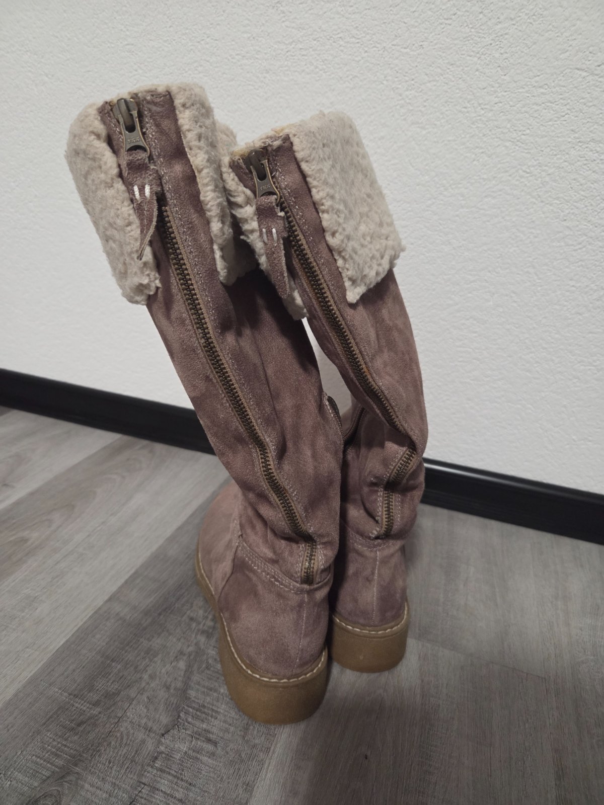 Predám 2 krát obuté pohodlné hnedé semišové čižmy nad koleno. Veľkosť 39. Pôvodná cena 40€. Značka Deezee. Rozmery sú nasledovné: Hrúbka podrážky: 2 cm Obvod zvršku (cm): 32 cm Obvod v členku (cm...