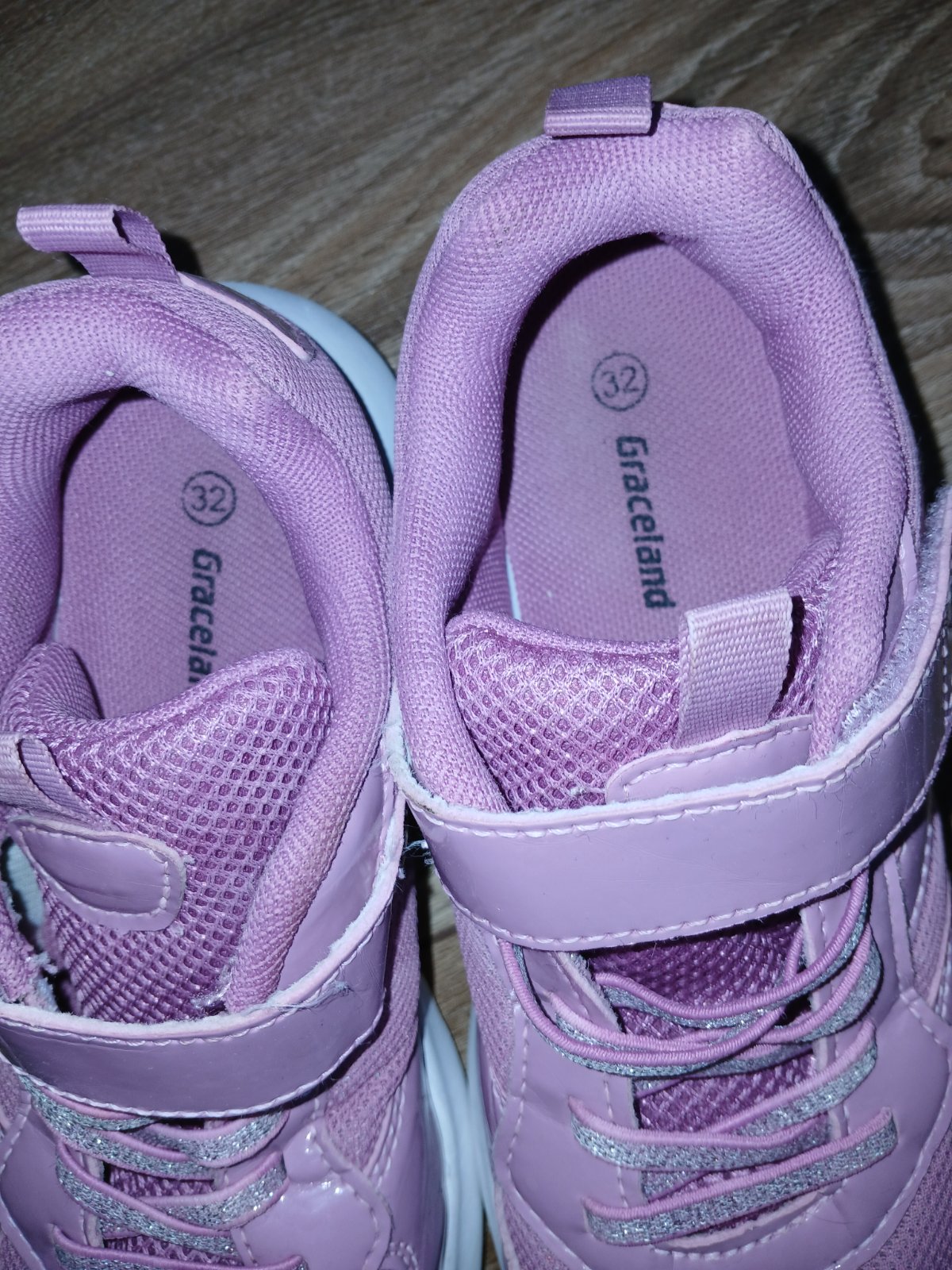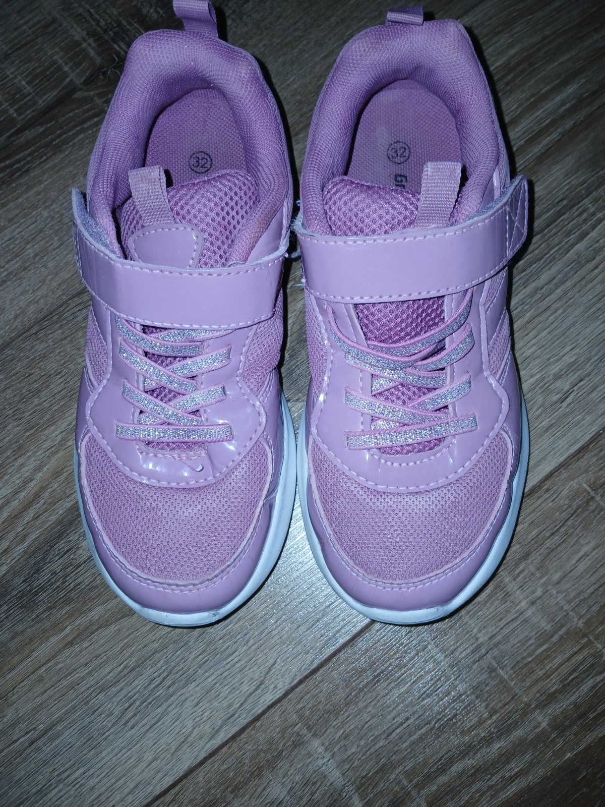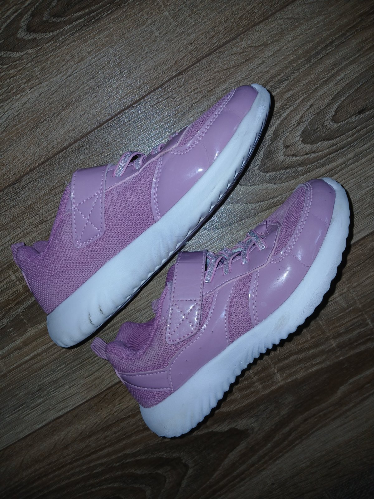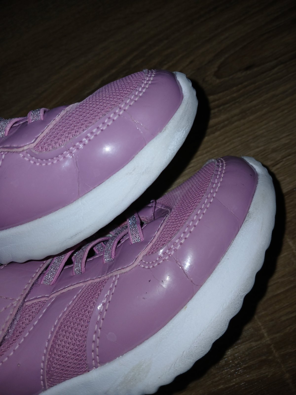 Tenisky nosene na telocvik,biela podrazka. Lahucke,priedusne,vycistene. Maju jemnucke mini prasklinky na lakovanom povrchu,vzniknute nosenim. Je to iba esteticka vada,nebrani dalsiemu noseniu. Podla mna velmi pekny stav,kludne do skoly alebo na telesnu. Vnutorna dlzka 20,5cm.