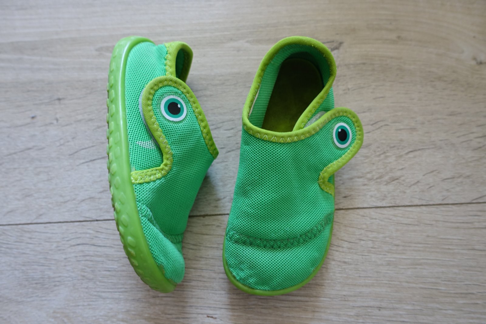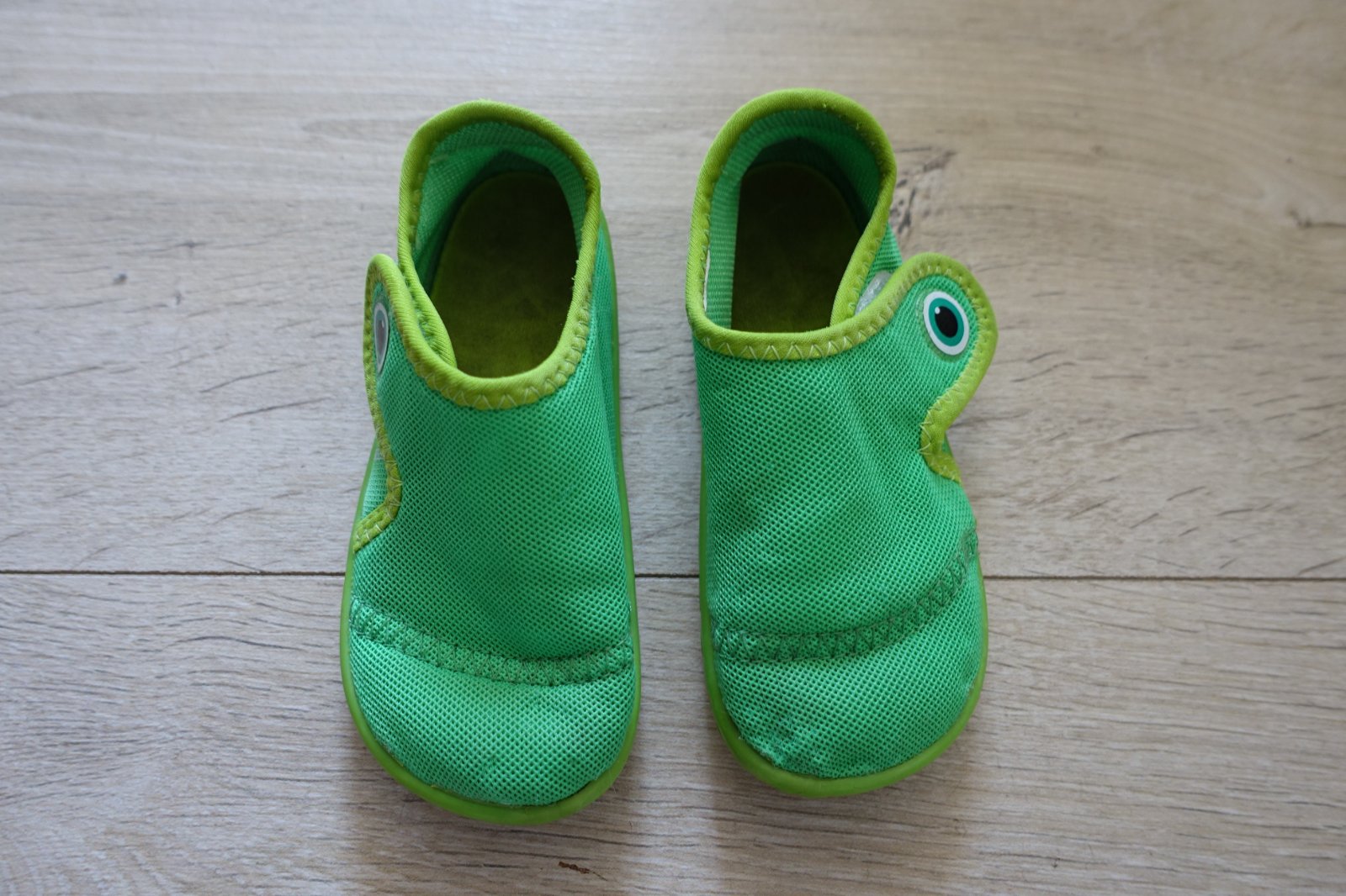 Predám stredne zelené topánočky do vody, v predu sú širšie, kupované v Decathlone. Boli nosené, žiaľ sú vhodné len pre nenáročnú mamičku. Vo vnútri vložka je tmavšia, nepoužívala som na to nič agresívne, boli očistené len mydlovou vodou. A zo zadu sú žiaľ na podrážke pri pätičke viac zošúchané, ale nie sú deravé. Donosiť sa určite ešte dajú. Viď foto... Žiaľ číslovanie presné neviem, štítok som odstrihla, riaďte sa prosím rozmermi. VD 16,3 cm.