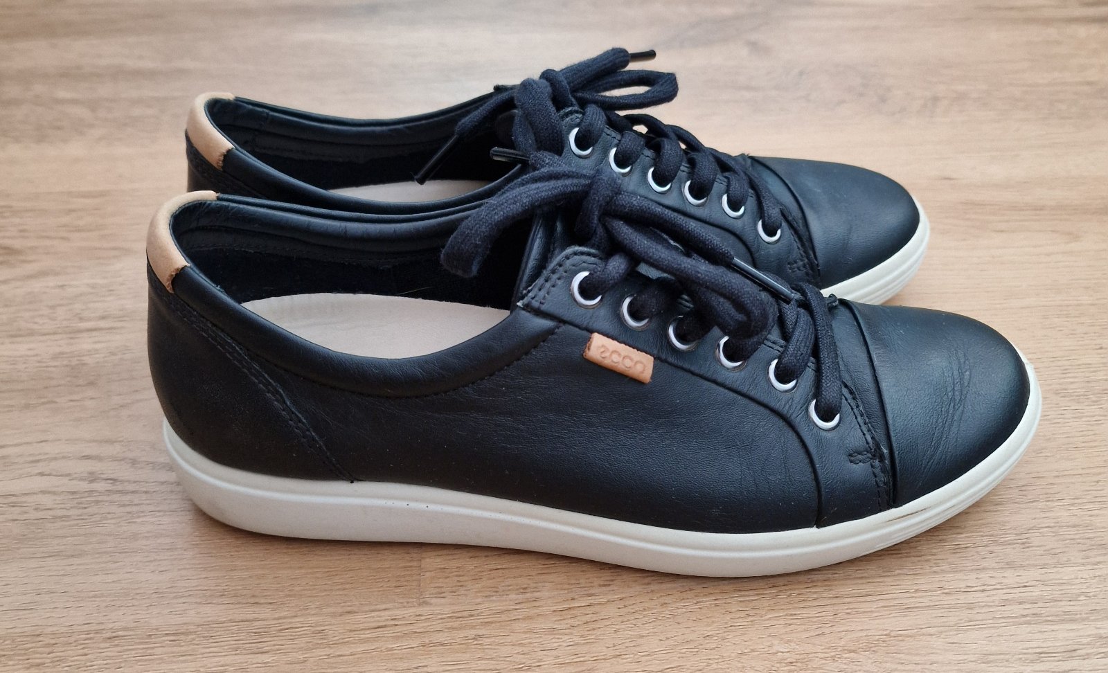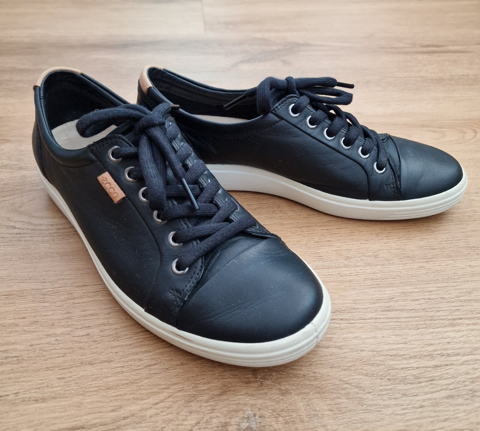 Predám ikonické kožené tenisky Ecco, veľ. 39, super stav, nosené 1 sezónu na striedačku s inými. Vn. dĺžka 24,5 cm. Cena 49,99 € plus poštovné.