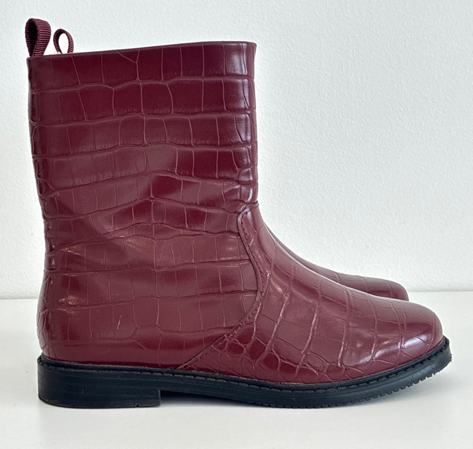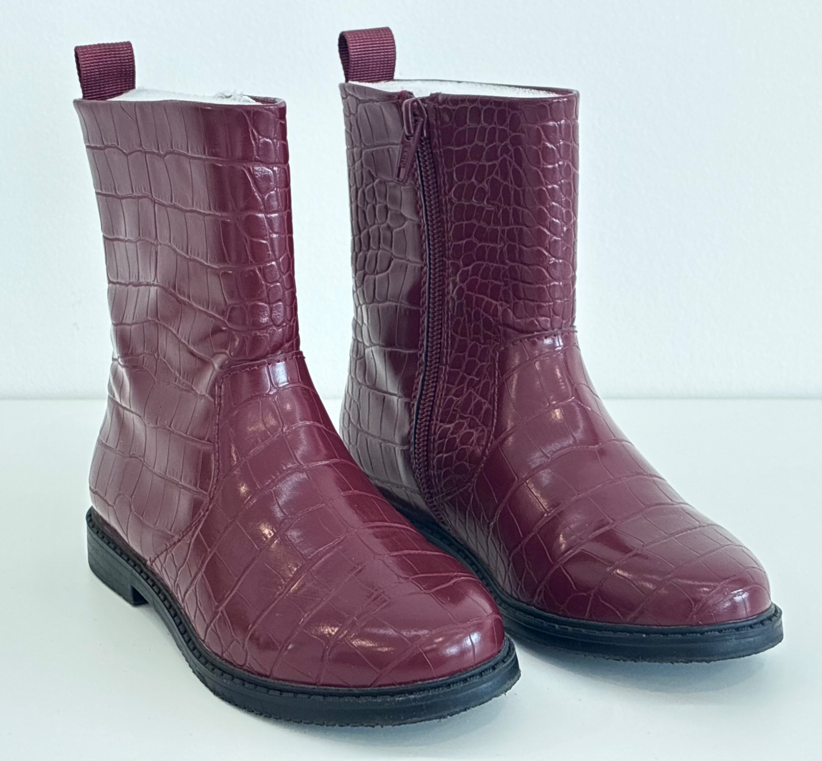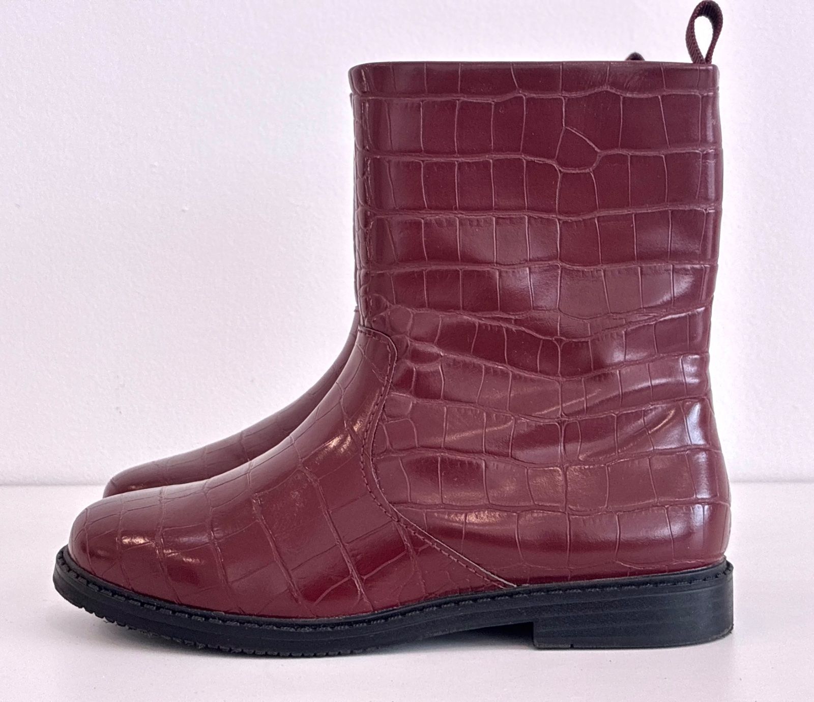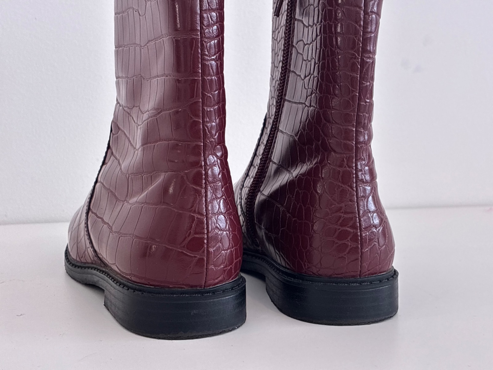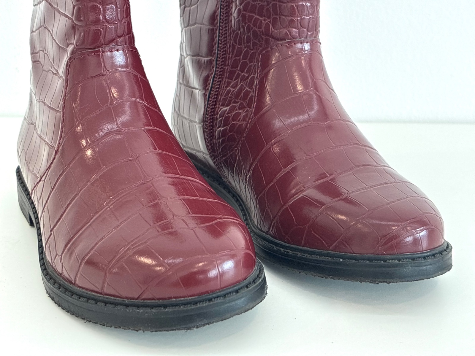 Bordové lesklé čižmy z imitácie kože. Zapínanie na zips. Bodšívka z velúru. Vo výbornom stave.