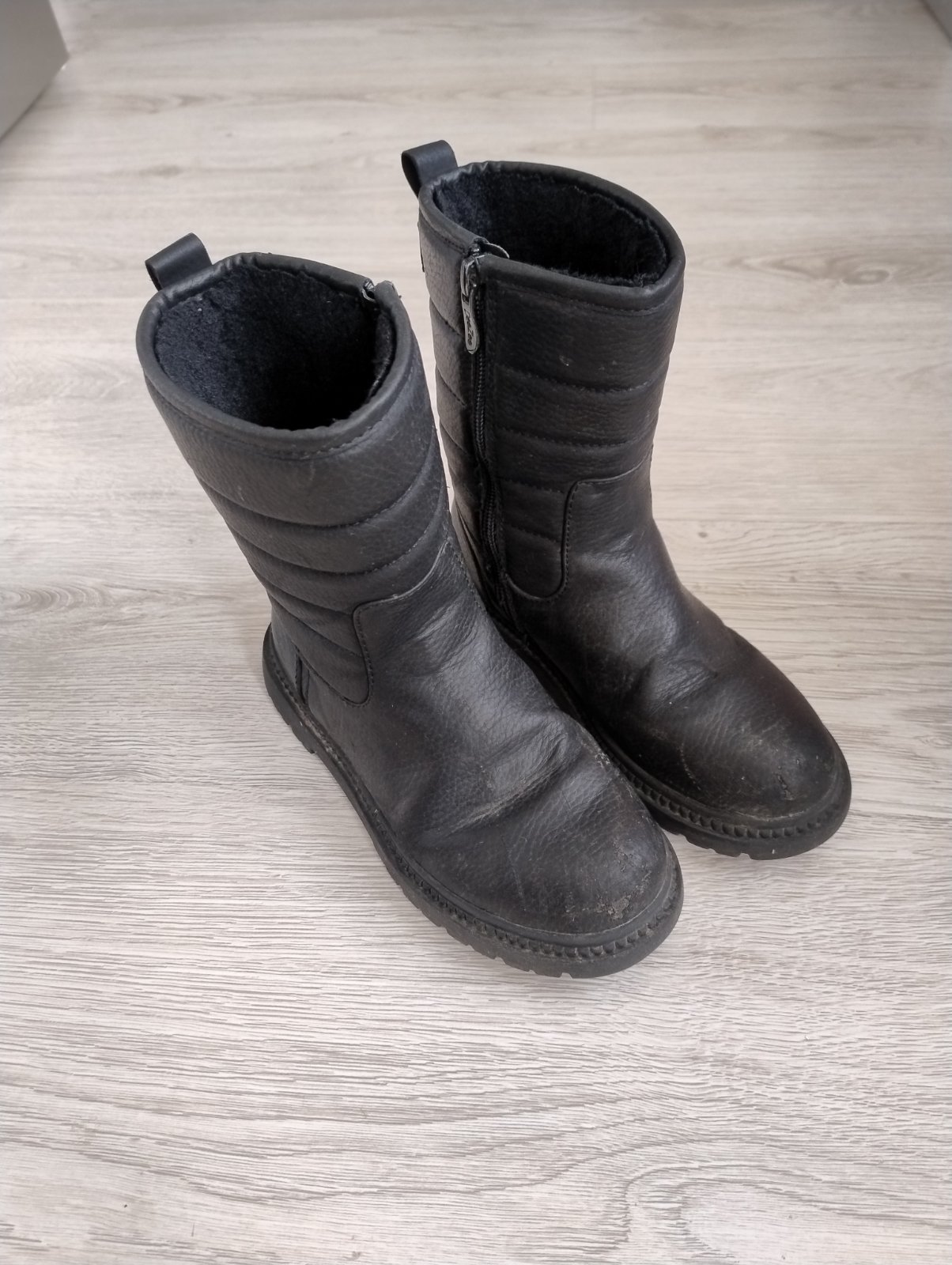 Zateplené čižmičky, vpredu poskodena koža, ešte poslúžia, vnut.dlzka 22cm,