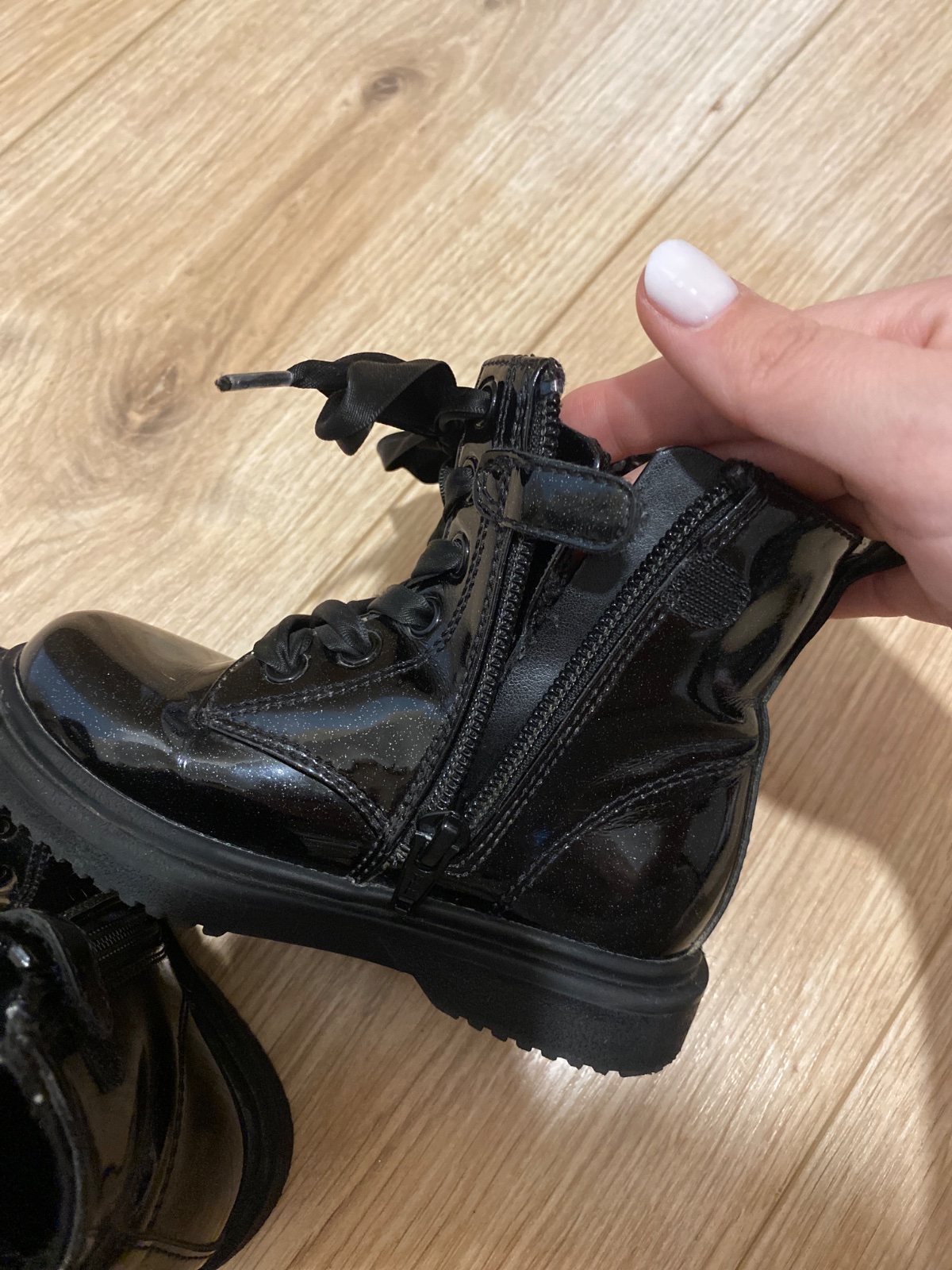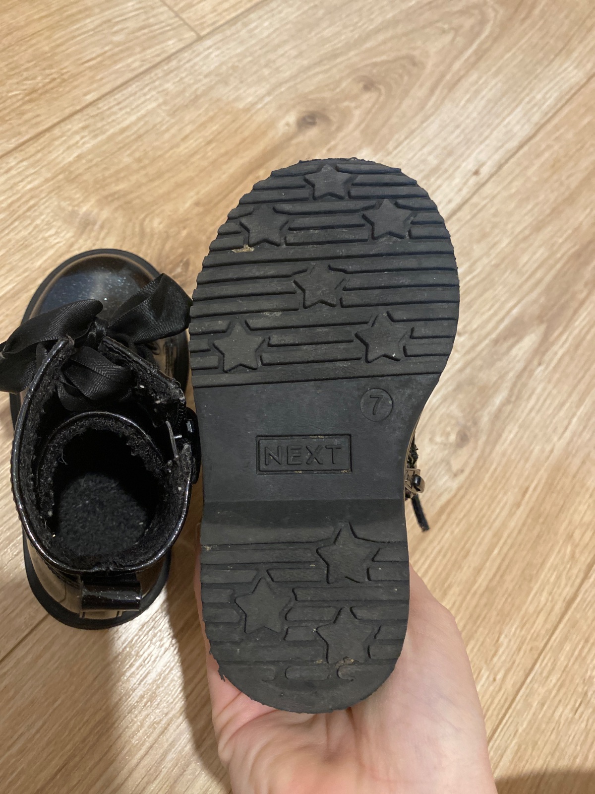 Krásne leskle Next cizmicky s teplou kozusinkou zvonka. Vzadu maslicka, nasupovacie. Vonkajšia dlzka 18cm.