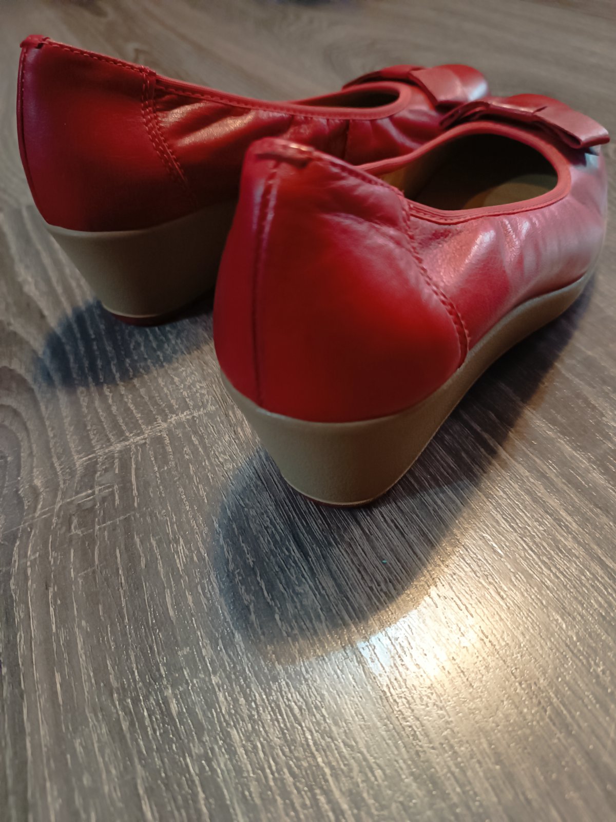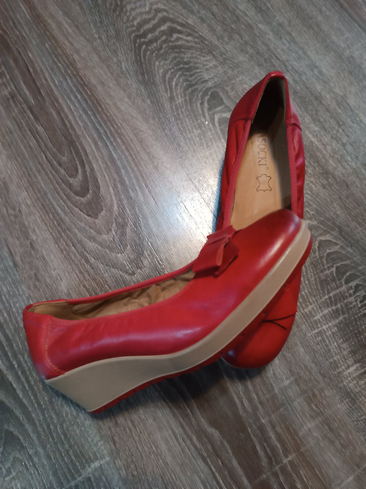 Krásne dámske lodičky červenej farby, opätky sú svetlo hnedé, vysoké 9 cm. Podrážka - platforma je 2 cm a je zakrytá, obtiahnutá materiálom ako sú topánky - brúsenou kožou. Krásne sedia na nohe. Ob...