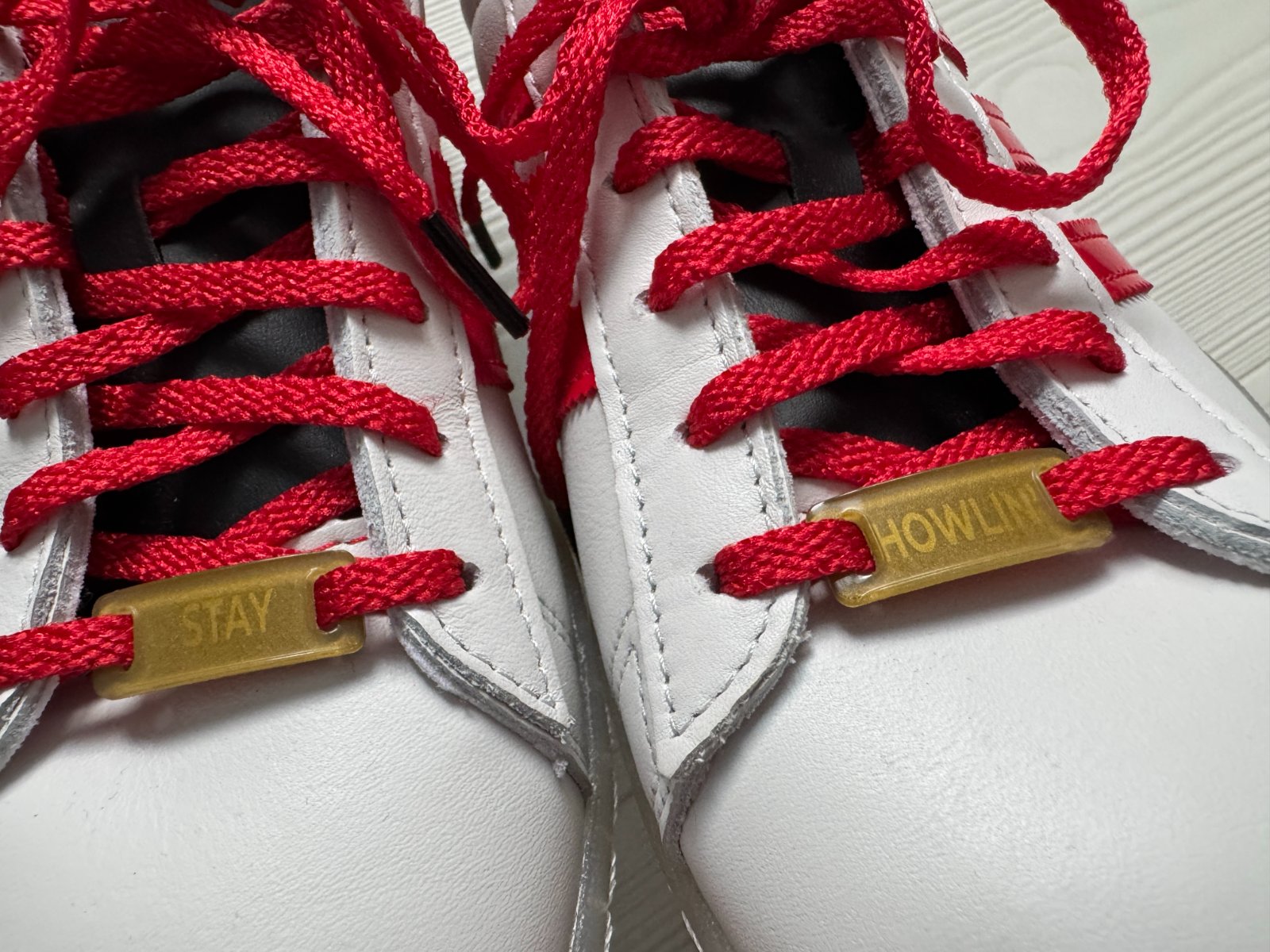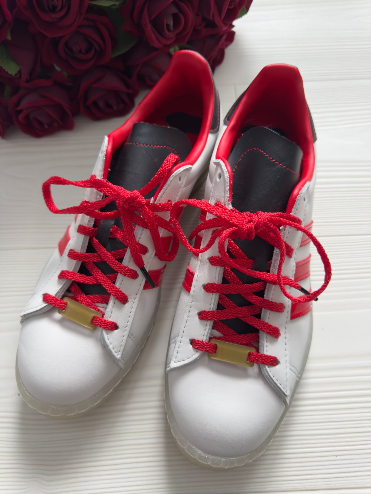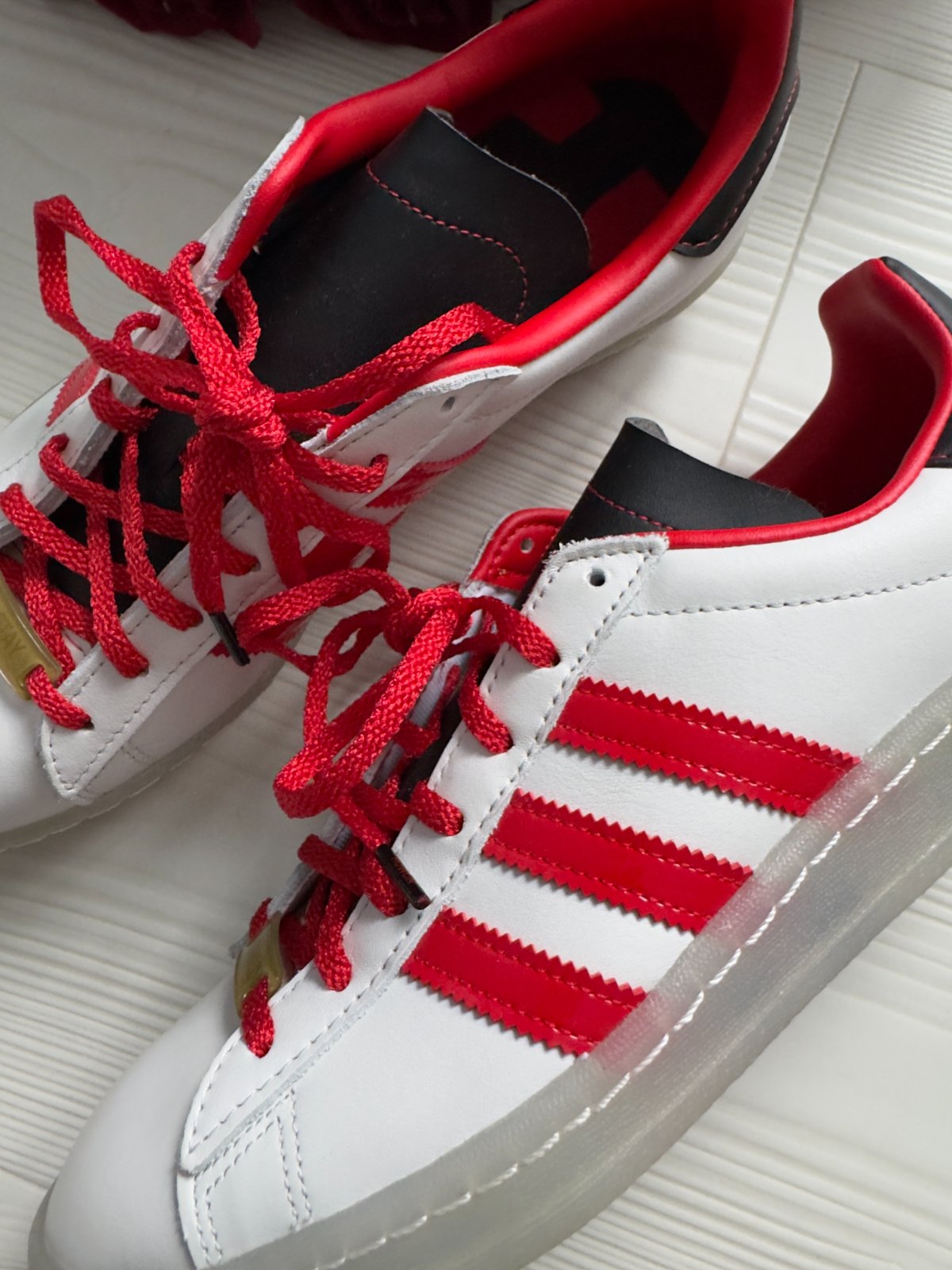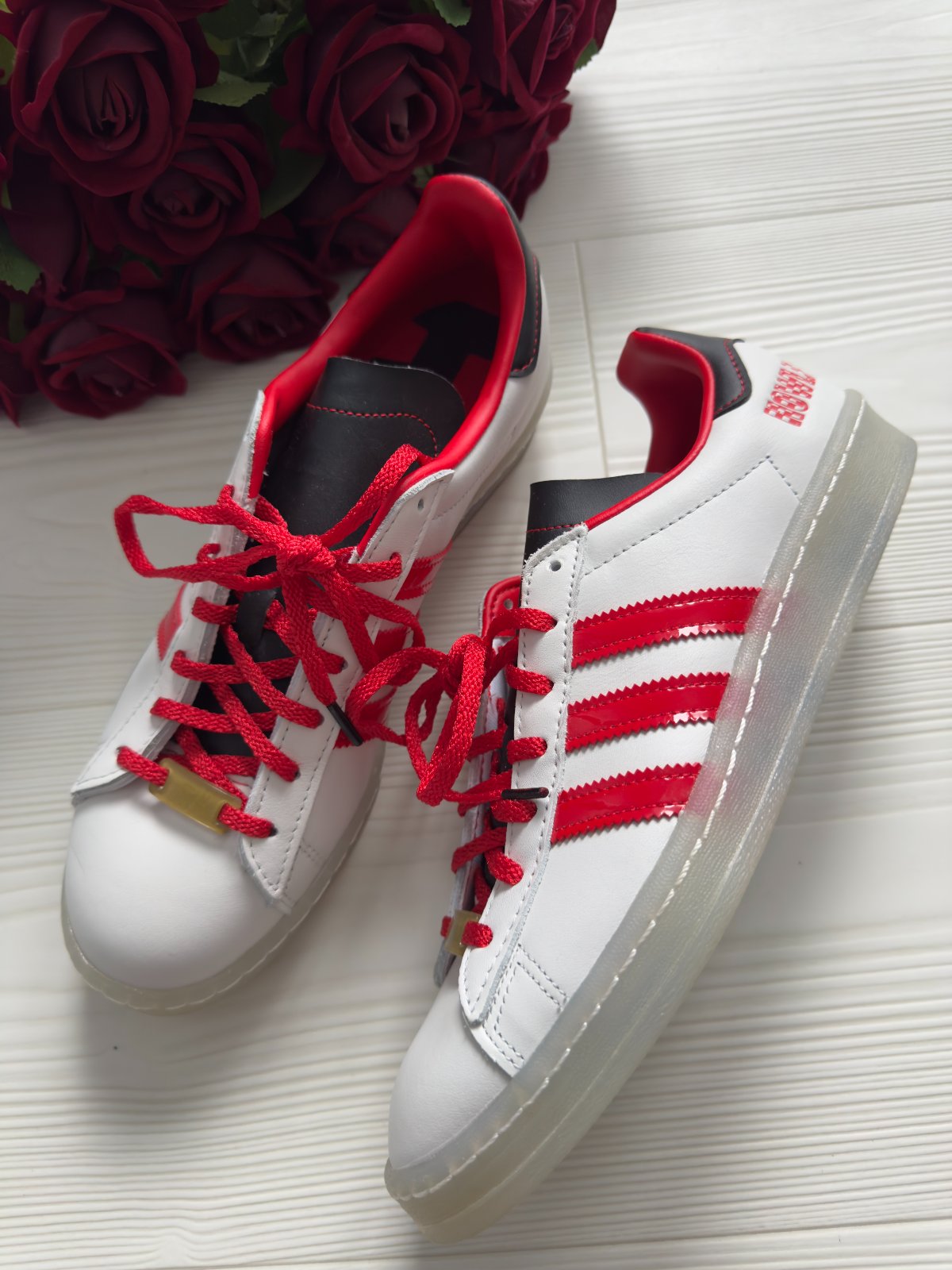 Nízke tenisky od adidas Originals s názvom Campus v bielej farbe s červenými a čiernymi časťami.