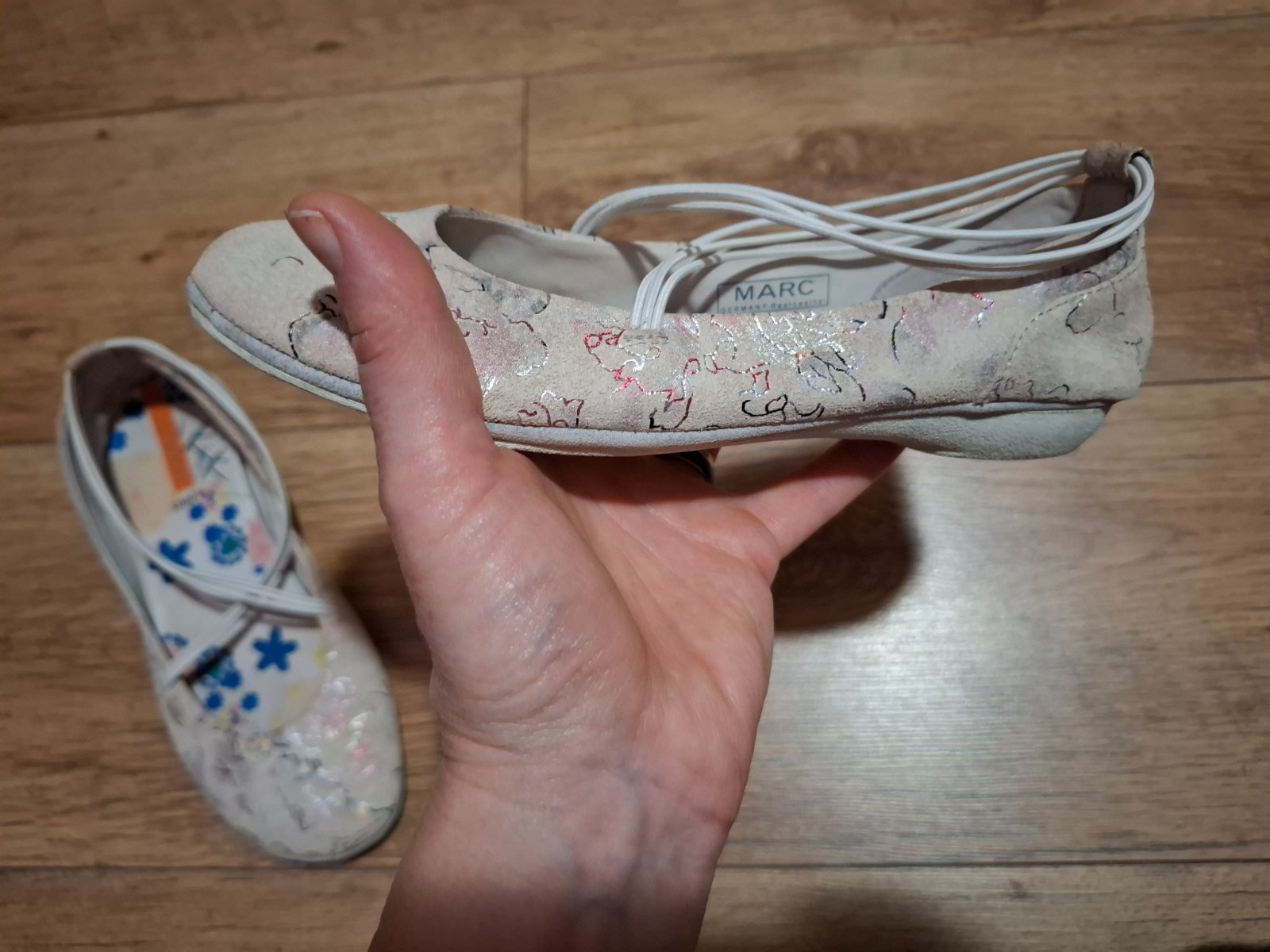 Predám balerínky nemeckej značky MARC z brúsenej kože. Koža je aj zvnútra. Majú zaujímavý lesklý farebný kvetinový vzor/kresbu, naschvál asymetrický, tz.pravá nie je zrkadlovo rovnaká s ľavou, viď fotky. Vnútorná dĺžka je 22,5-23 cm. Vložky nie sú vyberateľné. Sú vhodné aj pre širšie chodidlo, prepadnutú klenbu. Pred vyskakovaním ich na nôžke istia gumičky.