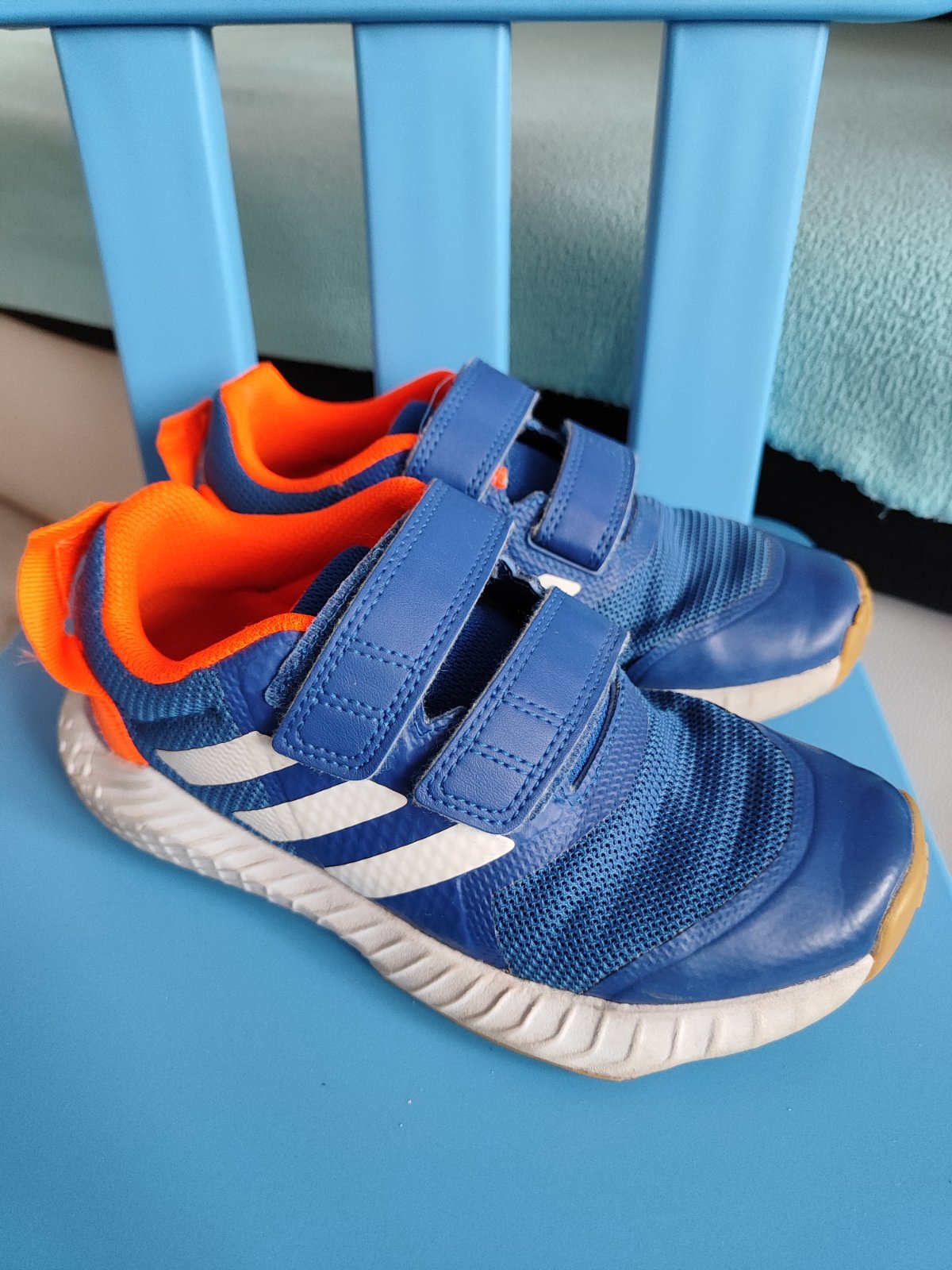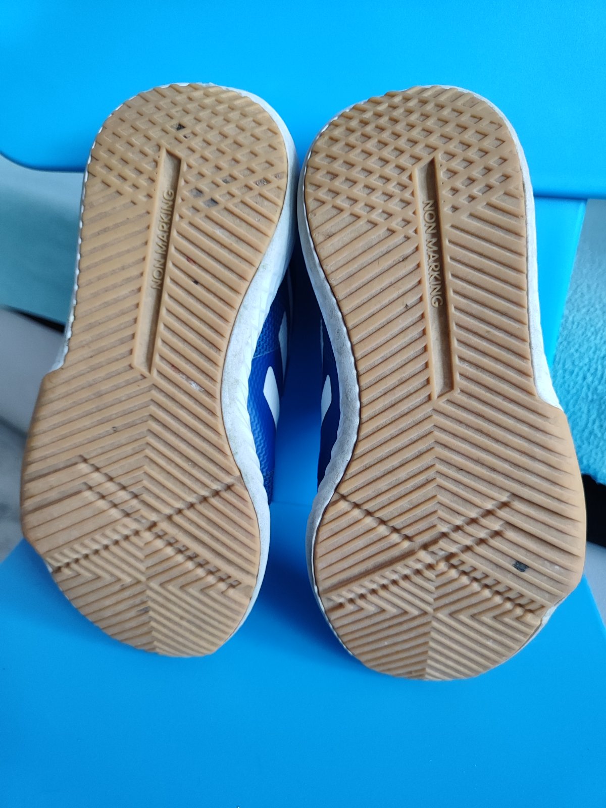 Halová športová obuv adidas FORTAGYM CF K pre aktívne deti. Nefarbiaca gumová podrážka je odolná a zapínanie na suchý zips zaručí ľahké prezúvanie. Vnútorná dĺžka 20cm. Pár krát obuté v super stave, len na ľavej teniske je malinký kúsok odštipnuté zo špičky. Nič hrozné to nie je. Na telesnú alebo do haly na akýkoľvek šport budú perfektné.