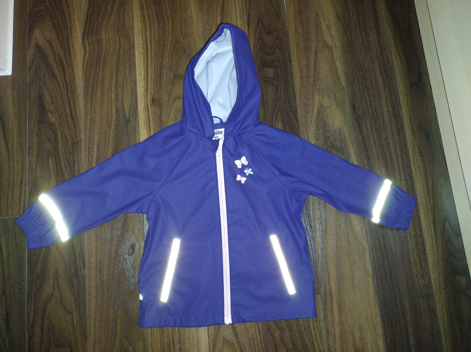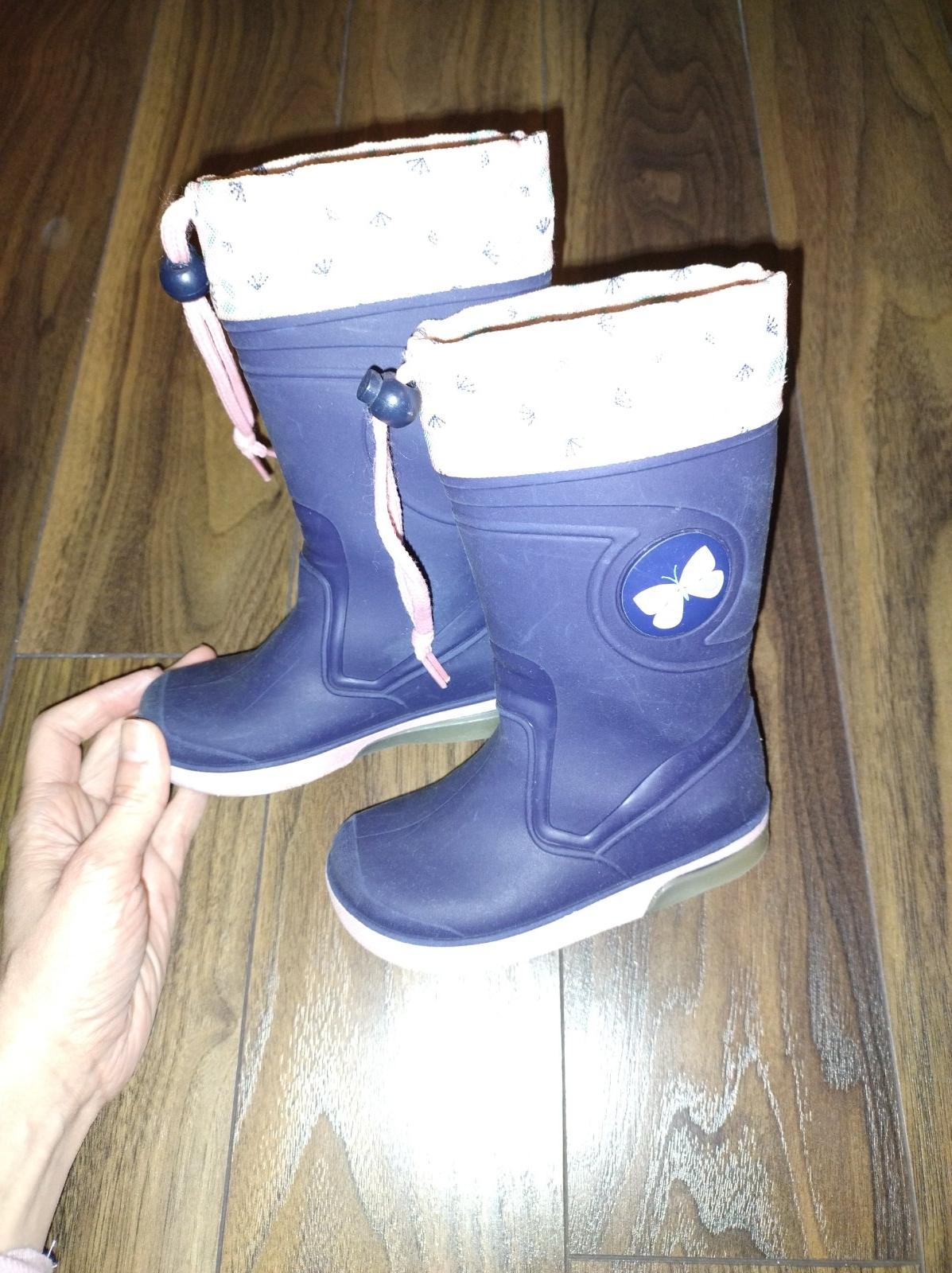 Posúvam set gumáky + tenká nepremokavá bunda pre dievčatko. Gumáky nosené, podrážka svieti pri pohybe, brzdičky na šnúrkach doinštalované, VD 15 cm. Bunda nosená minimálne. Veľkosť 86/92.