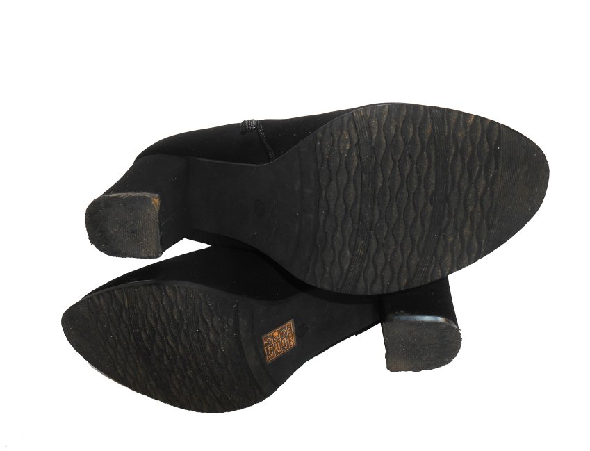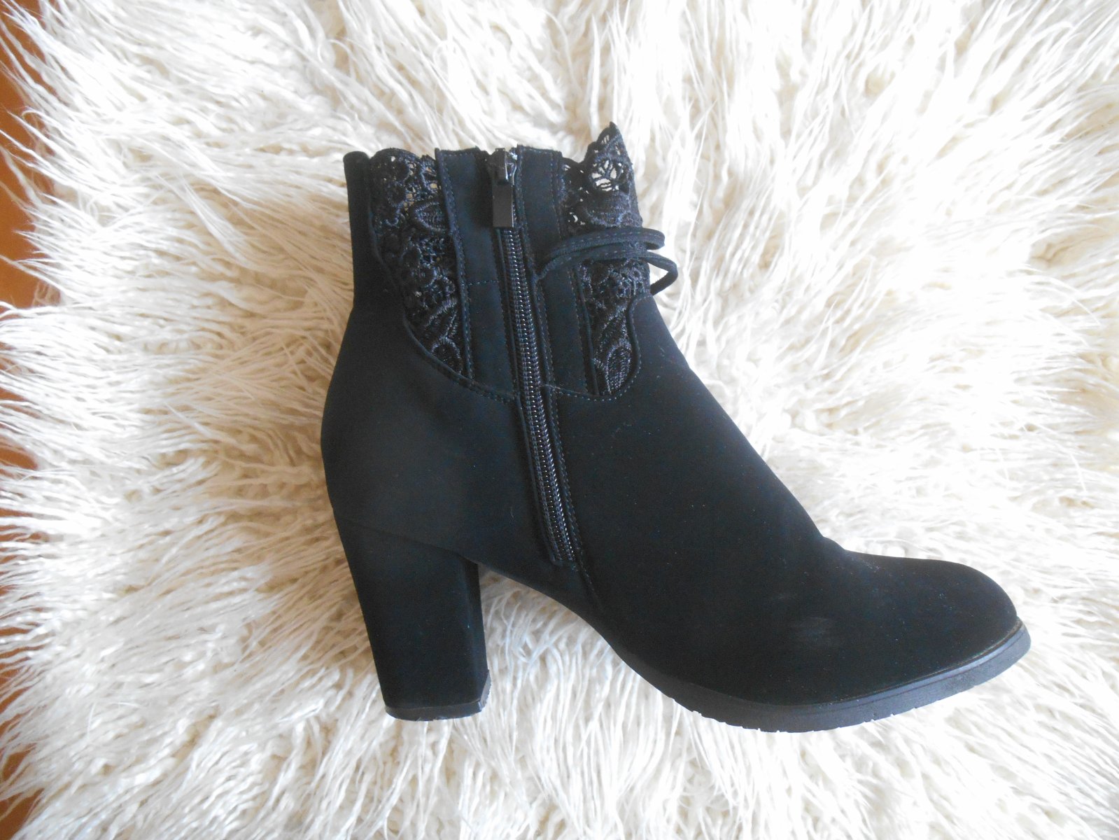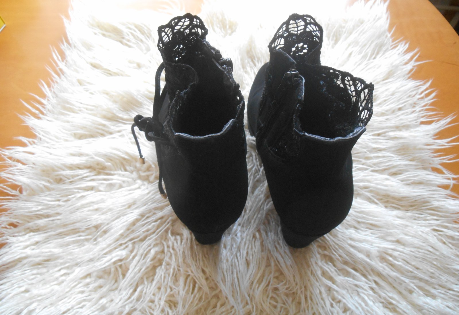 predám dámske semišové členkové čižmy na prechodné obdobie, zachovalý nosený stav, mierne ošuchy na vnútornej strane, píšu veľkosť 39, značka Bosido Aru 41, farba čierna, dekorované krajkou, zapínanie na zips, výška opätku 8 cm, vnútorná dĺžka 22.5 cm