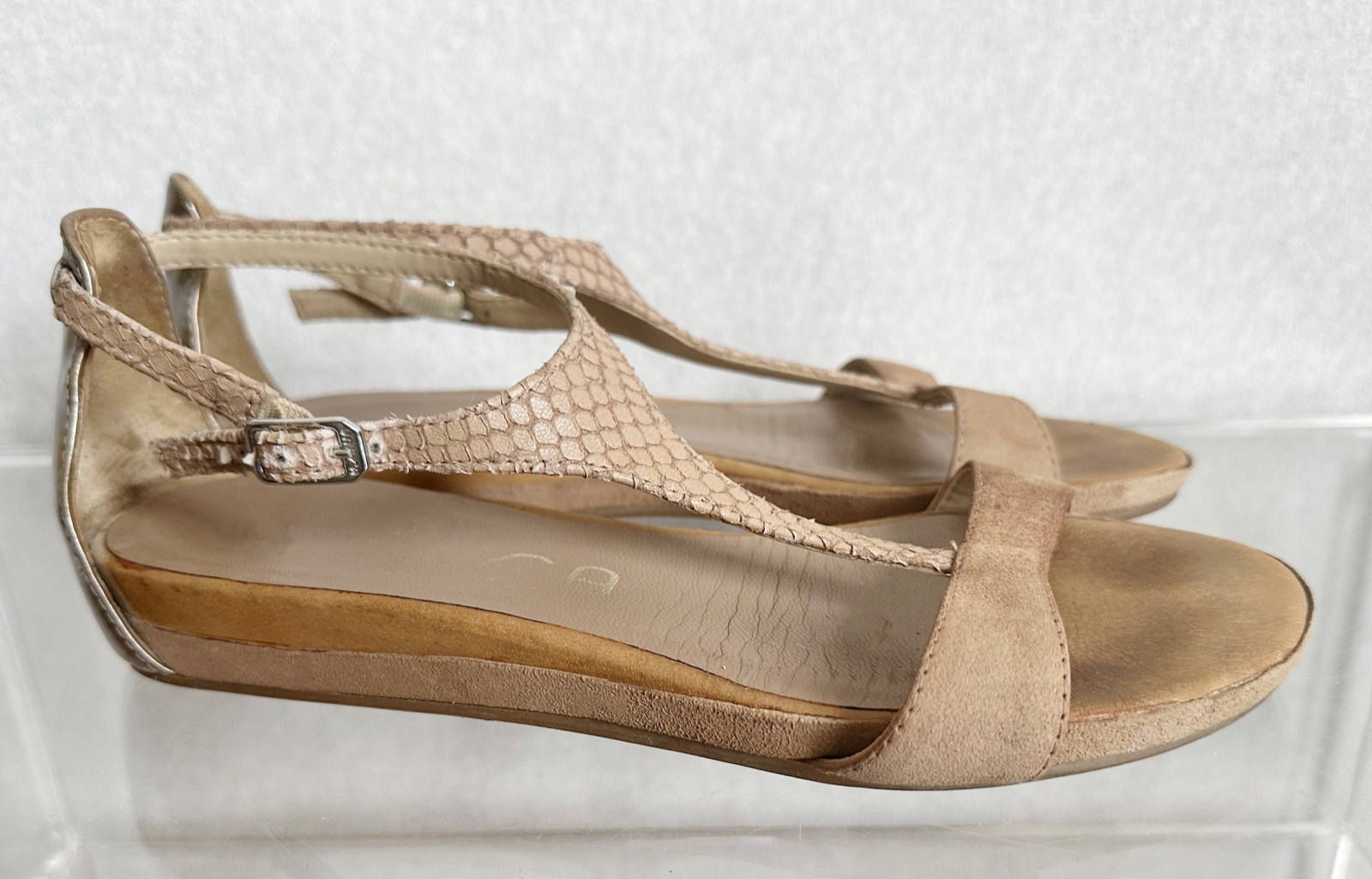 Pohodlné sandálky so zapínaním okolo členku. Boli nosené, stále v peknom nositeľnom stave. Vzadu na päte tesne nad podrážkou majú pár drobných odreniniek, inak bez viditeľných poškodení. Darujem k nákupu nad 10 Eur alebo samostatne 5 Eur.