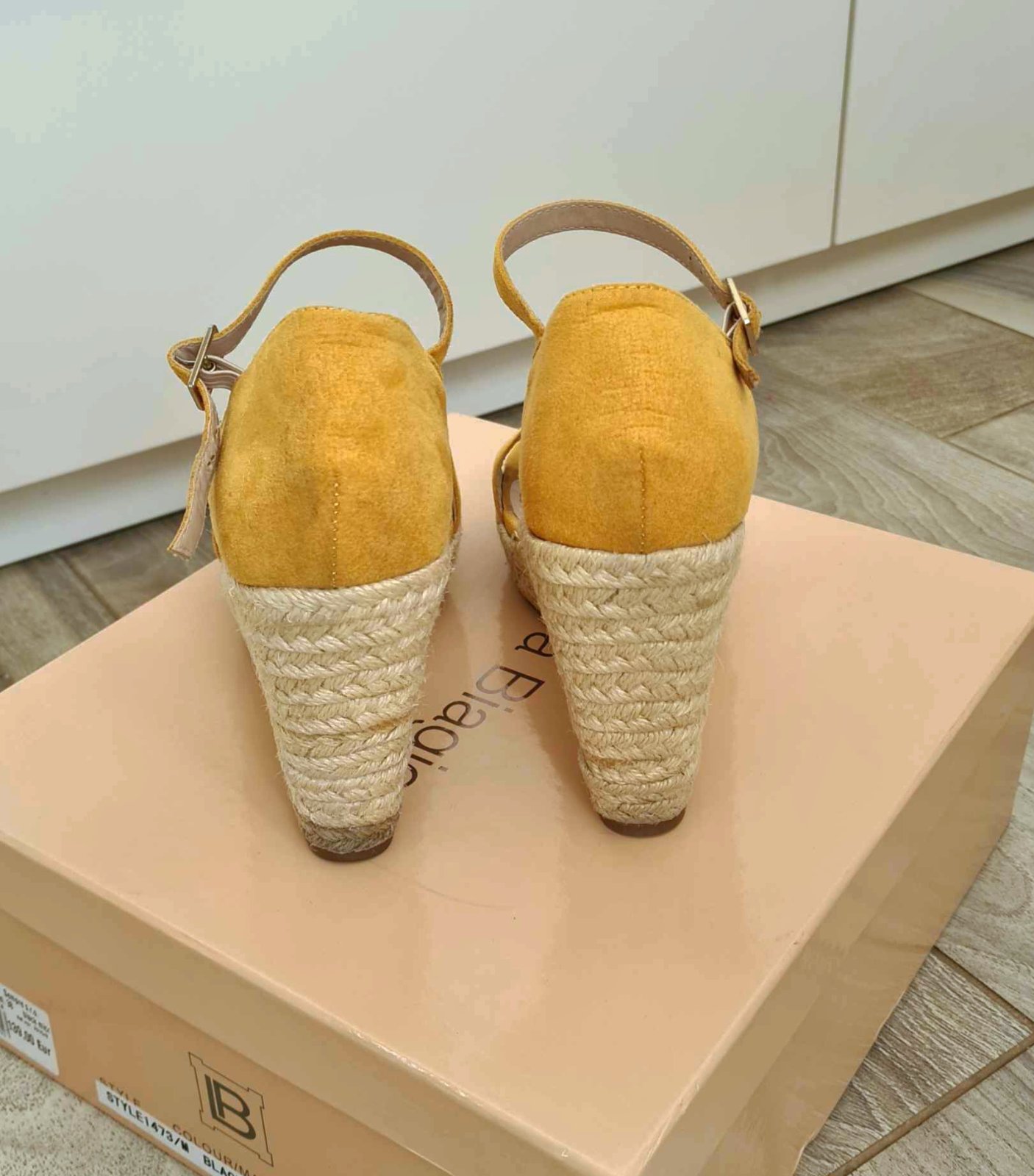 Predám čisto nové sandále horčicovej/žltej farby. Sandále sú kožené, nikdy nenosené, počas materskej nemám priestor ich využiť a stoja mi iba v skrini... Veľ. 38., s prackou okolo členku, hrubší op...