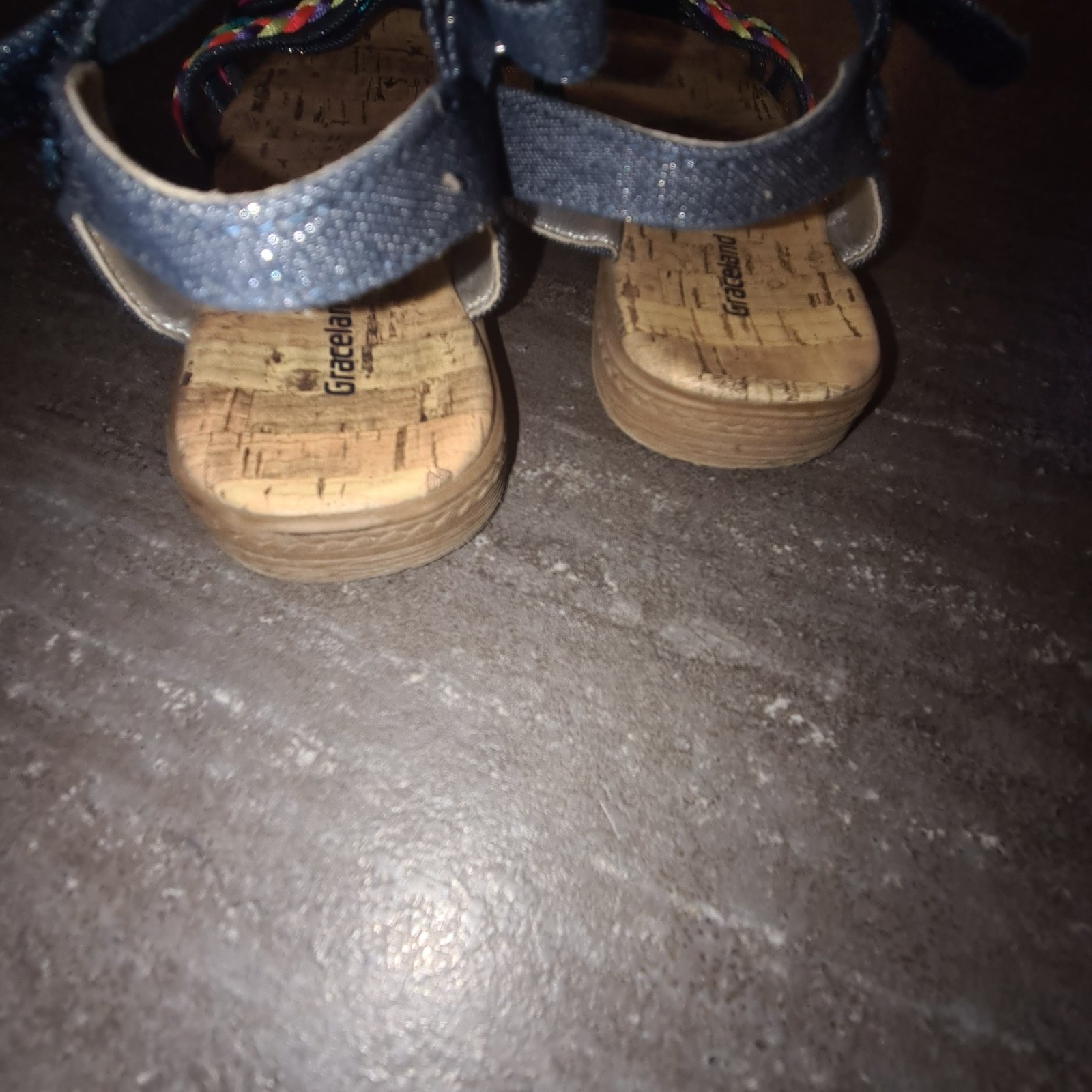 Krásne riflove sandalky, malo nosené, vpredu je trosku šuchnuta špička je to na fotke. Inak nie sú ani východné ani inak zničené