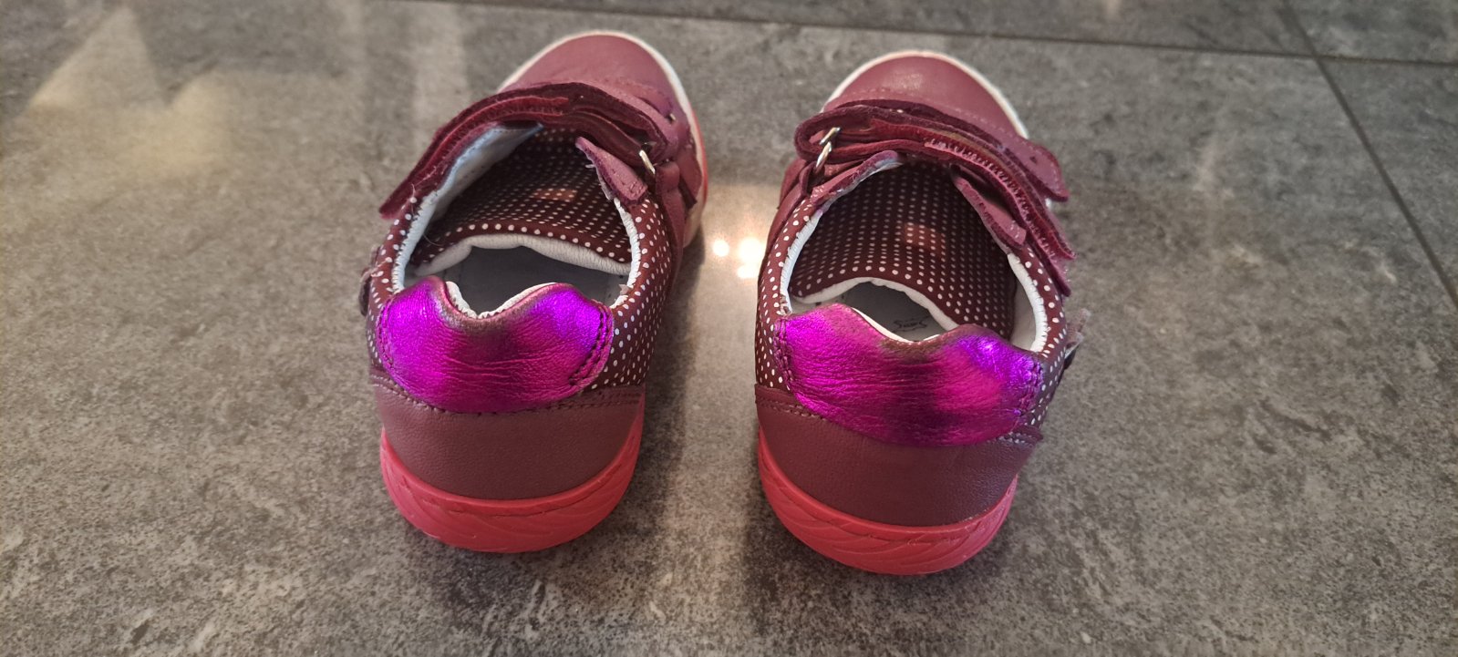 Topánky boli nosené , podrážka už je mierne odratá, aj koža vnutri je trochu popukana. Z vonku niesu okopane ,ani sa neodliepaju. Myslím,že na dvor ešte poslúžia . Všetko pofotene a zohľadnené v cene
