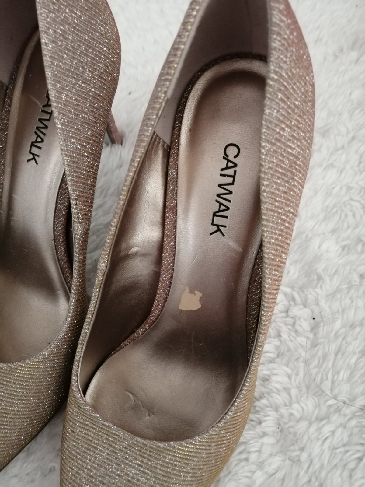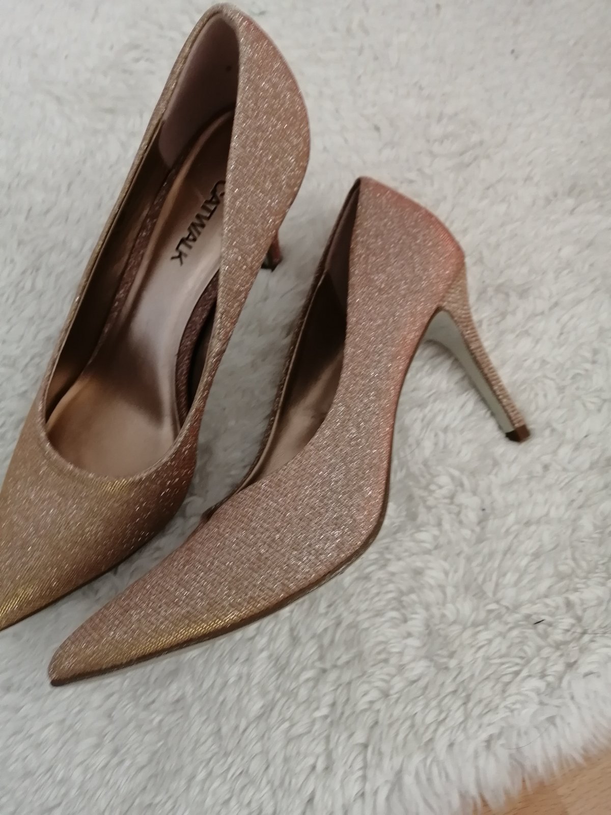 - pár krát obuté v peknom stave Nosenie poznať na spode a to zotreta farba vid foto, ináč bez nejakých vád - farba Champagne zlata - pekne oživia outfit Vnútorná dĺžka 23,5cm na doraz Výška opät...