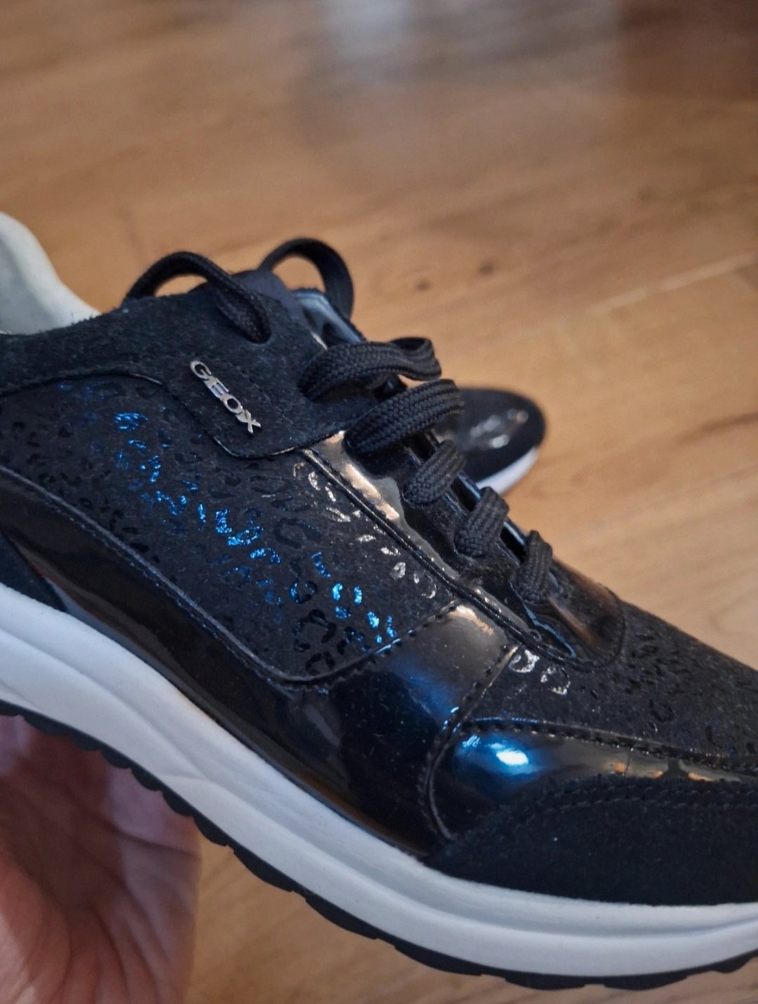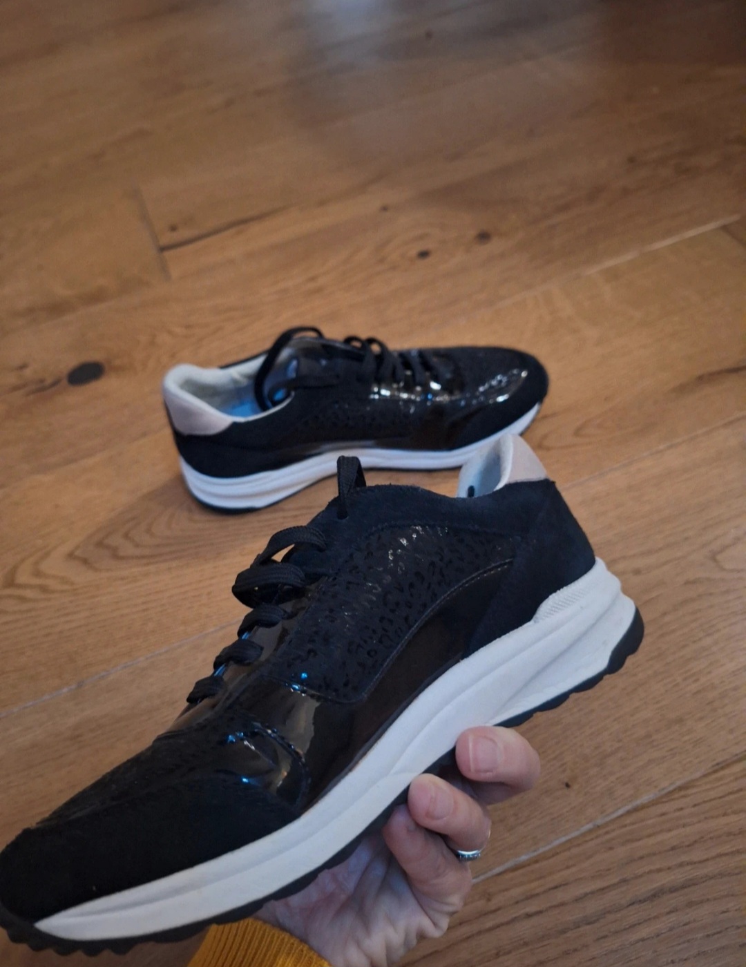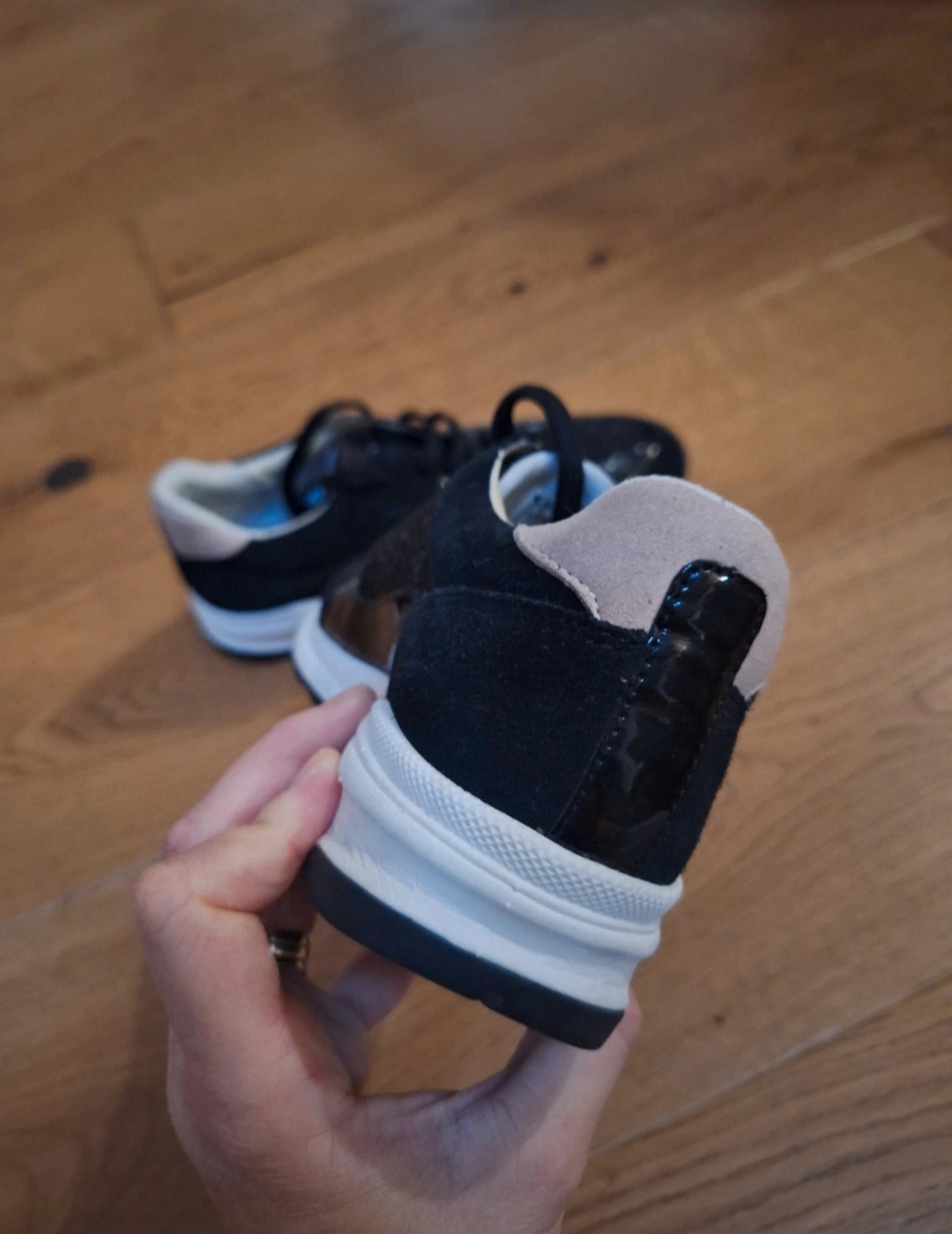 Tenisky v peknom stave po mojej dcére, kombinácia čiernej s lesklou látkou, maju zvnútra jemne oskretie(vid foto),nic hrozne.