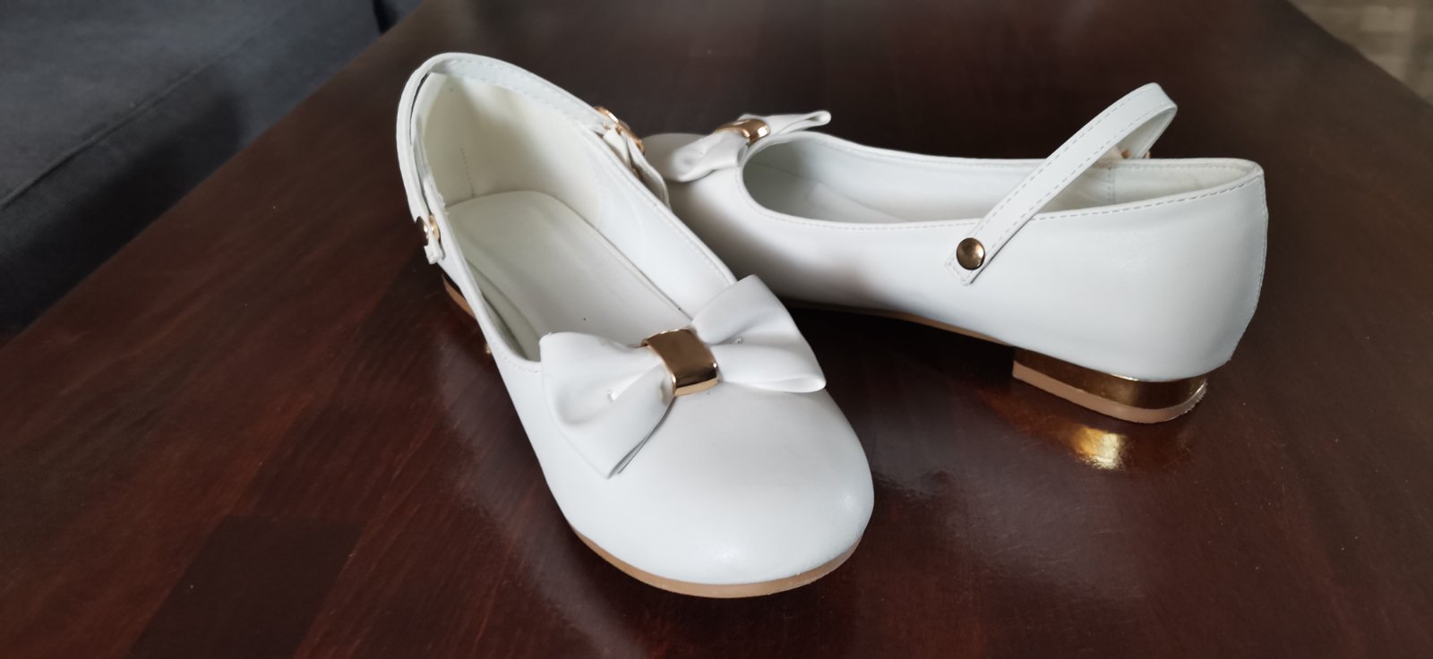 Predám dievčenské spoločenské topánky. Sú biele so zlatými doplnkami. Par krát použité. Jemne vpredu ošuchané.