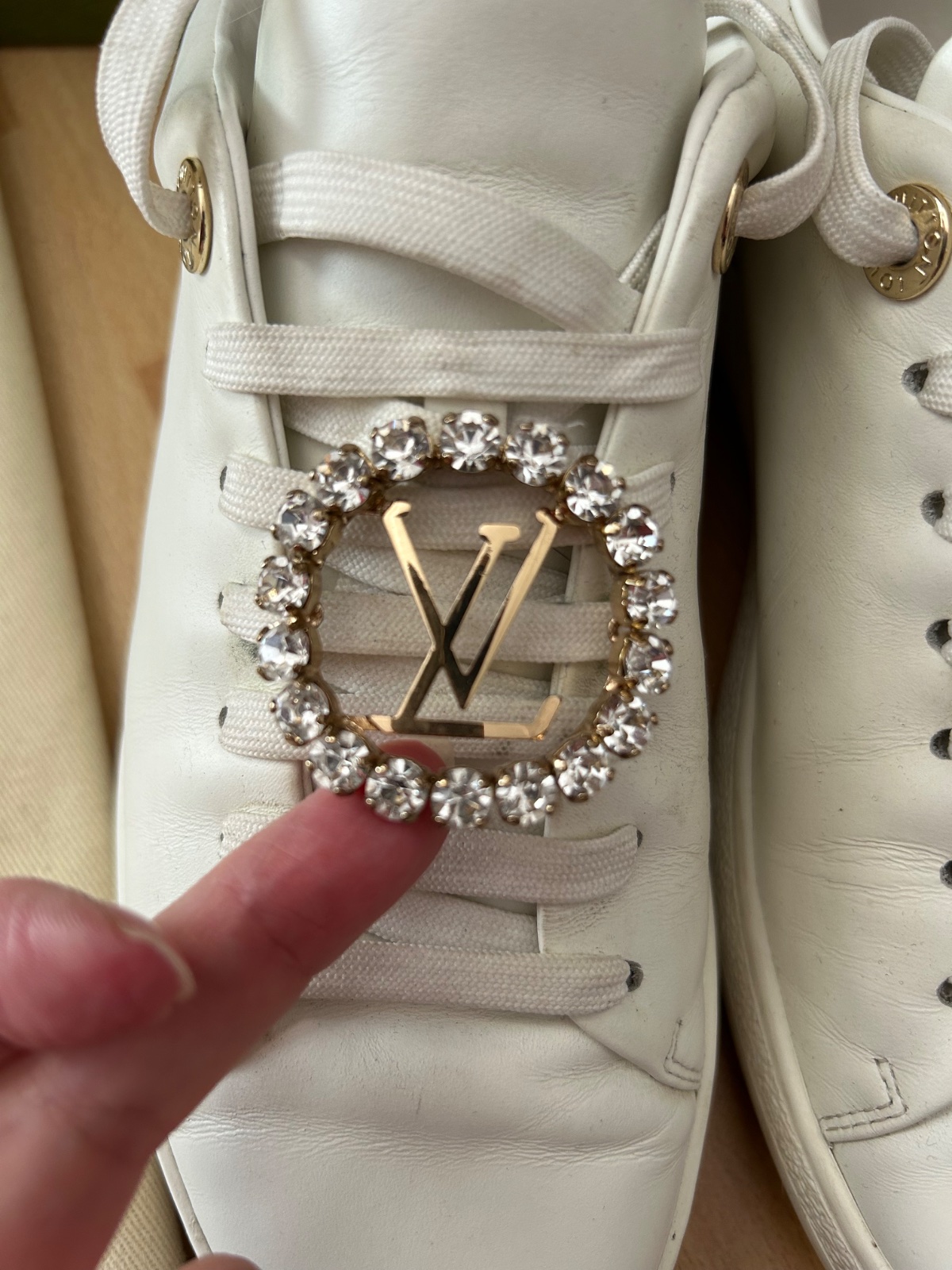 ⚜️Luxusné kožené tenisky originál Louis Vuitton veľkosť 37 čo aj sedí. Obuté iba pár krát, čiže ako nové. Nádherné zlaté kamienkové logo sa dá dať aj dole, je to iba navlečené na šnúrkach a možno využiť aj ako napríklad brošňa atď.