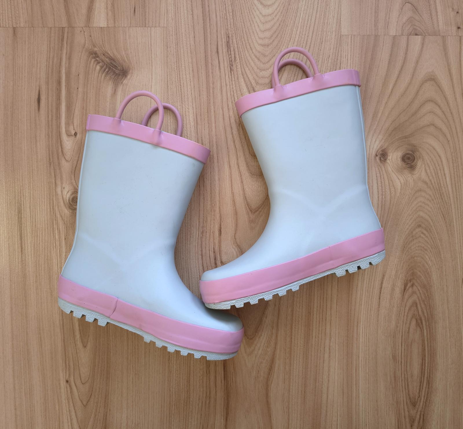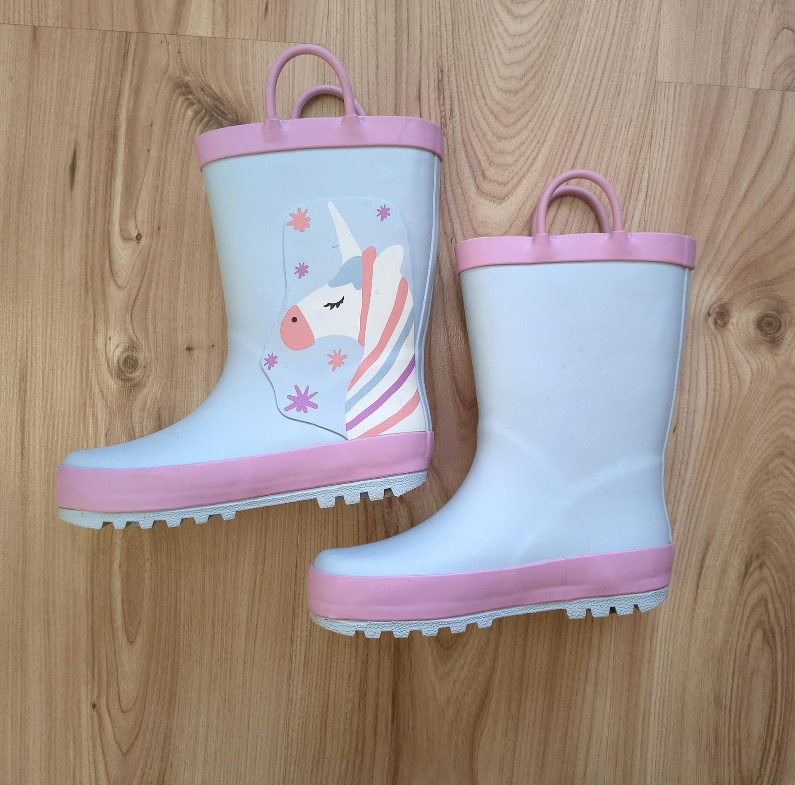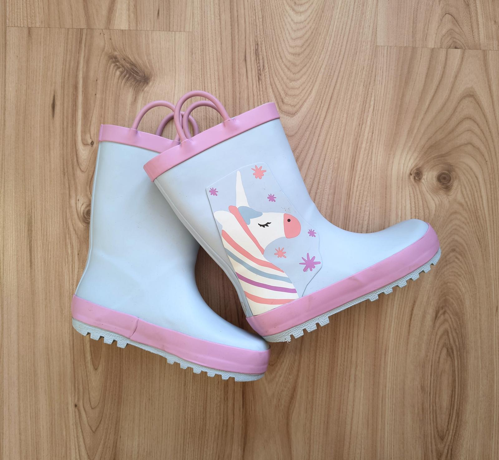 Krásne dievčenské gumáky, v jemnej kombinácii bledomodrej a svetlofialovej, s obrázkom jednorožca. S praktickými uškami po bokoch pre ľahšie obúvanie/vyzúvanie. Obuté len pár krát, dcére rýchlo narástla noha, perfektný stav, nepoškodené. Veľkosť 28, vnút.dĺžka 17,9cm.