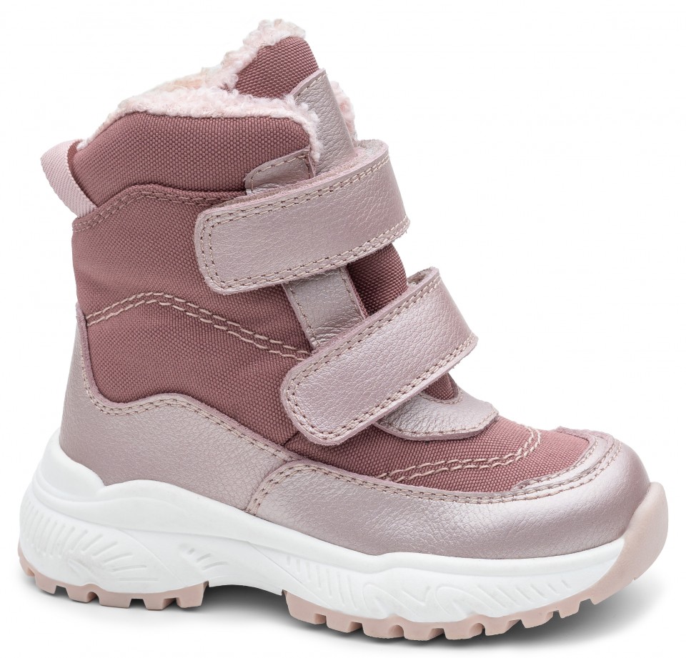 Dievčenské vychádzkové zimné topánky v kombinácii perleťovej a tmavoružovej farby. Sú vyrobené z hladkej kože v kombinácii s textilným materiálom. Topánky sú vyššieho strihu.Membrána PROTEX účinne chráni nohy pred dažďom a vlhkosťou. Suché zipsy pevne fixujú topánku na nohe. Vo vnútri majú mäkkú kožušinku a zateplenú, vyberateľnú flísovú stielku.Majú nový typ podošvy – okrúhla zvýšená podošva je protišmyková, odolná, ale zároveň ohybná. Špička topánok je chránená pred mechanickým poškodením.Na stielke je jemne podporená klenba chodidla.Obuv má pevný opätok, ktorý zabraňuje vybočeniu piat a udržuje chodidlo v správnom postavení.Obuv je vyrobená z kvalitných certifikovaných materiálov.