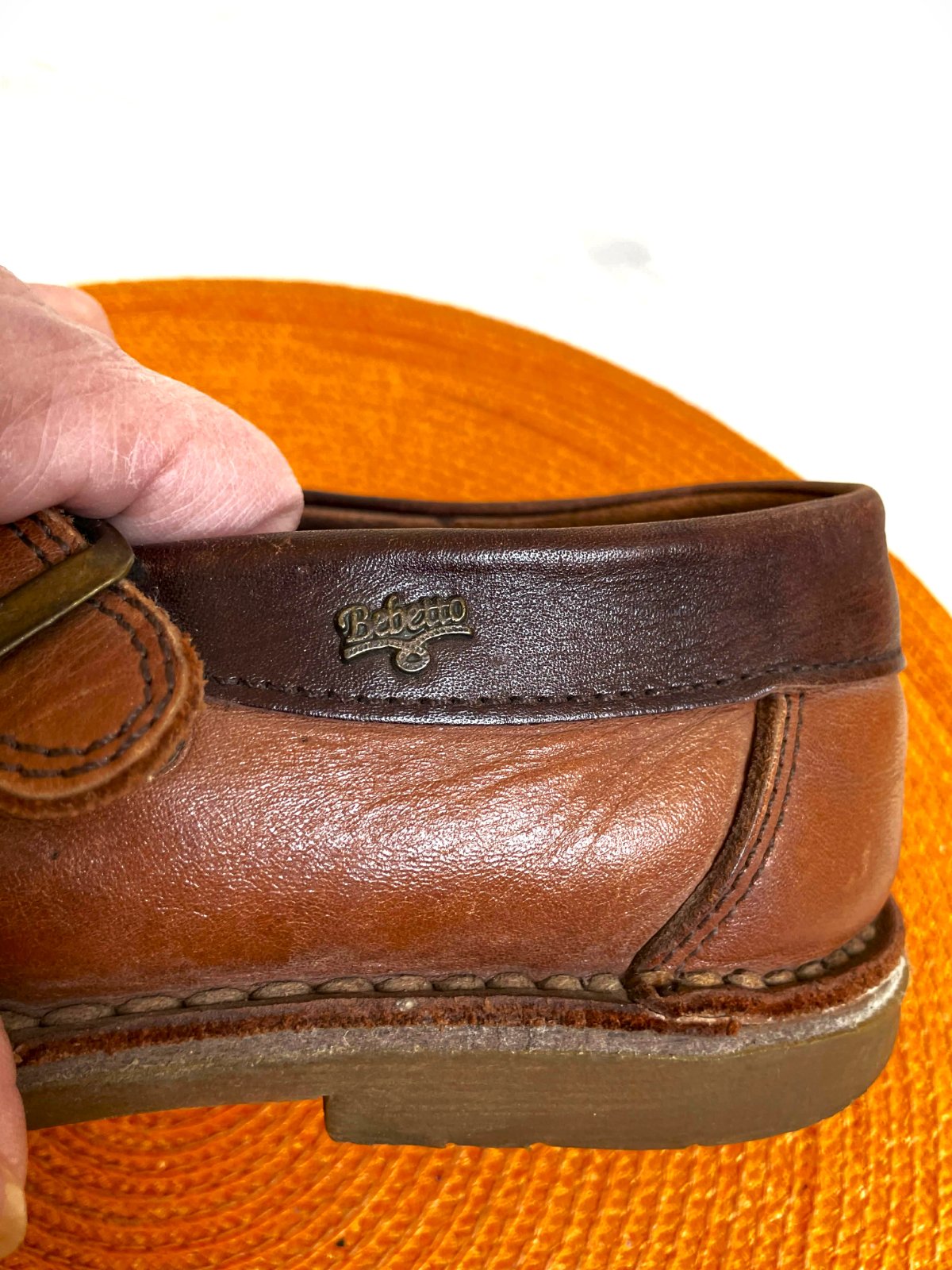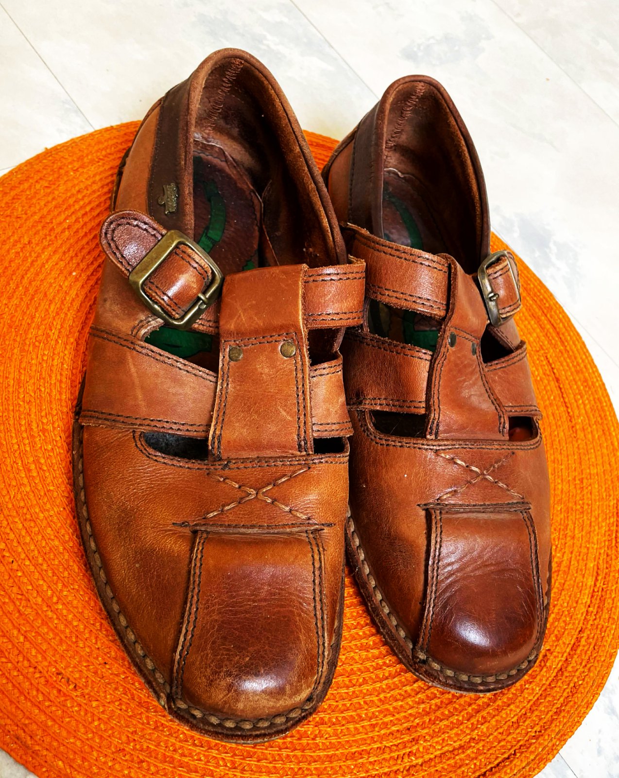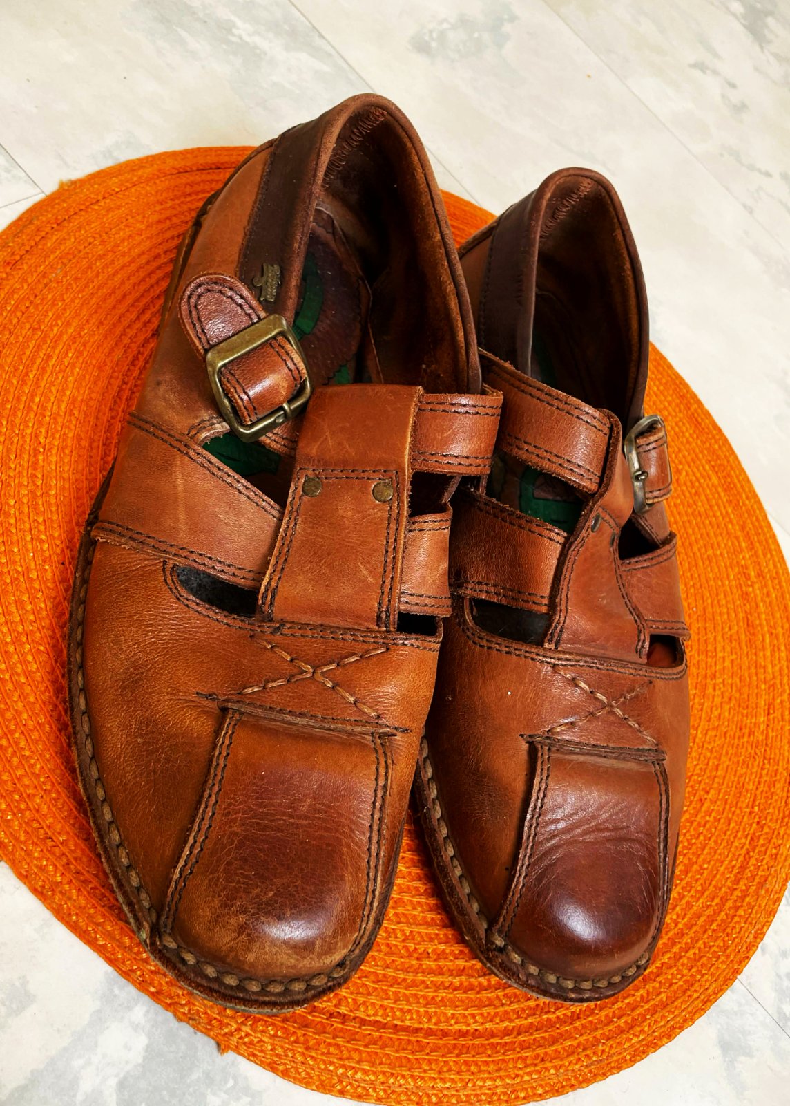 celokožené retro sandále od španielskej značky Bebetto,uzatvorená špička s ozdobným prešívaním v tvare kríža a zapínanie na kovovú pracku,veľmi mäkké a ľahúčke,krásne vypracované, uvedená veľkosť č. 41- 42,ale rozmer zodpovedá č. 42,krásna nejednoliata prírodná koňaková farba s patinou,vnút. dlžka = 27 cm